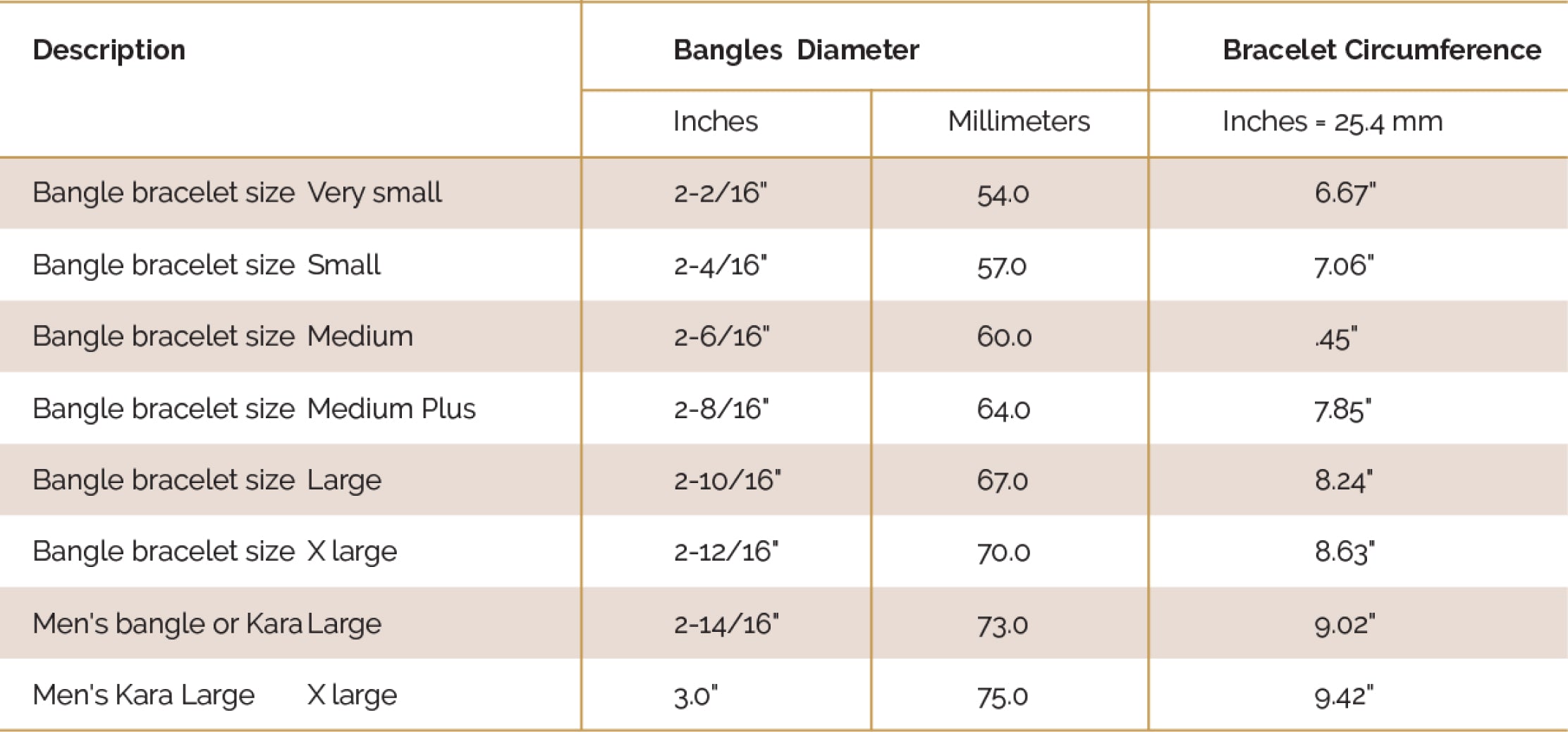 Bangles are a type of jewelry that is distinct and exclusive to the owner. Finding one with the right design and size is part of the experience of owning a valuable, sentimental piece. One must never settle for an ill-fitting bangle, that's why it's important to know what size will fit comfortably and elegantly on one's wrist. When shopping for a bangle, always check the diameter. The diameter is the measure of the distance of between the inner sides of a bangle. Since bangles cannot be opened and laid flat, you cannot use the same bracelet size when shopping this hard jewelry piece but you may convert a bracelet's circumference size to diameters to find your bangle size. Use the measuring table below to find your size.Please note that USA and Indian manufacturers follow this same standard for ring sizes.
