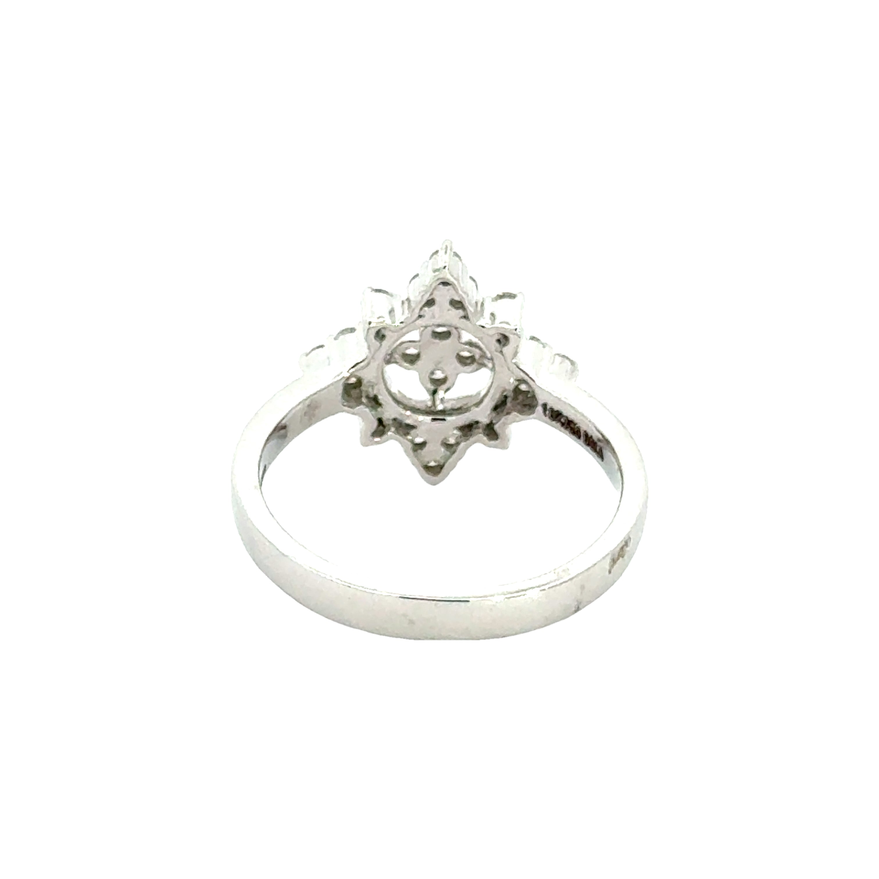 18k White Gold and Diamond Fancy Ring in size 6 measuring 22mm length x 17mm width. Total gold weight is approximately 3.55g.