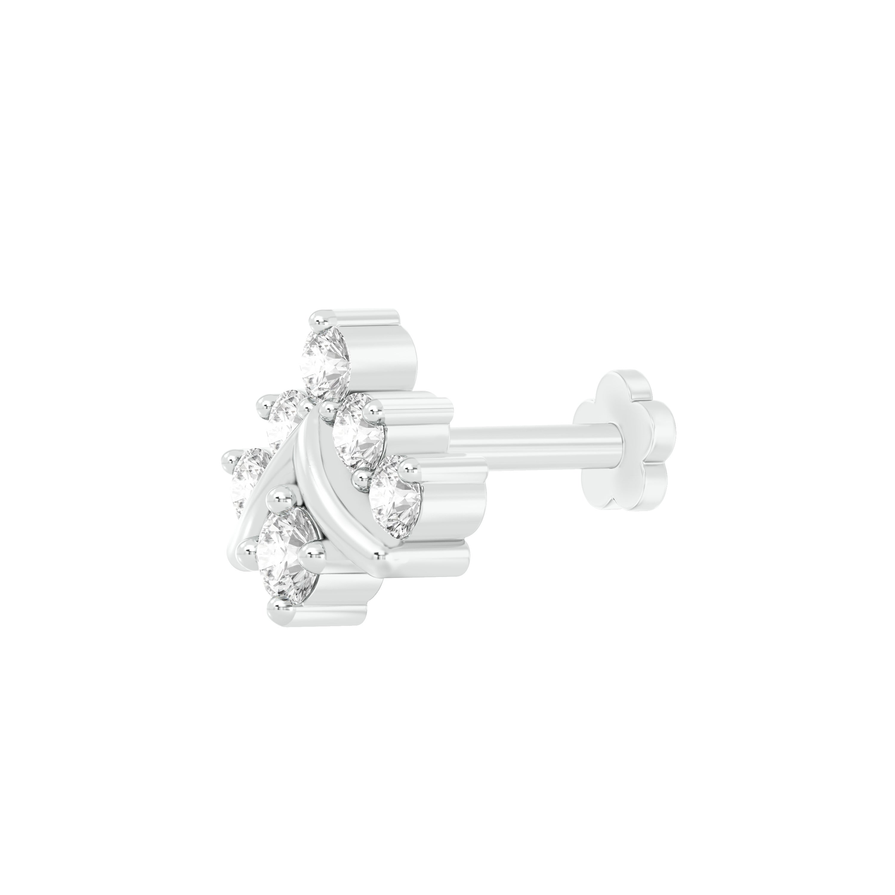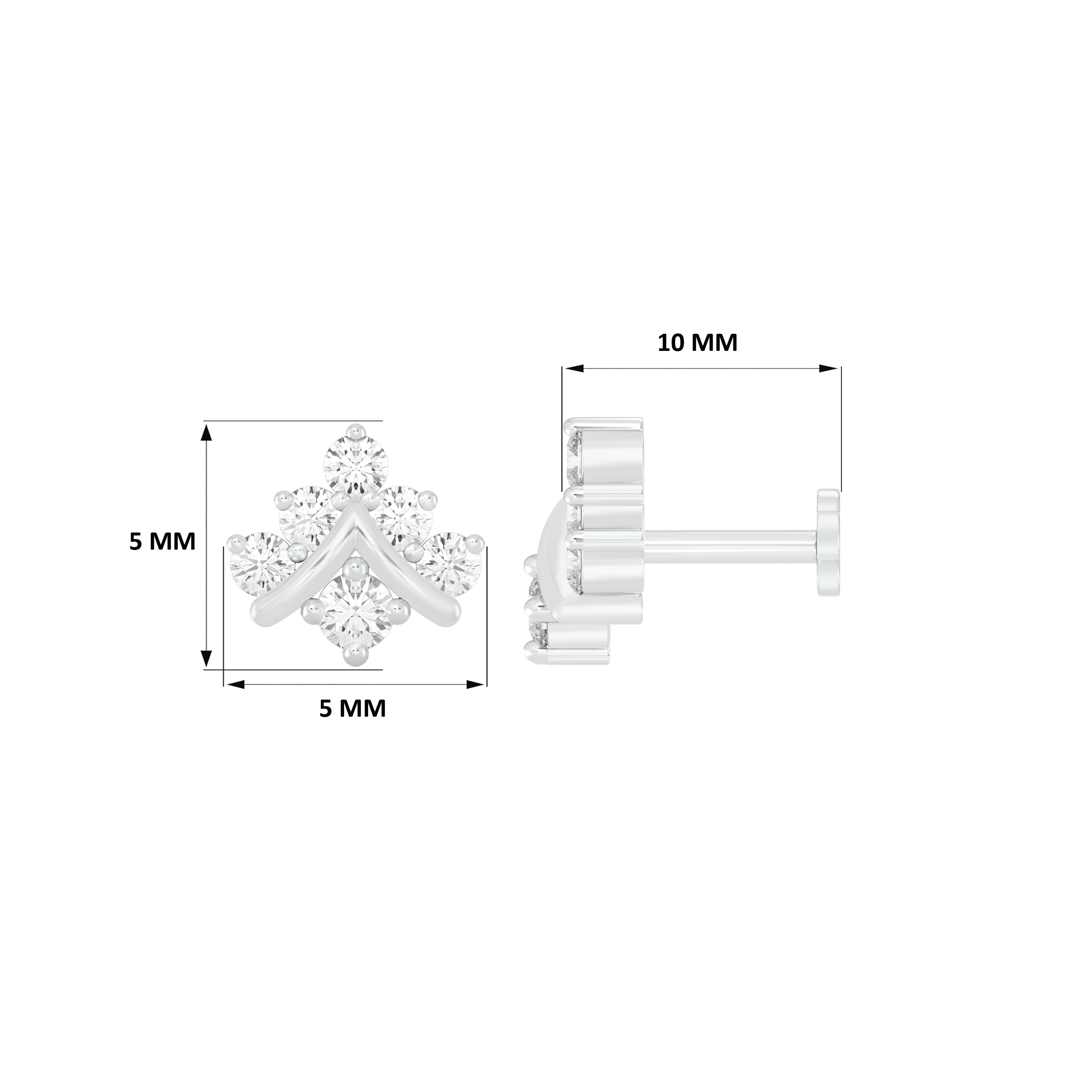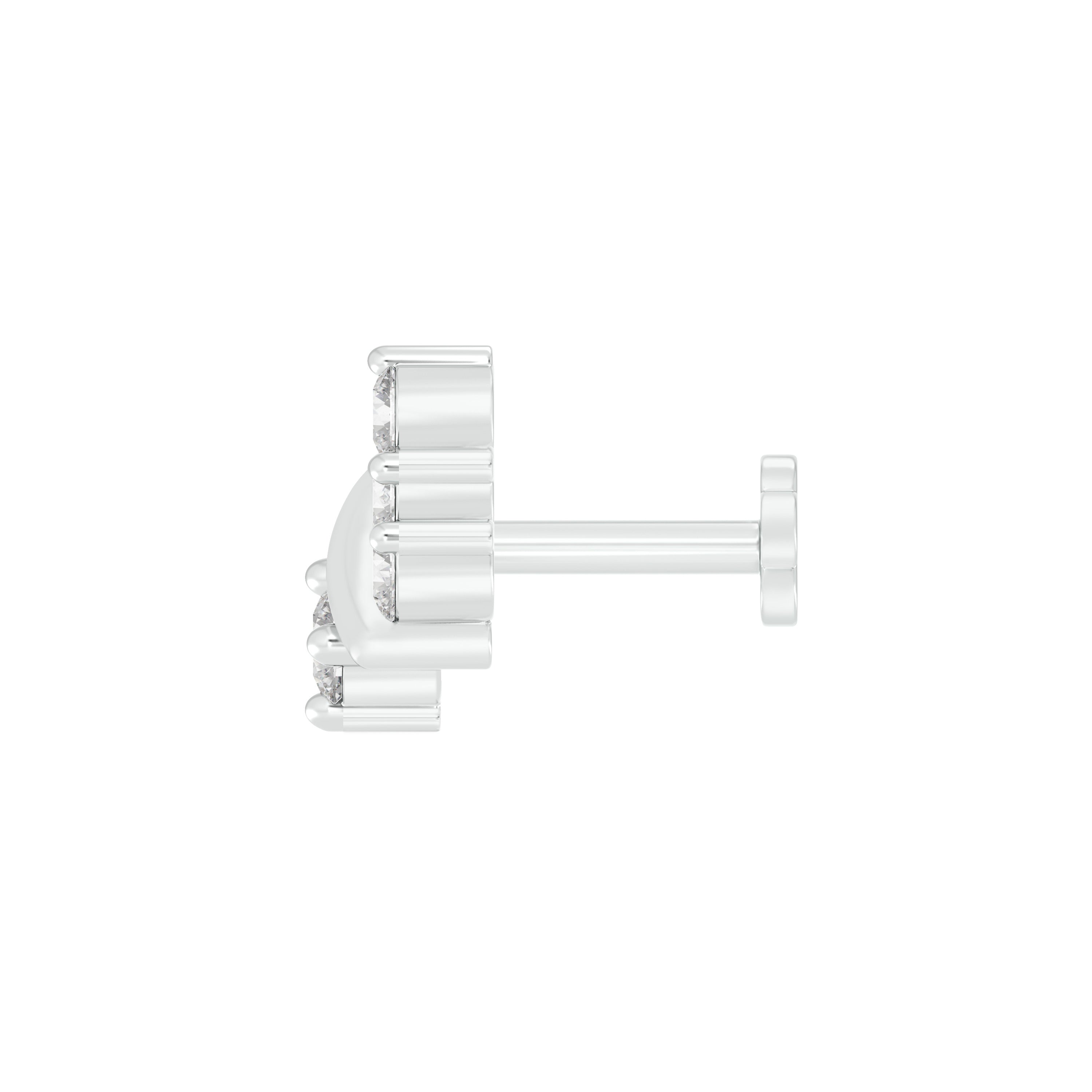 18k White Gold Round Brilliant Cut Stunning Diamond Nose Pin with Screwback measuring 5mm width. For health and safety reasons, nose pins and nose rings CANNOT BE exchanged or returned once purchased.