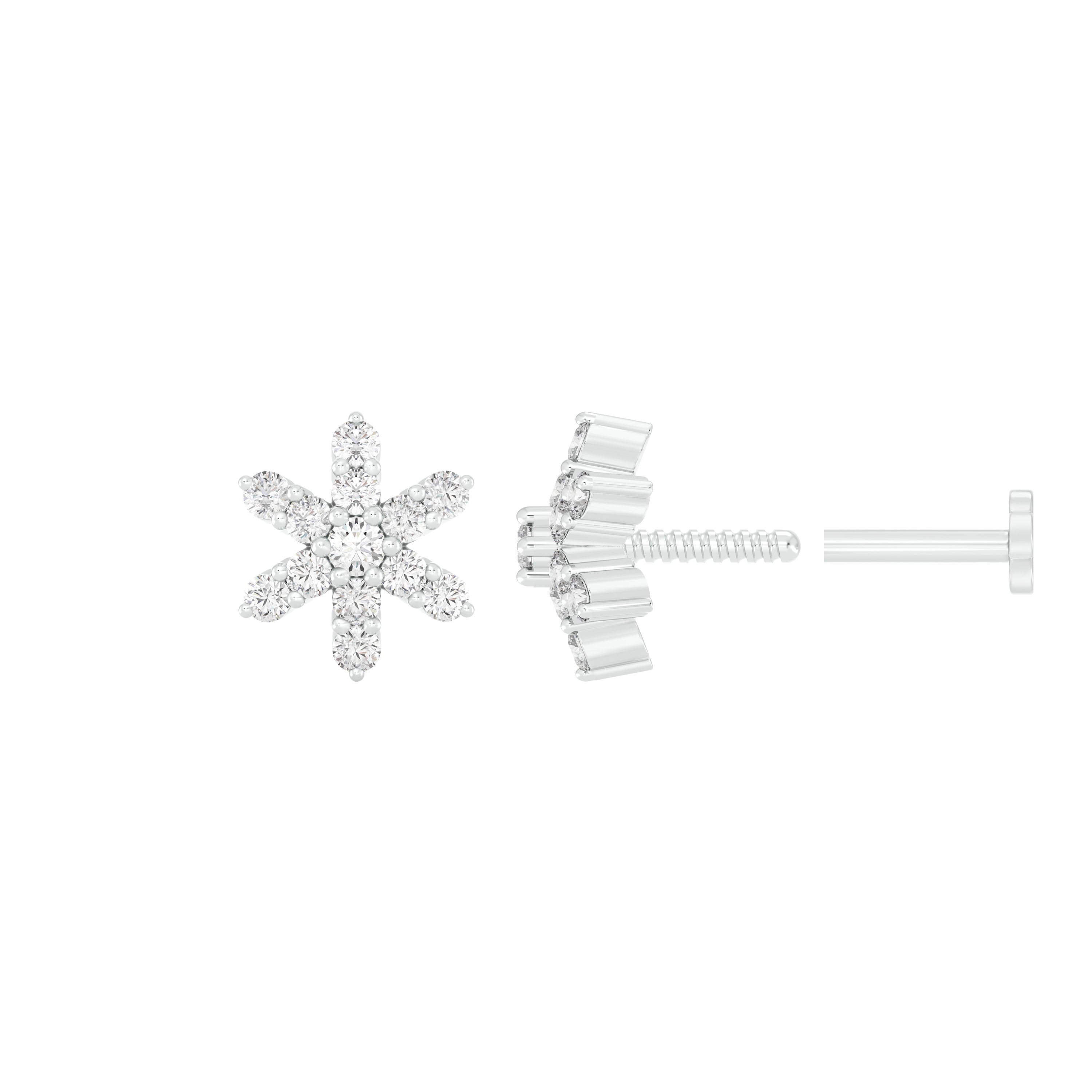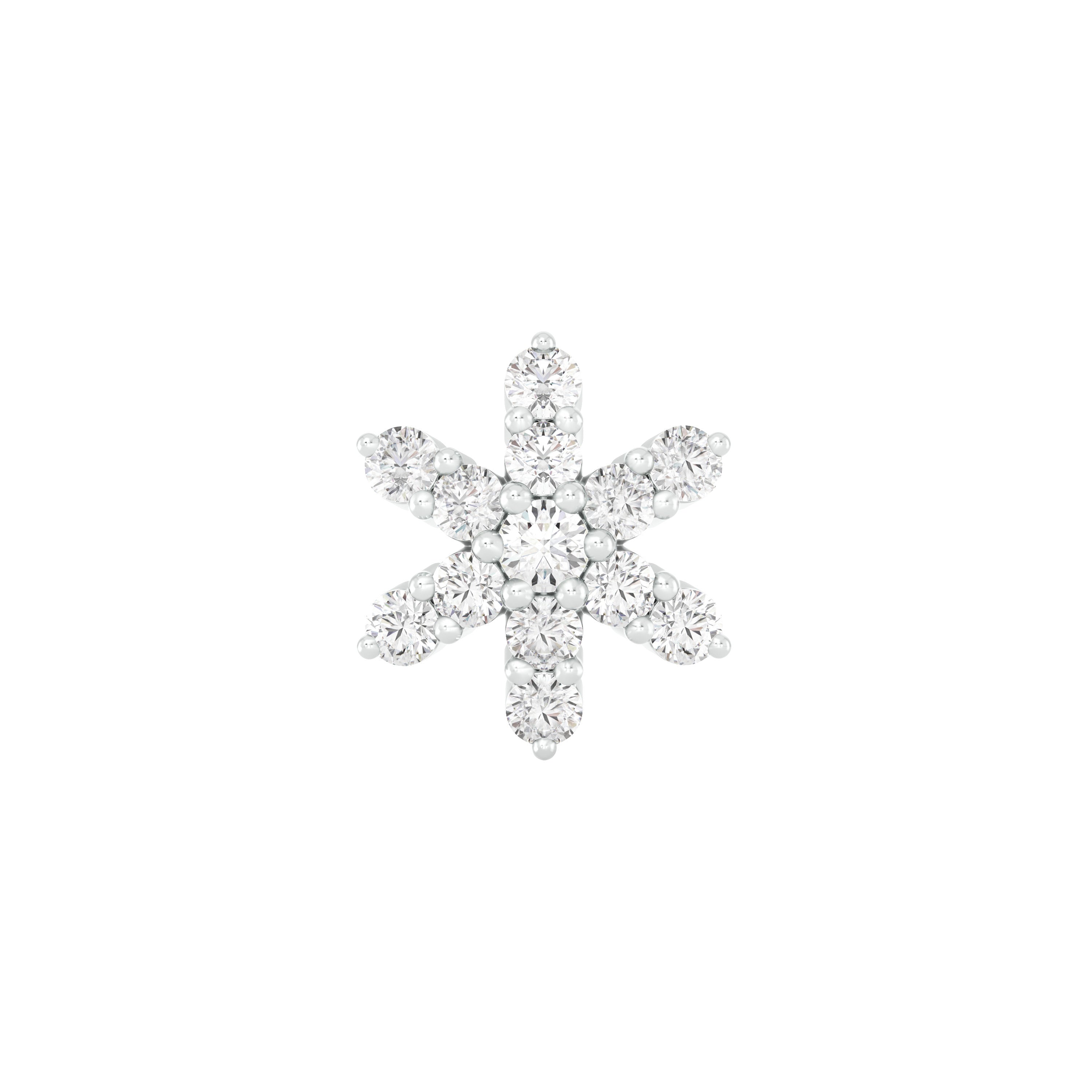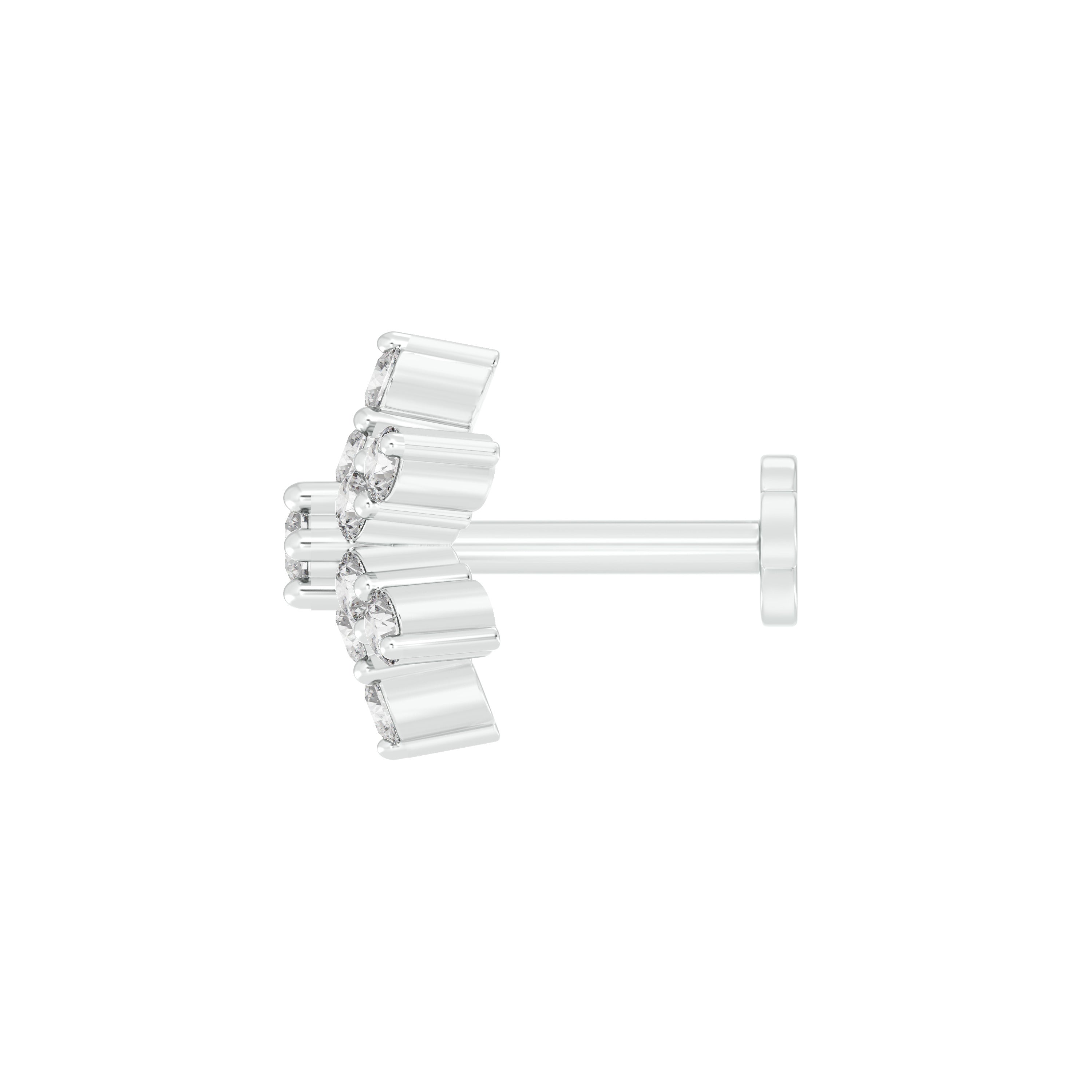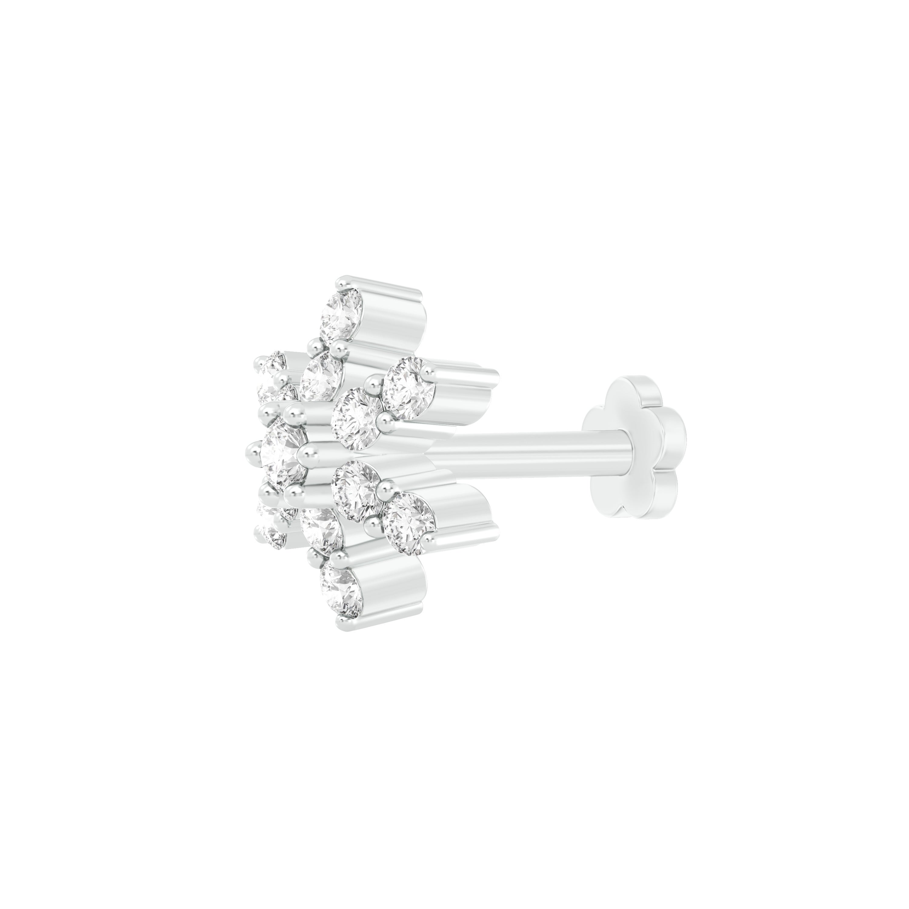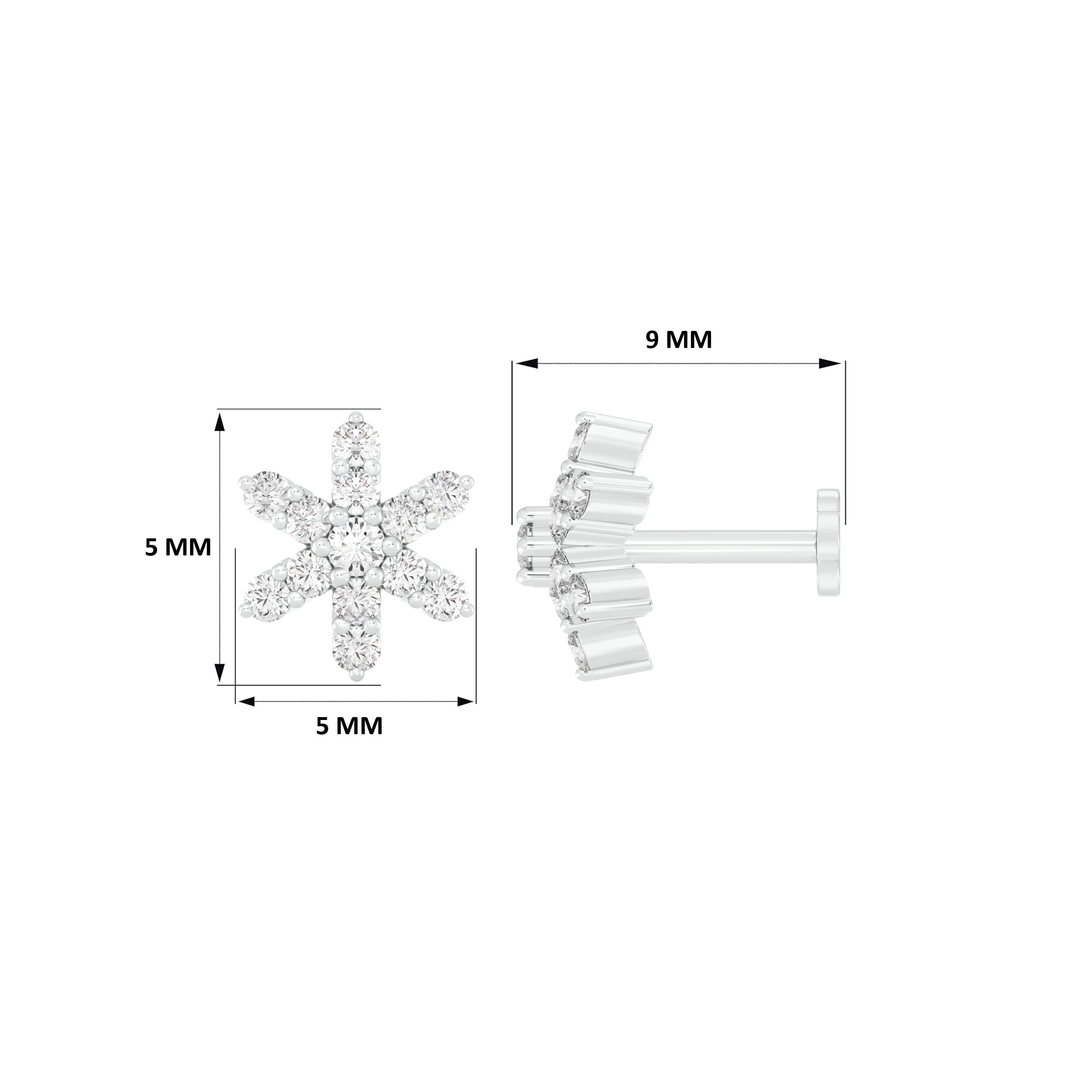 18k White Gold Round Brilliant Cut Graceful Diamond Nose Pin with Screwback measuring 5mm width. For health and safety reasons, nose pins and nose rings CANNOT BE exchanged or returned once purchased.