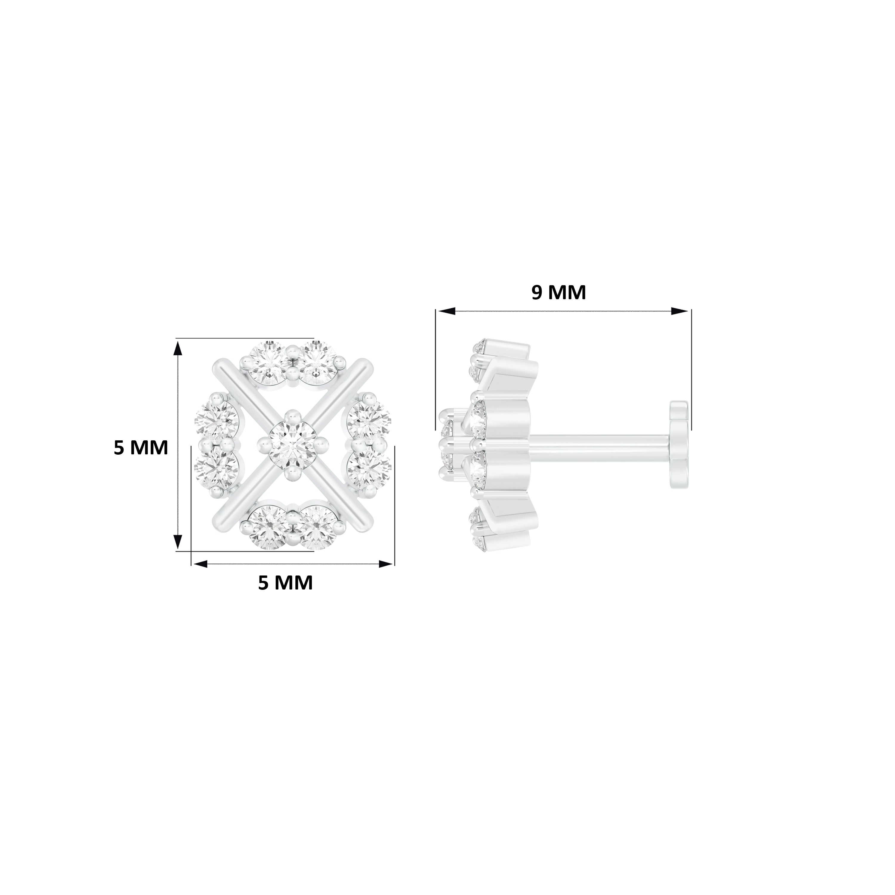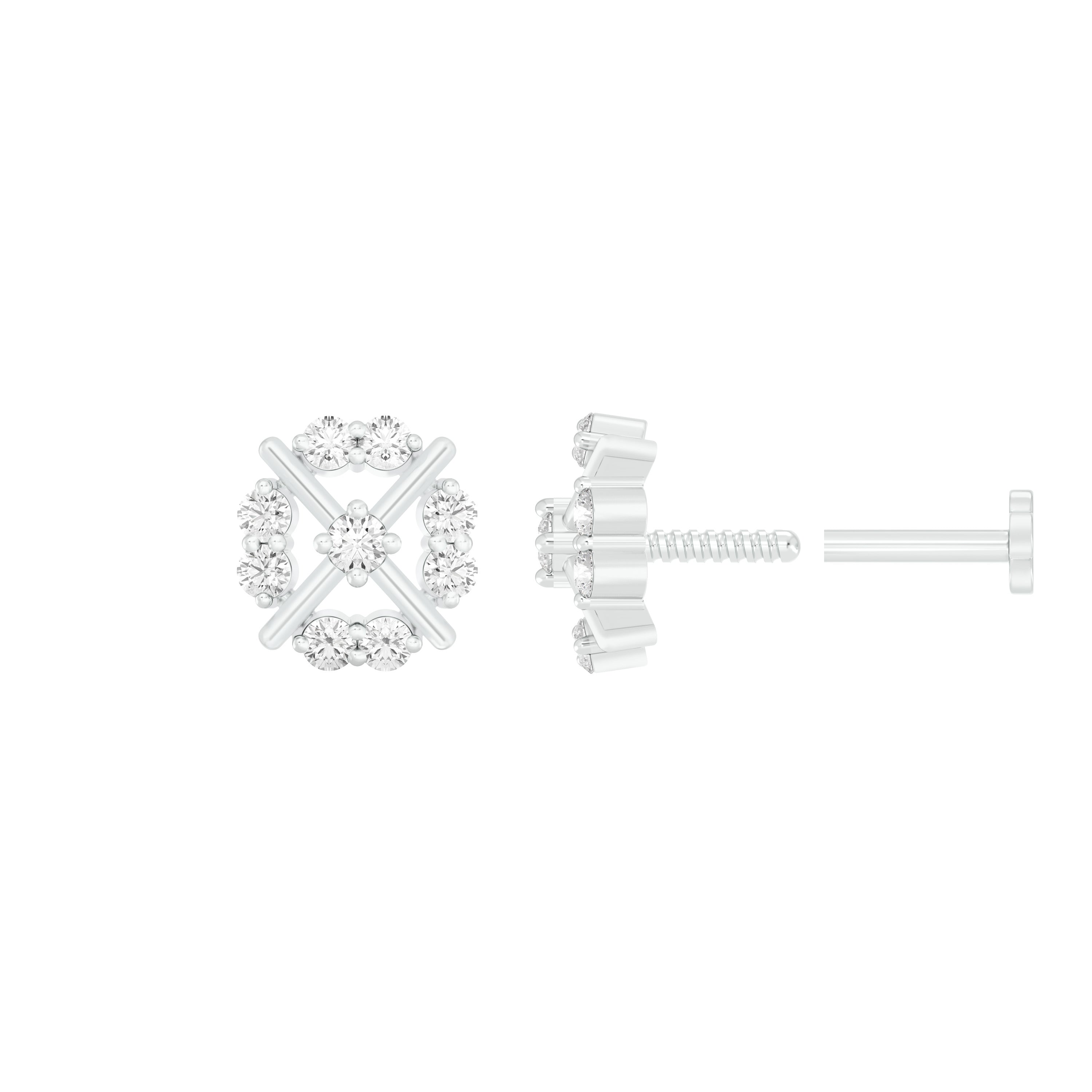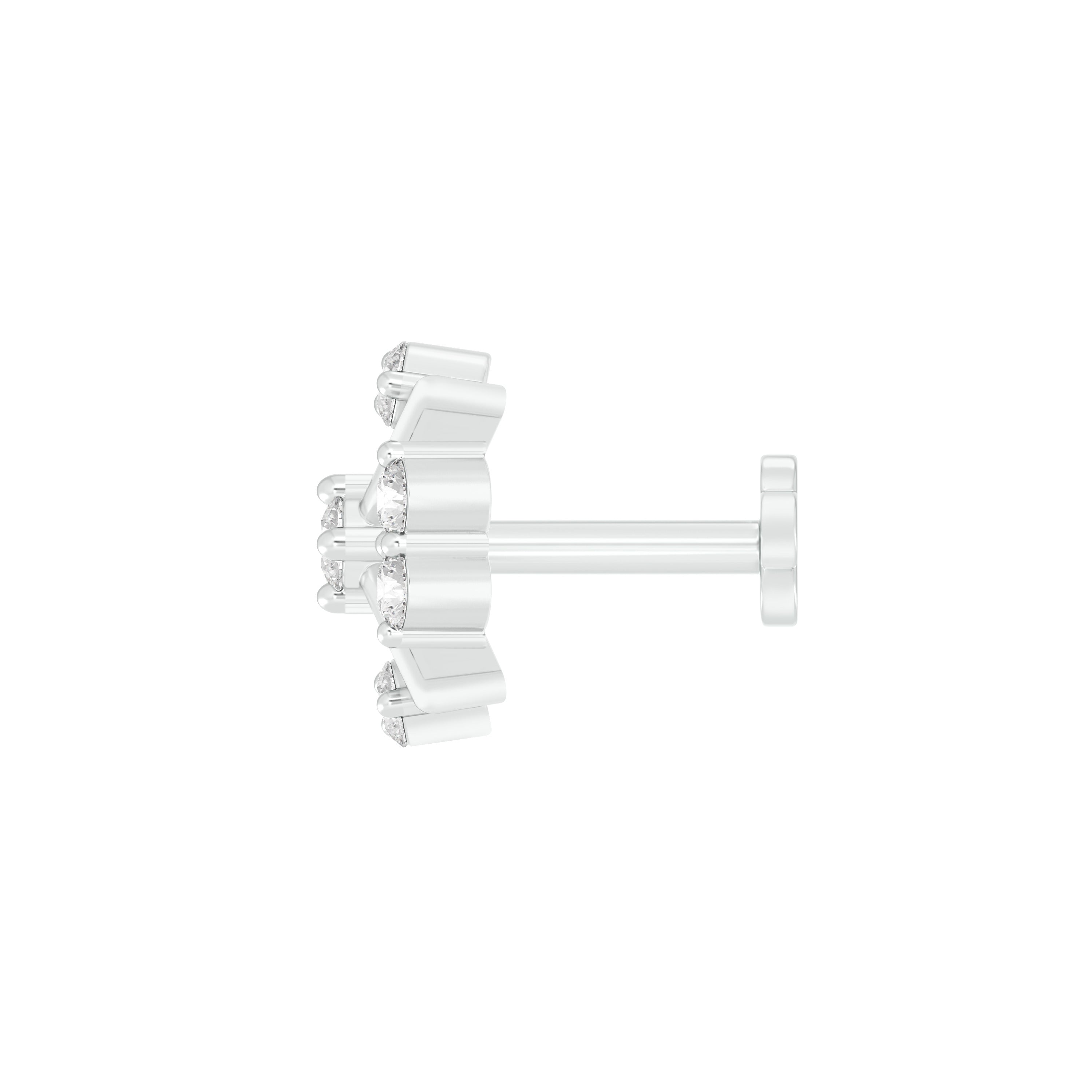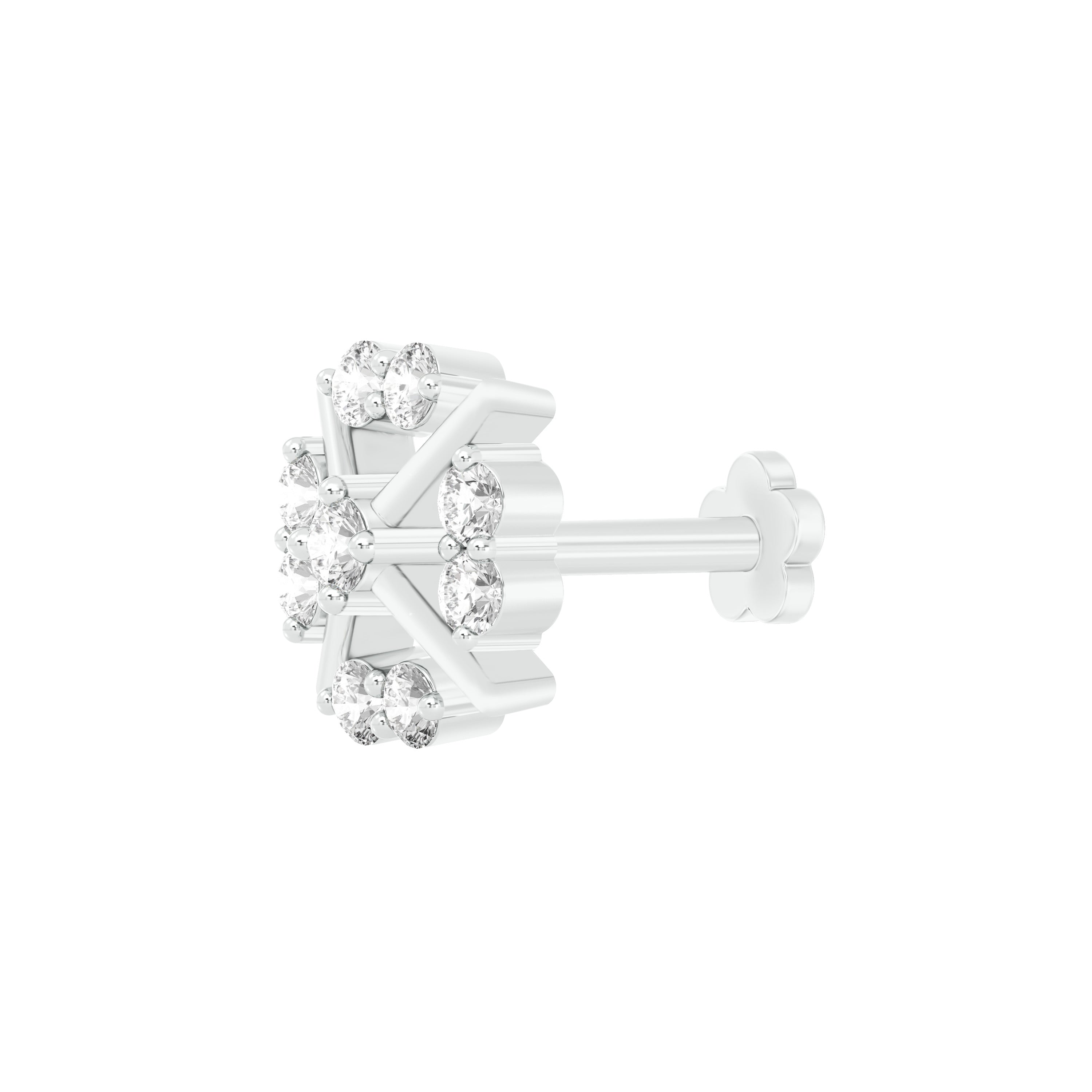 18k White Gold Round Brilliant Cut Intricate Diamond Nose Pin with Screwback measuring 5mm width. For health and safety reasons, nose pins and nose rings CANNOT BE exchanged or returned once purchased.