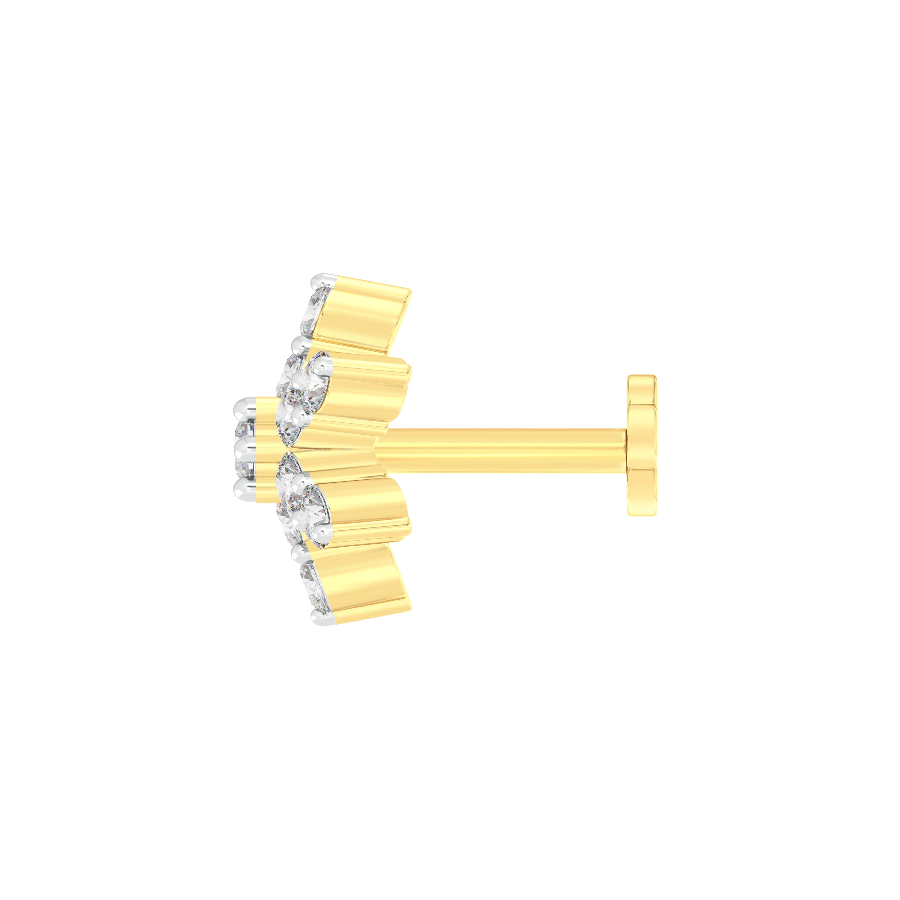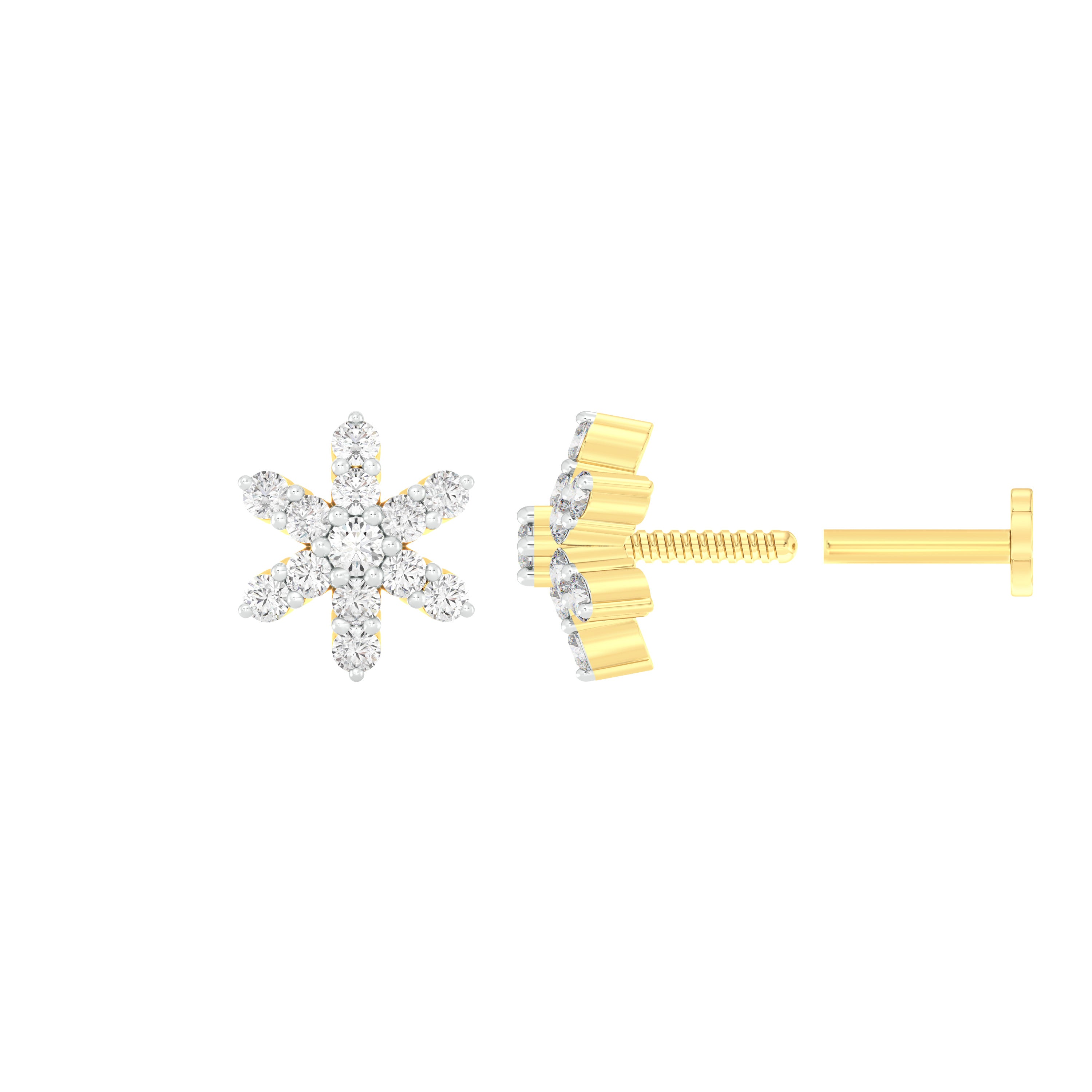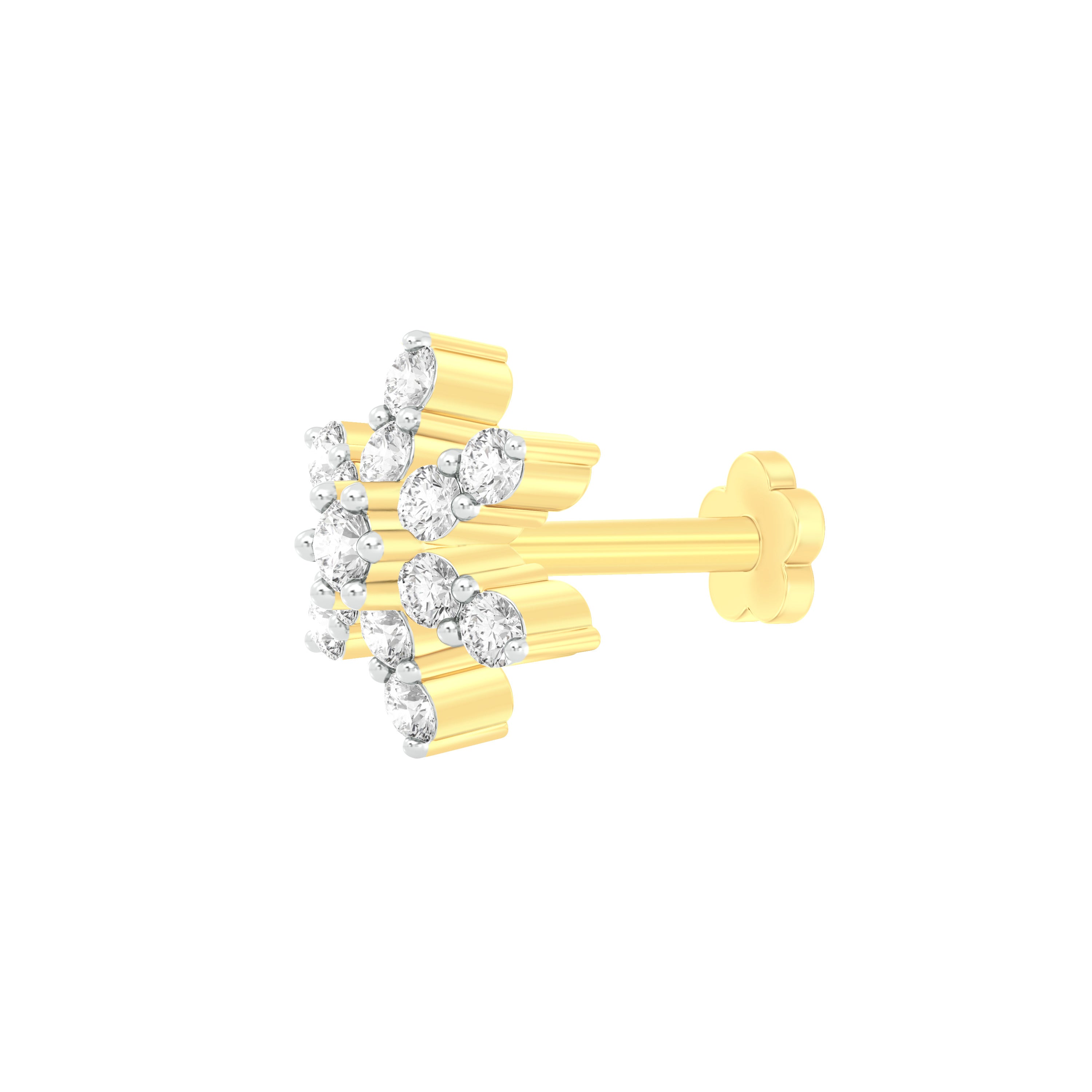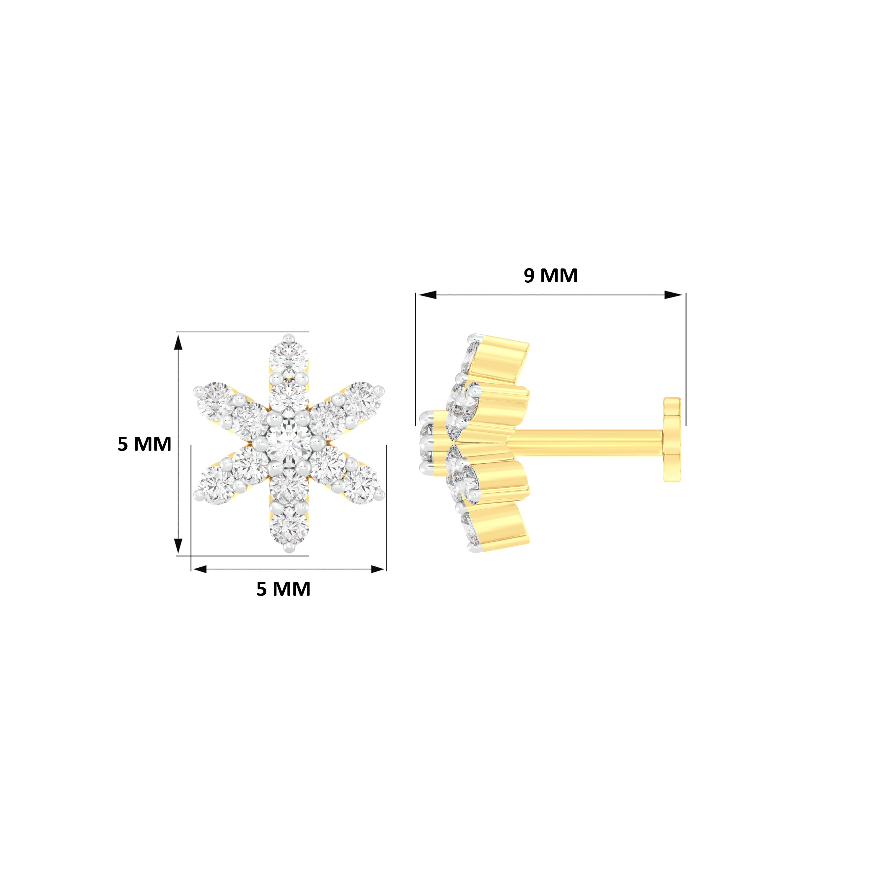 18k Yellow Gold Round Brilliant Cut Elegant Diamond Nose Pin with Screwback measuring 5mm width. For health and safety reasons, nose pins and nose rings CANNOT BE exchanged or returned once purchased.