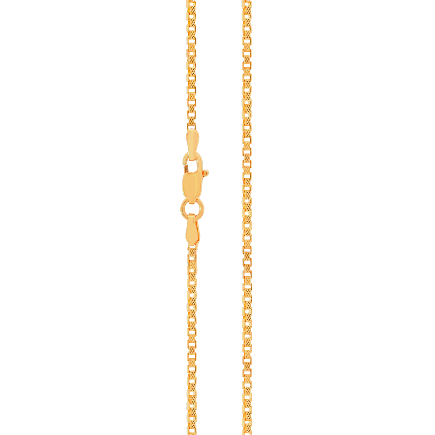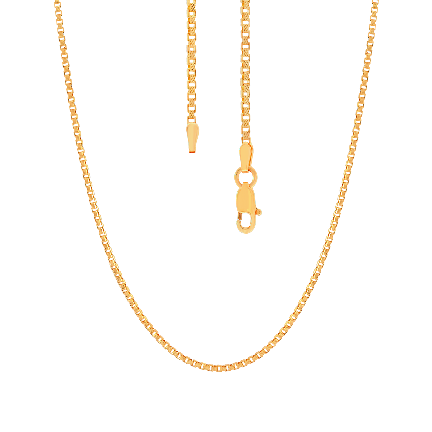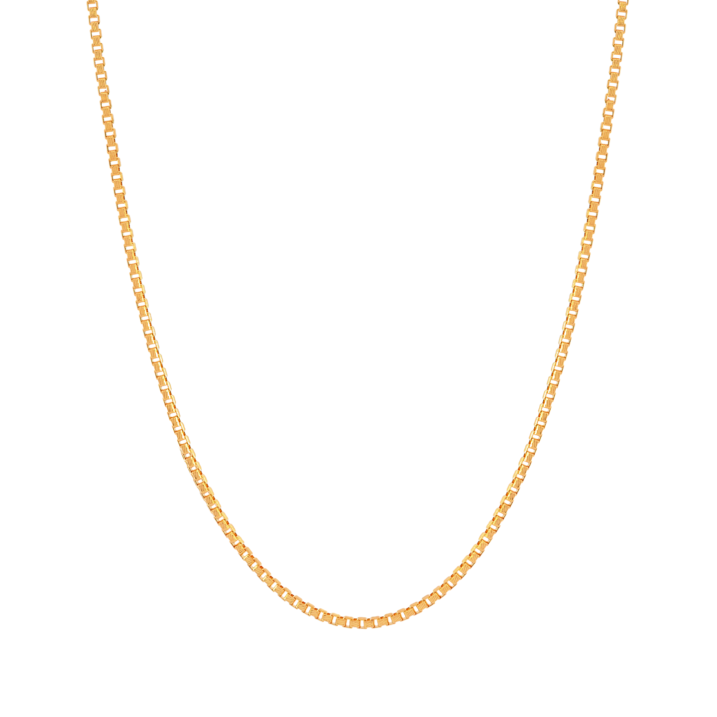 22k gold box chain in 20 inches. Solid gold chain with classic box design. Chain measures 1.5mm in thickness and features secure lobster clasp closure.