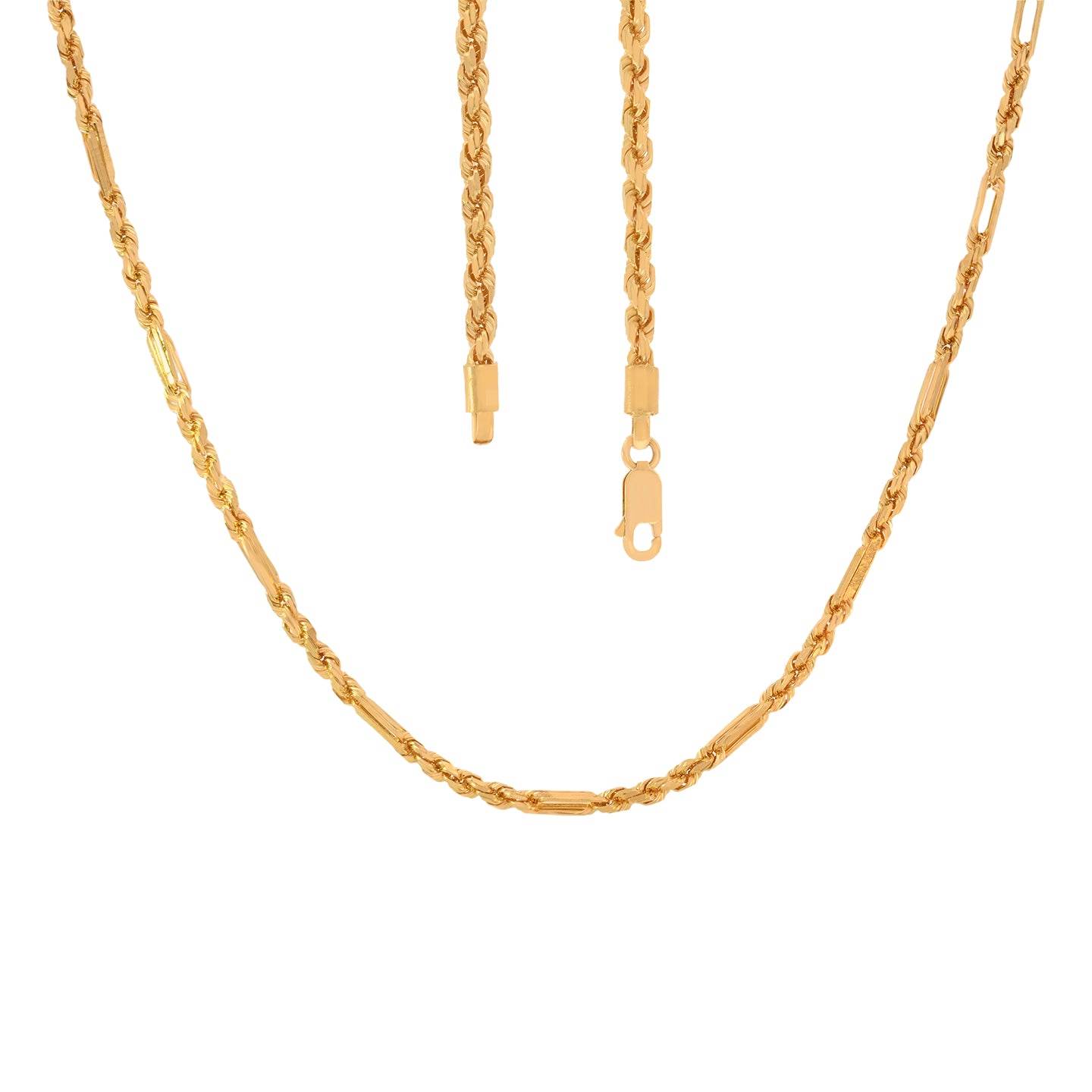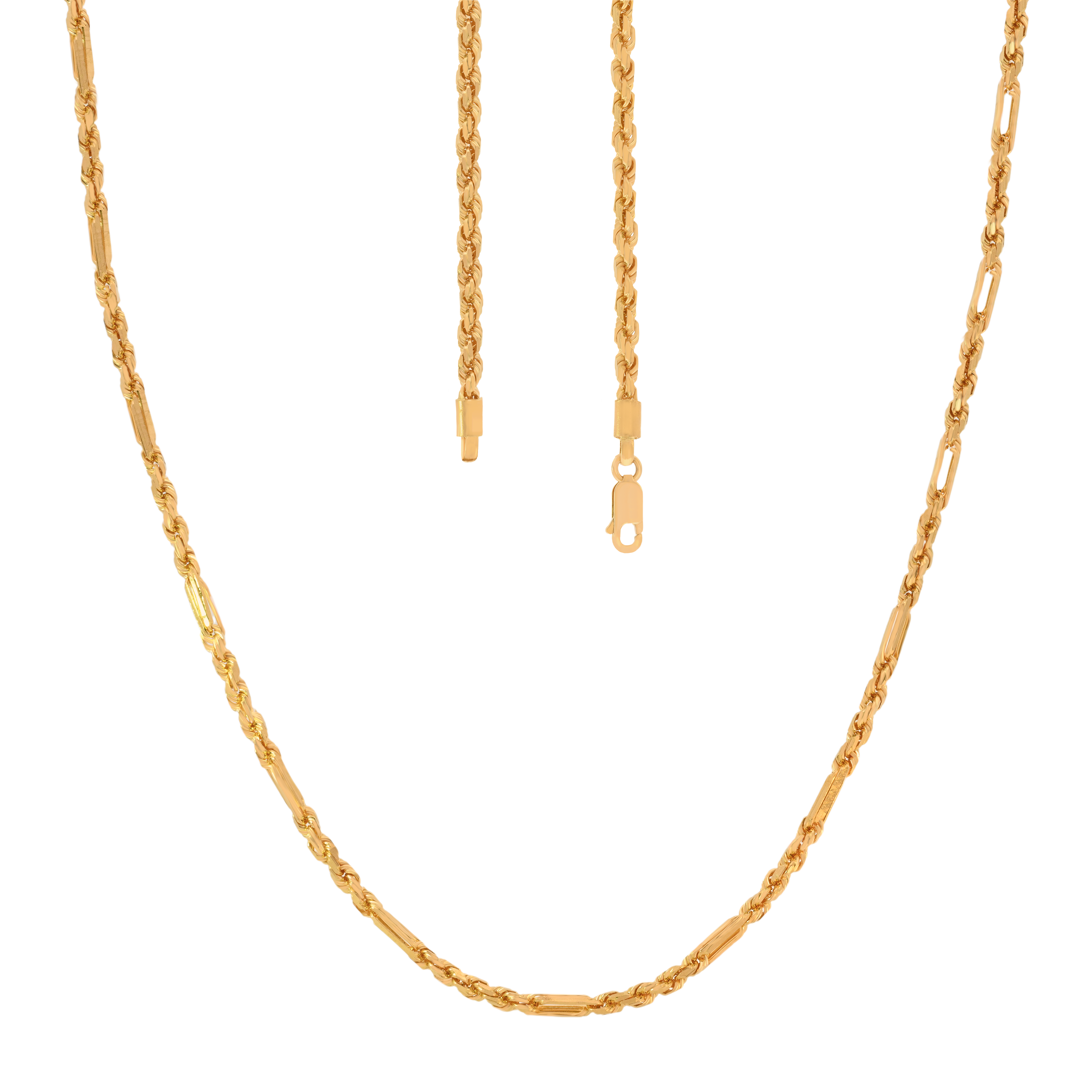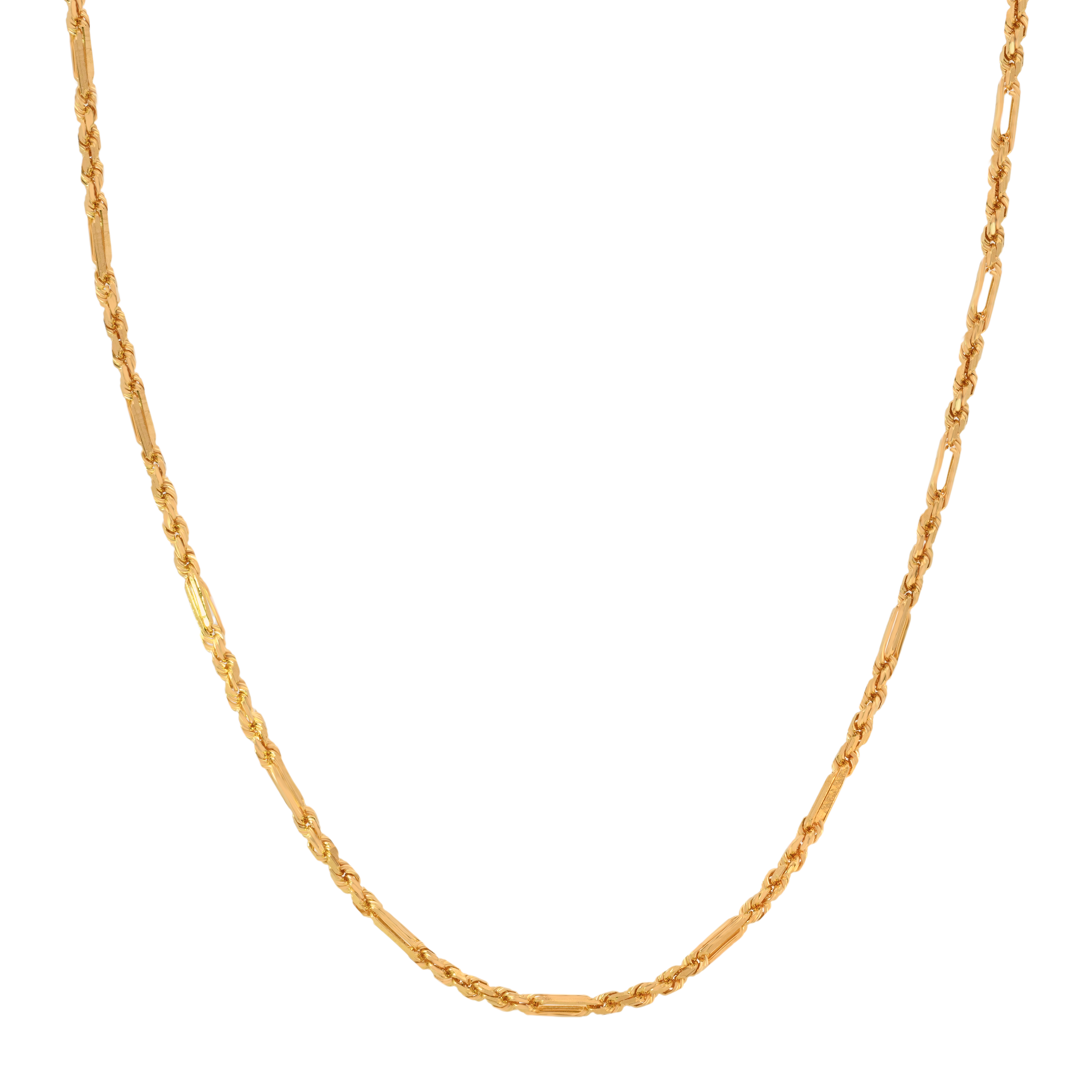 22k gold figaro chain in 26 inches. Solid gold chain with impressive figaro design. Chain measures 3.5mm in thickness and features secure lobster clasp closure.