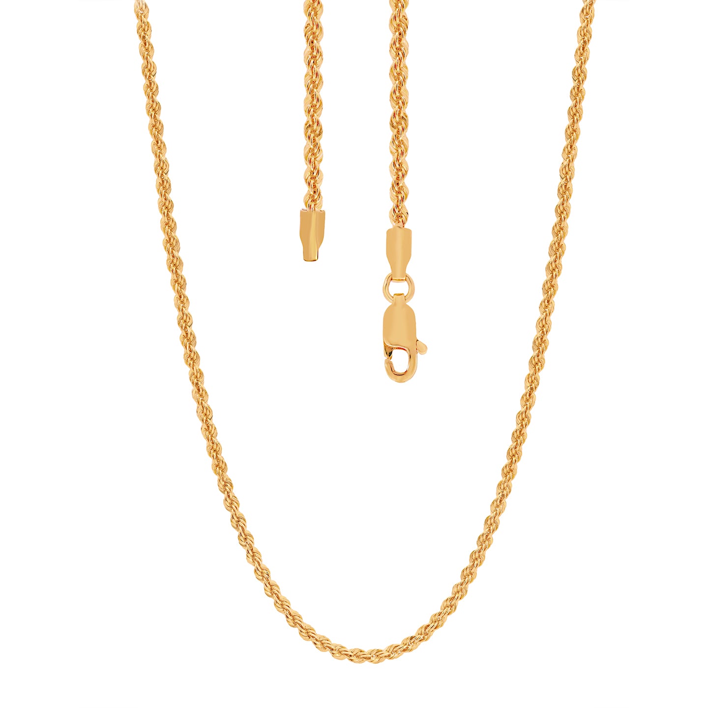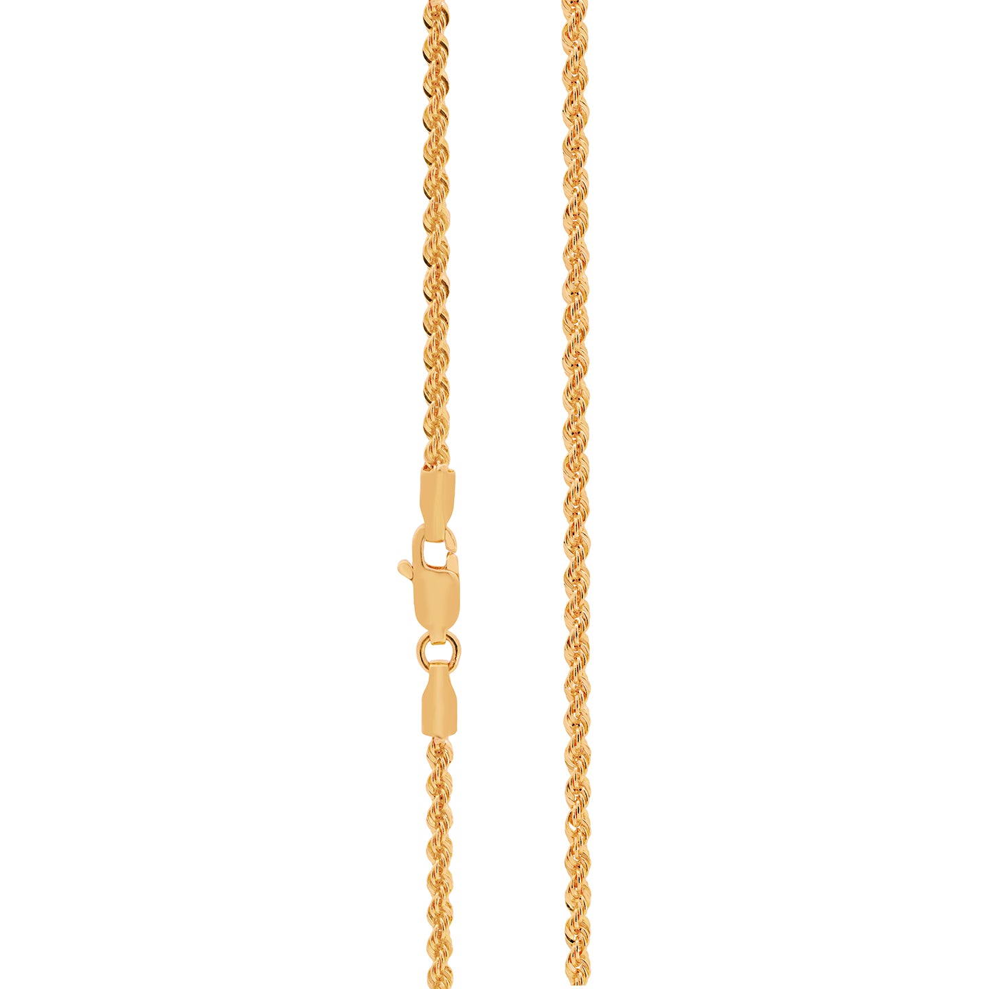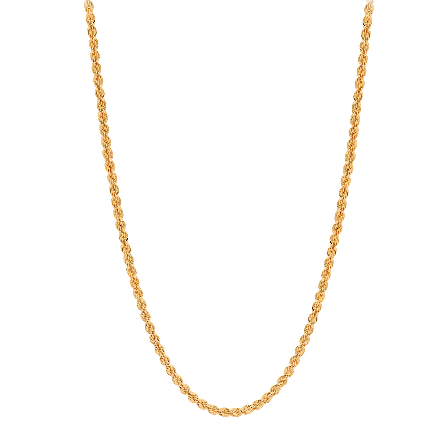 22k gold solid rope chain measuring 30 inches in length and 2mm in thickness. This rope chain features bold twisted design and S hook closure.