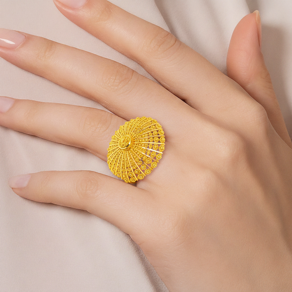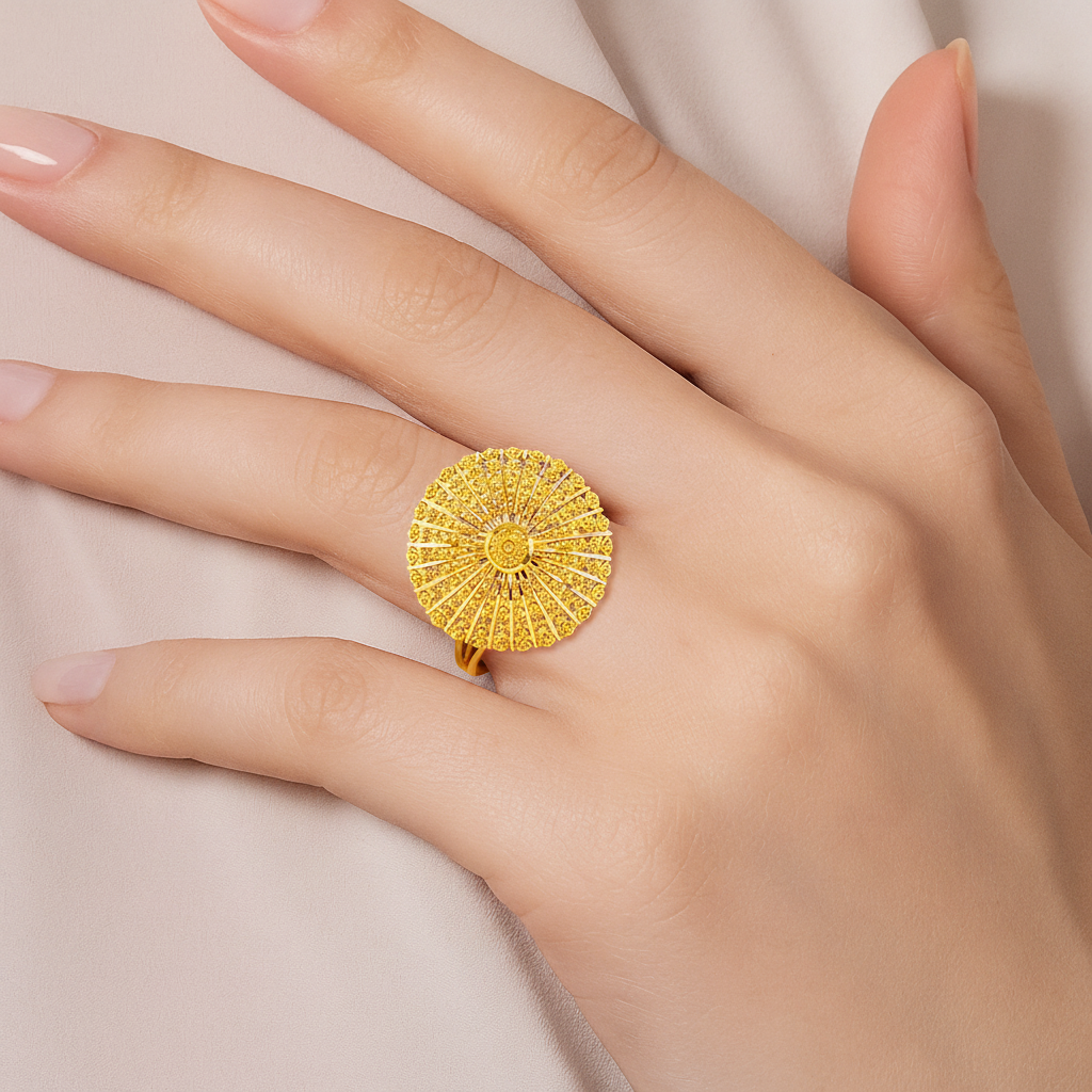 22k gold adjustable ring with filigree button design. Ring band is adjustable from size 5 to 6.5. Main ring diameter measures 27mm in diameter.