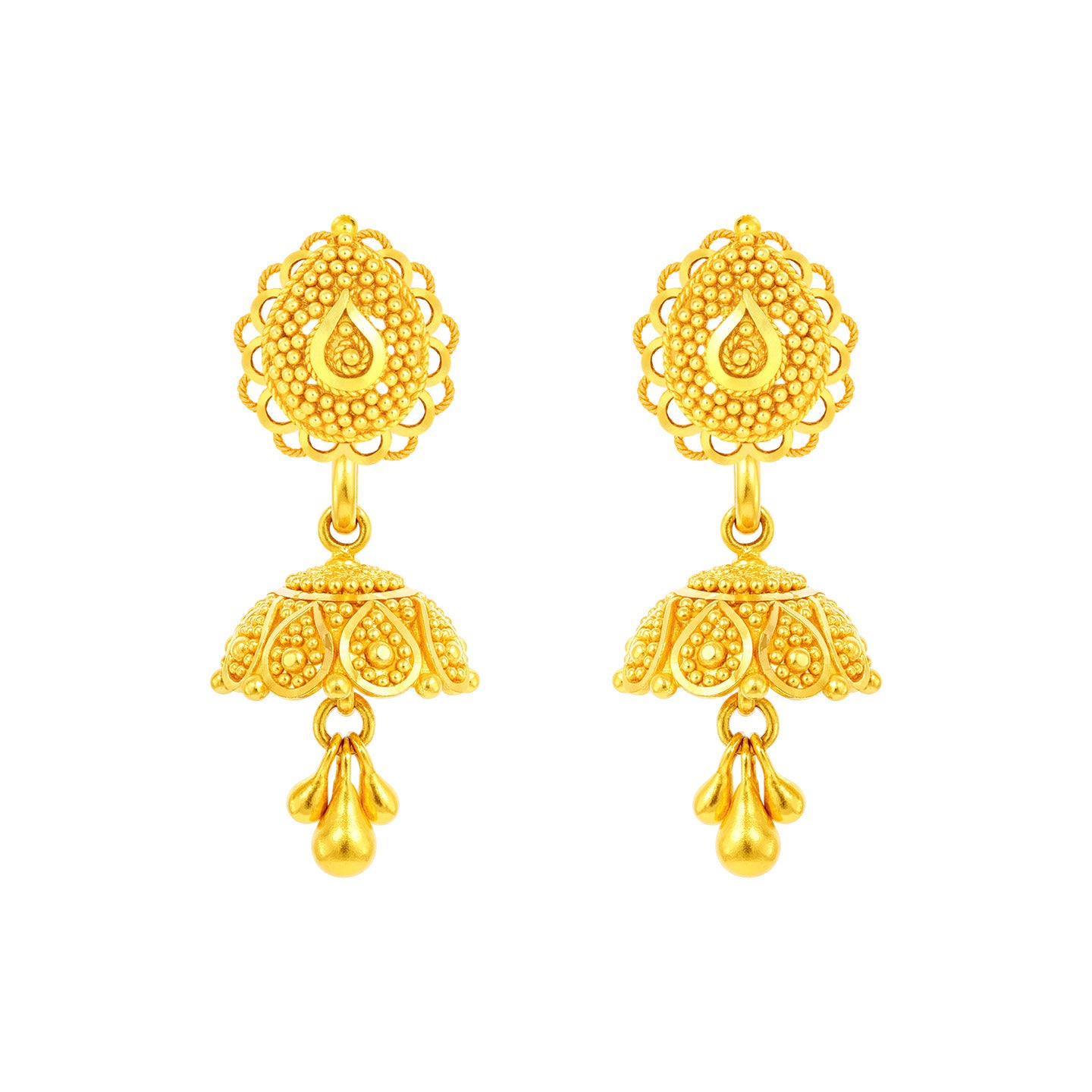 22k jhumka screwback earrings with repeated mango designs with dangling ball charms. The earrings measure 31mm long and 13mm at widest point.