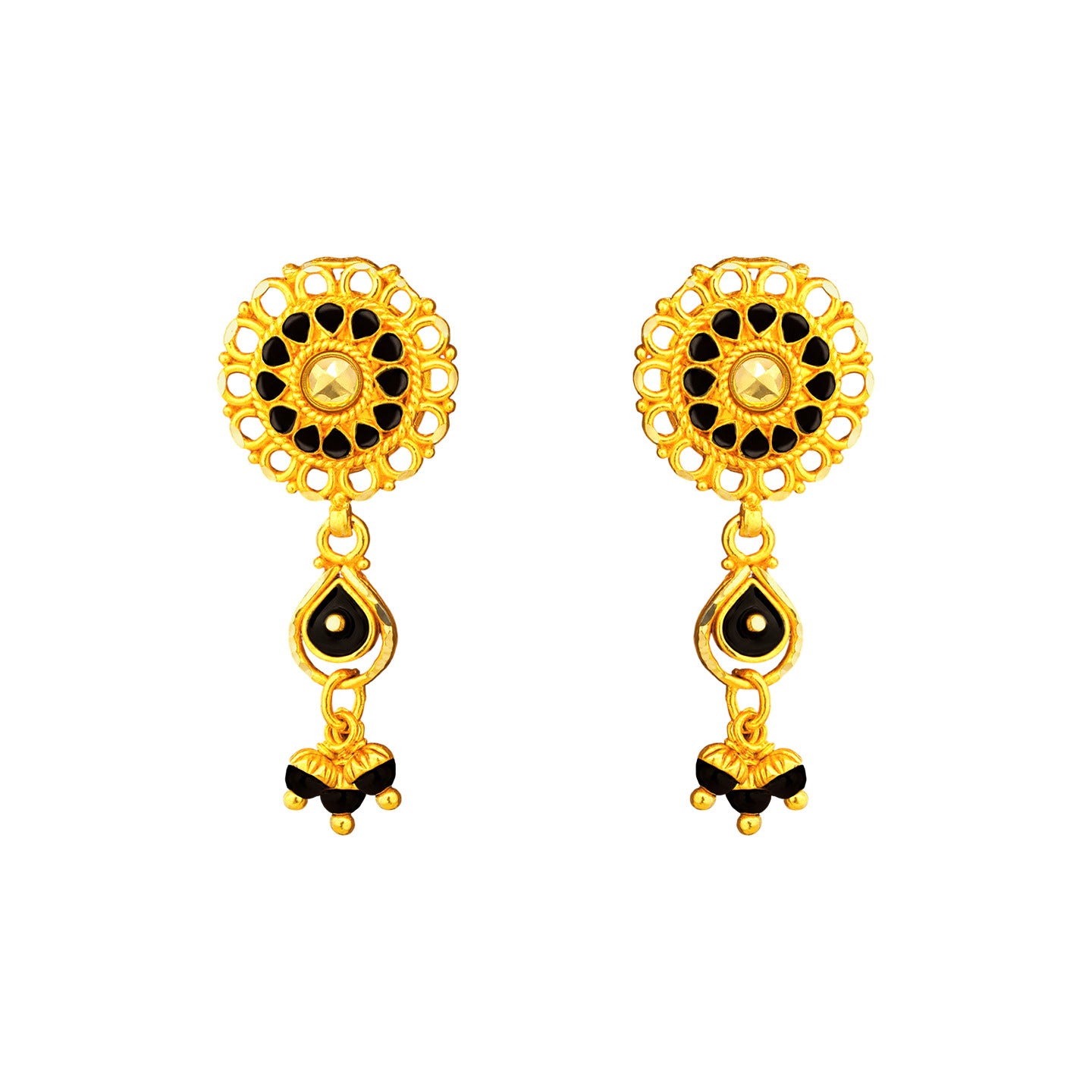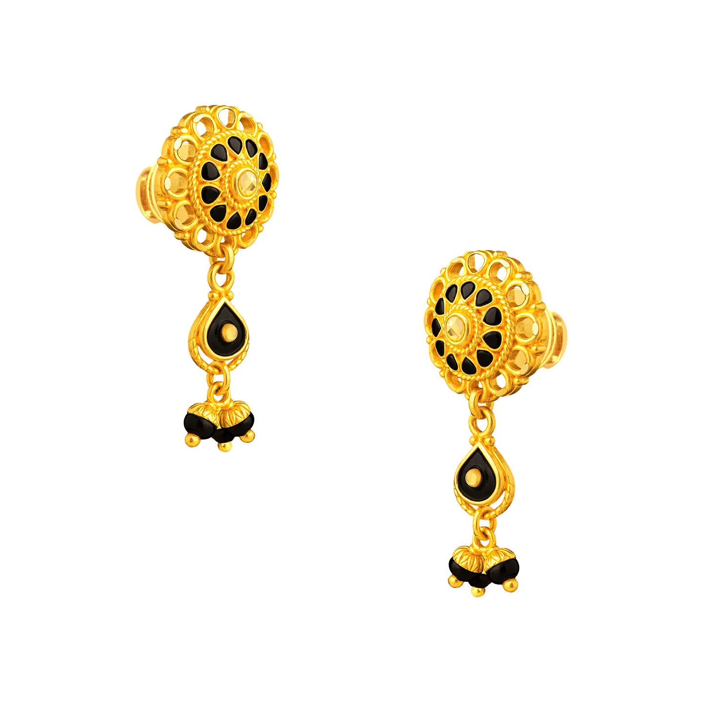 22k dangling screwback earrings. The earrings measure 25mm long and 10mm at widest point. Earrings feature black bead designs and dangling beads.