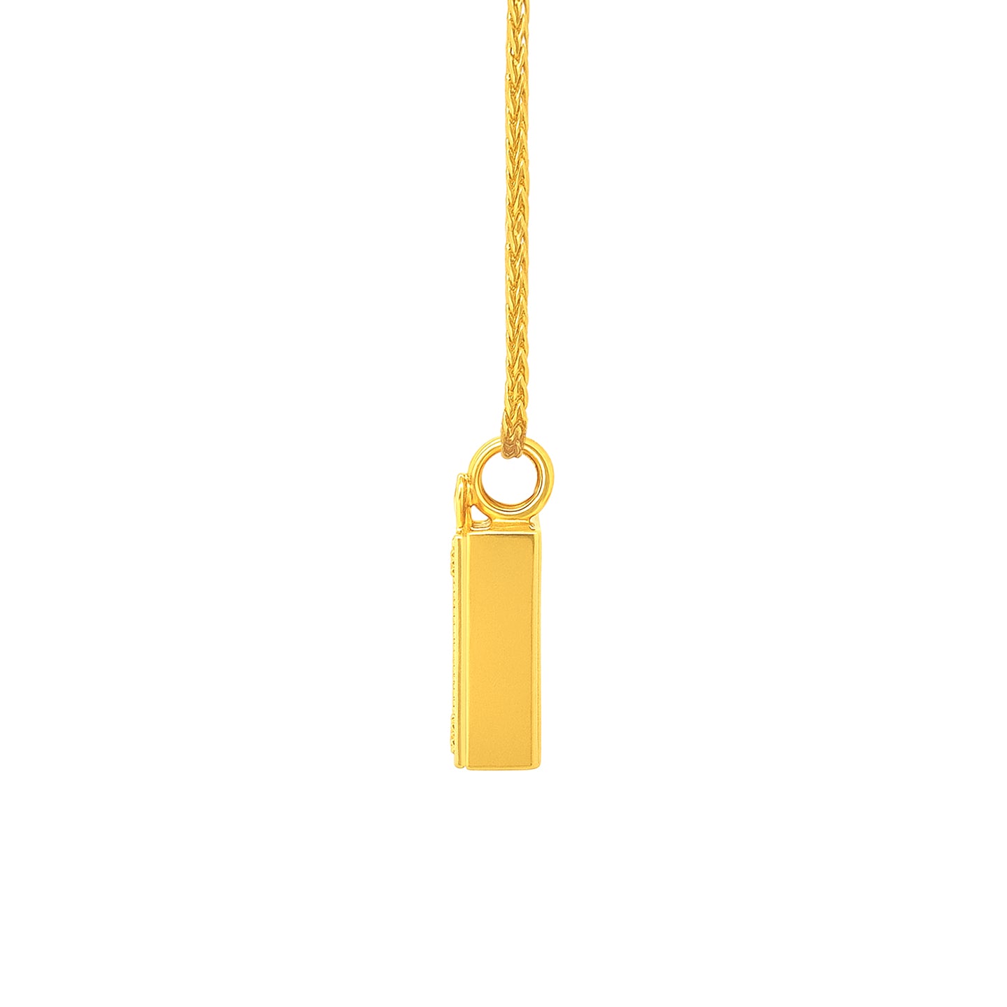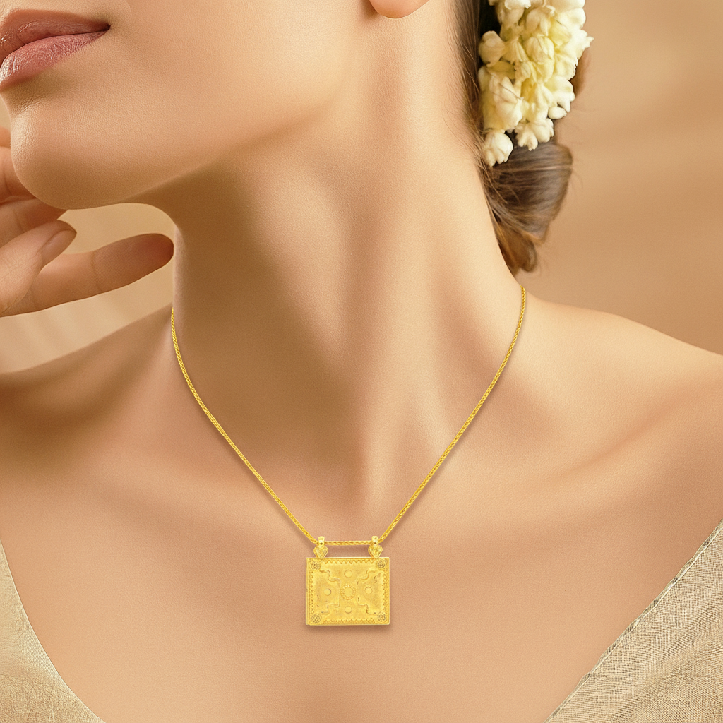22k gold taweez locket in box style. Pendant measures 22mm long and 20mm in width. Inside is hollow to keep treasured items. Bale can fit a 1 or 2mm chain. Pendant only, chain not included.