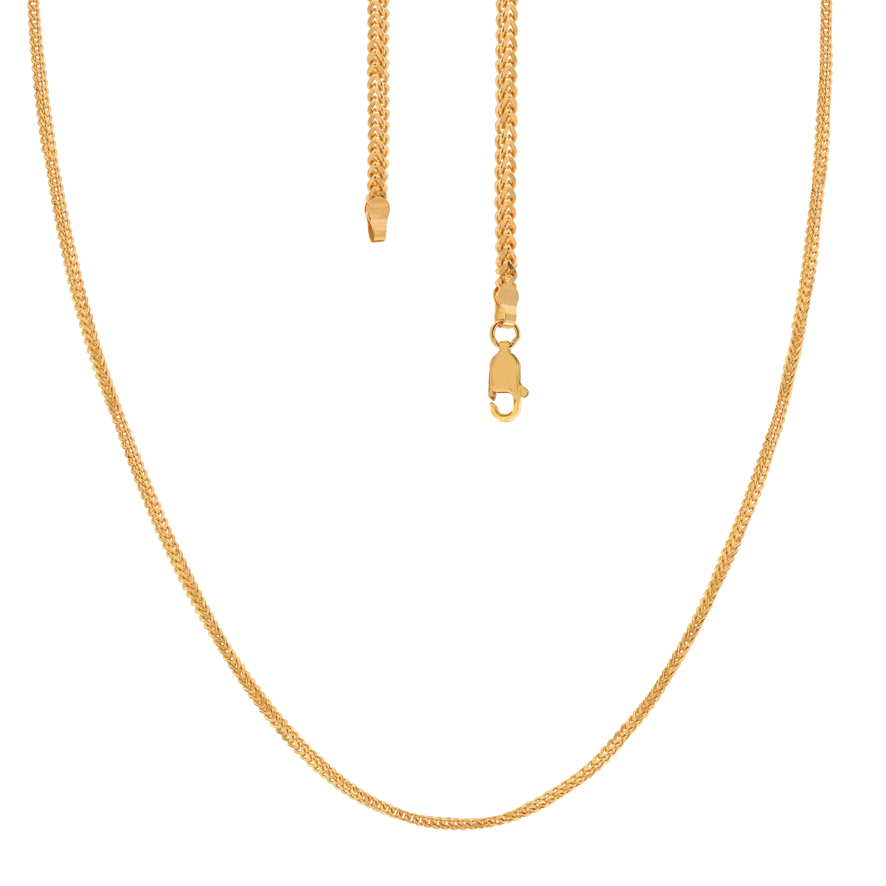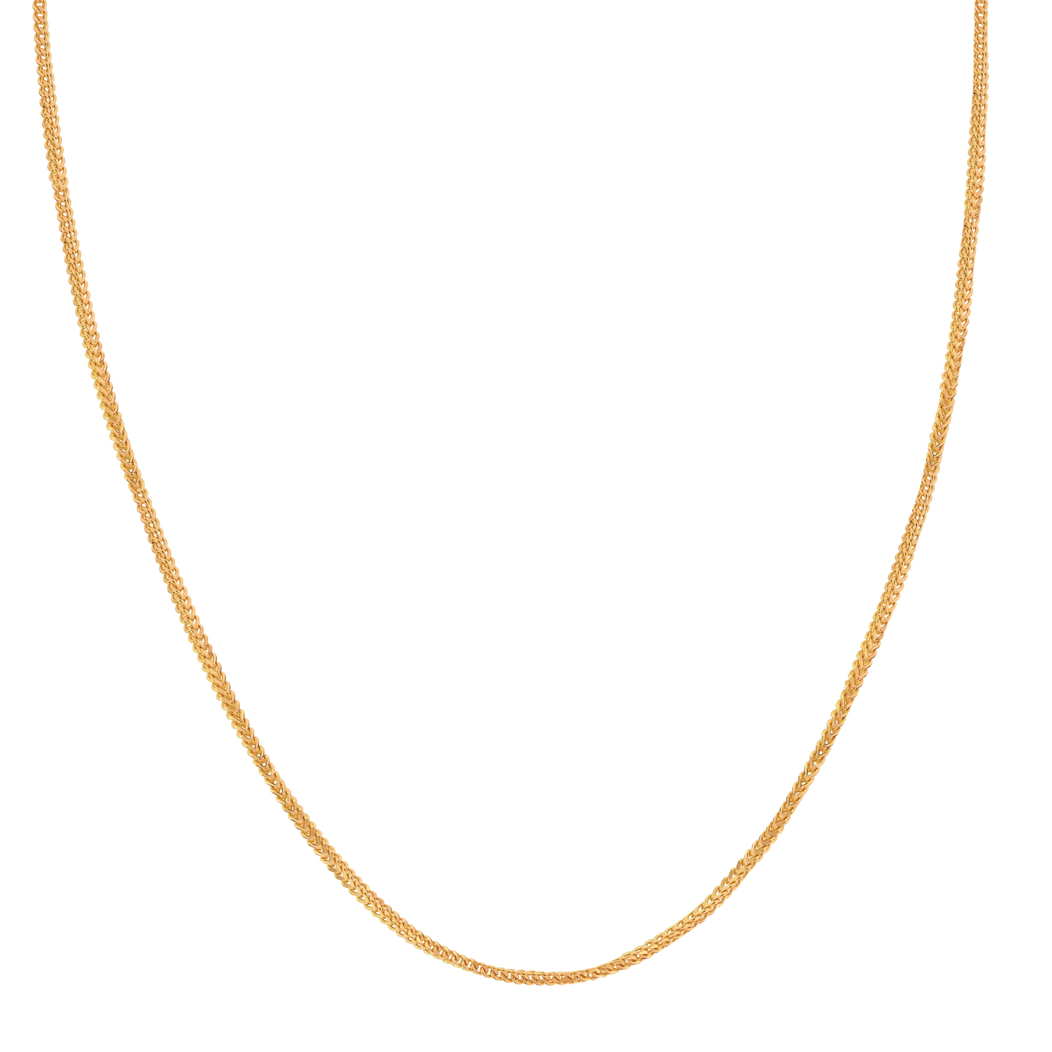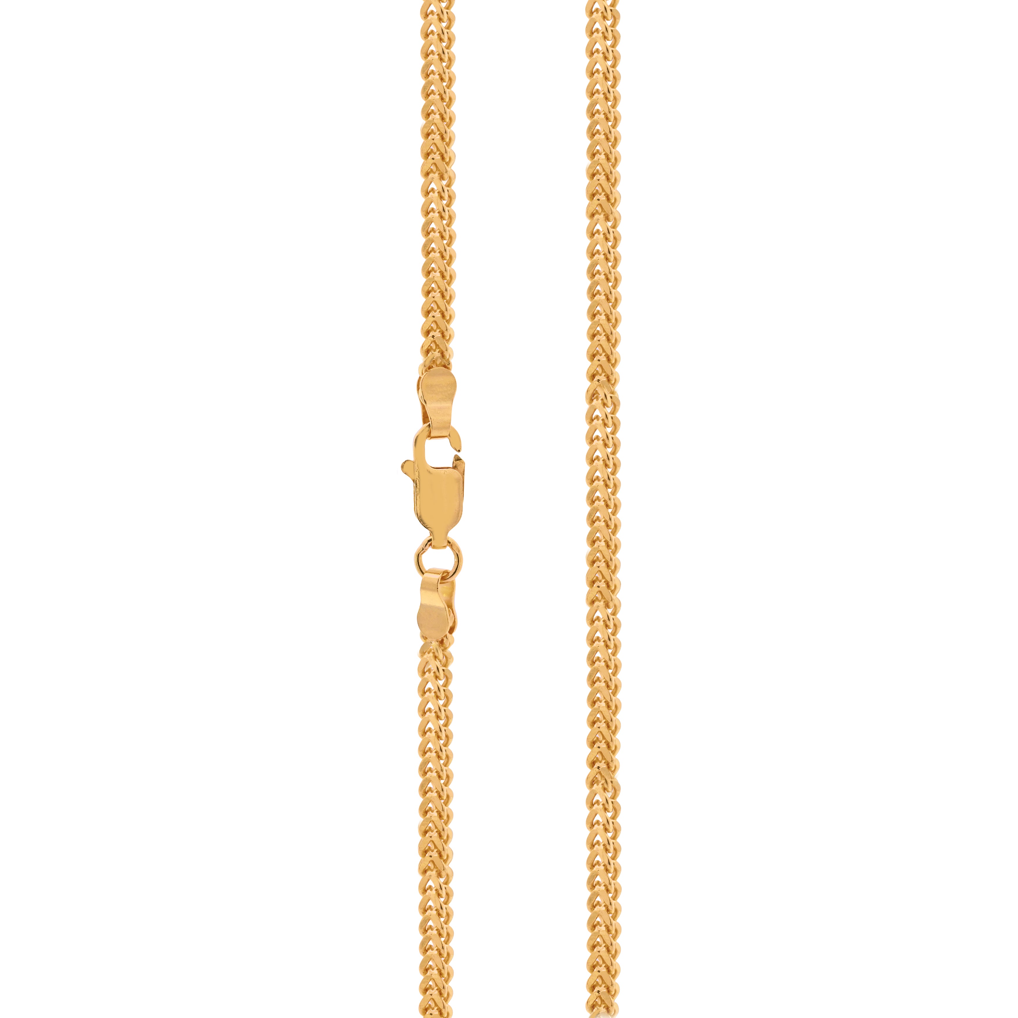 22k gold chain in a classic foxtail design. Chain measures 3mm in thickness and features a secure lobster clasp closure.