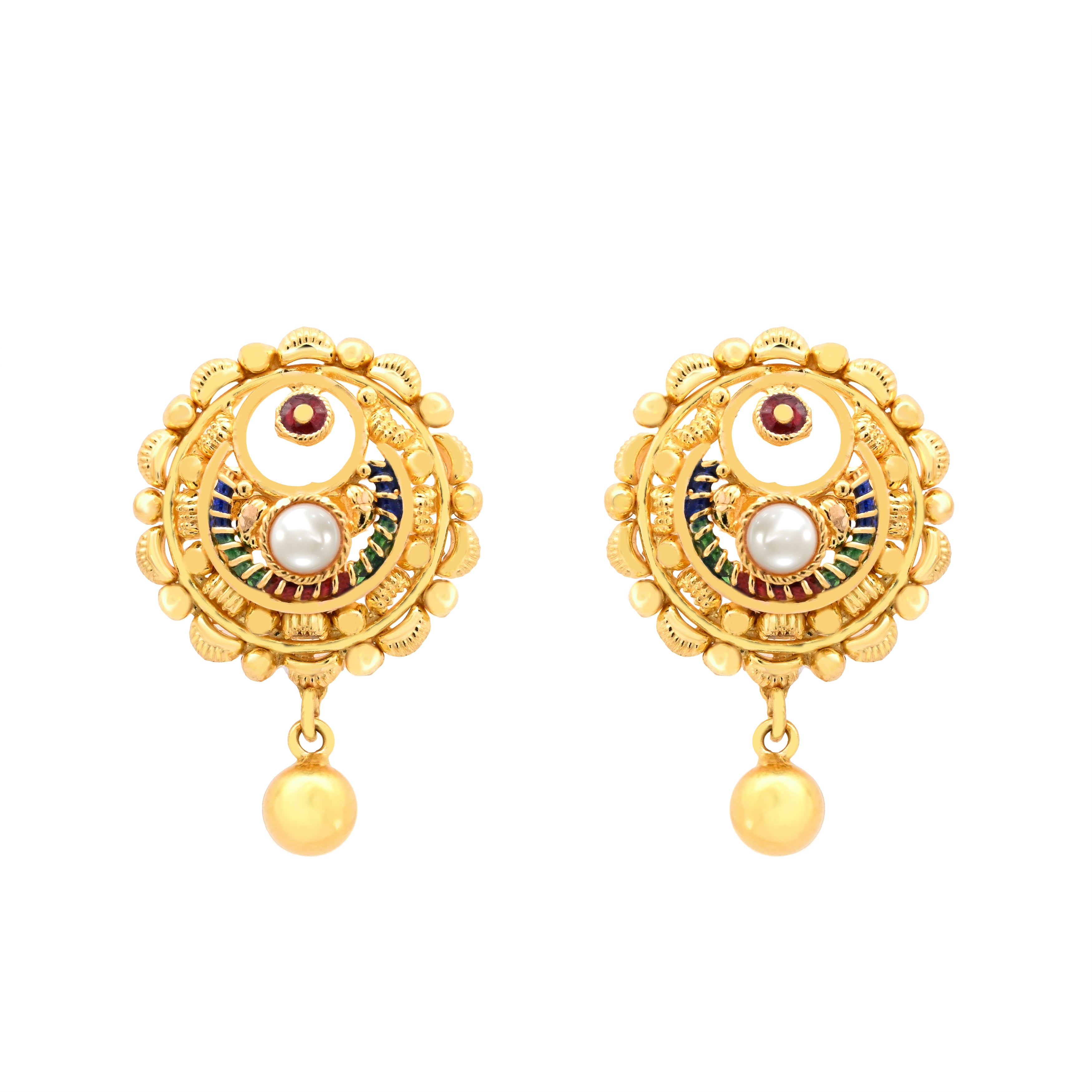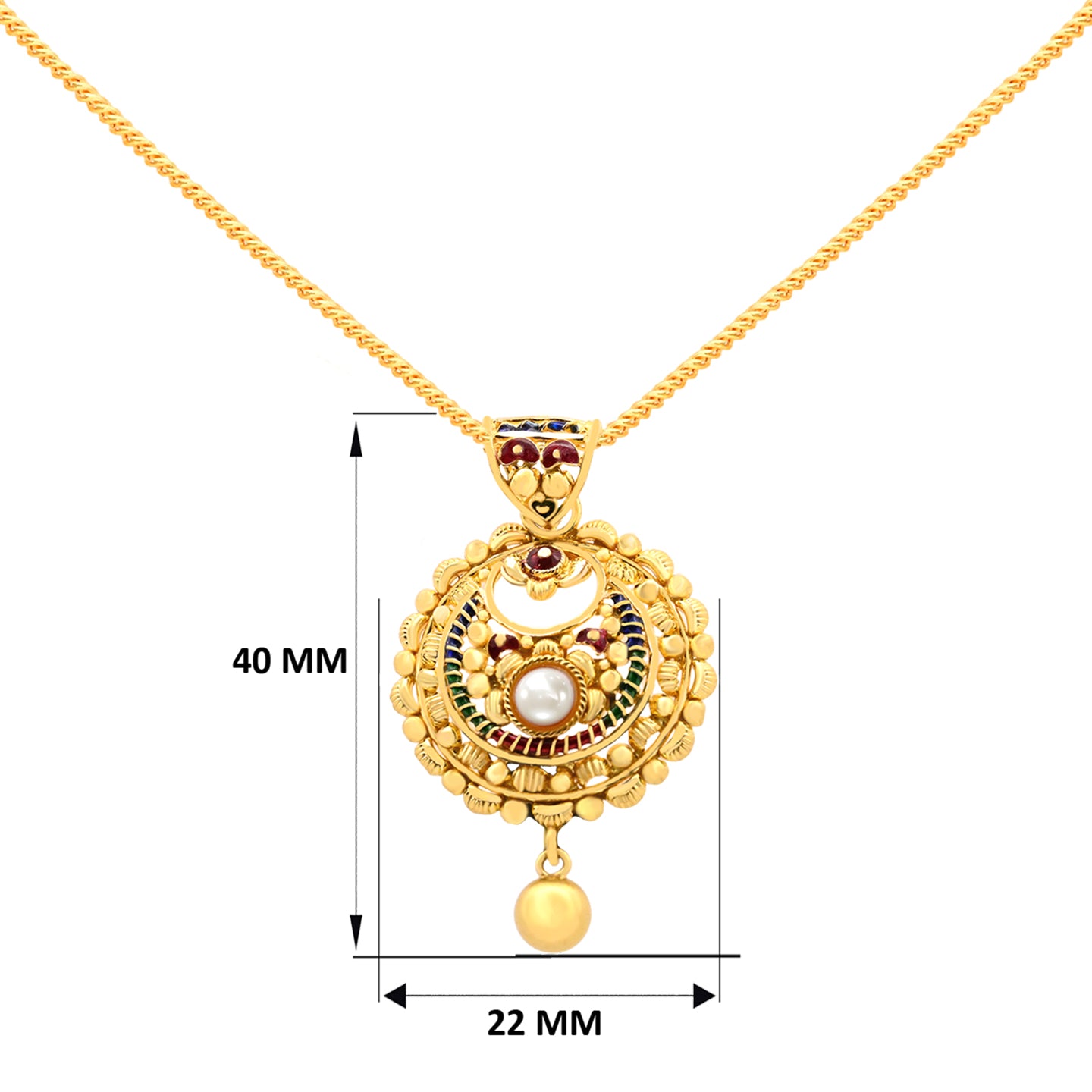 22k gold pendant and earring set featuring pearls in a unique Meena Kari design. Pendant measures 40mm in length and 22mm across. Screwback earrings in complimentary design measure 27mm in length and 18mm in width. Pendant opening can accomodate up to a 3mm chain. Chain not included.