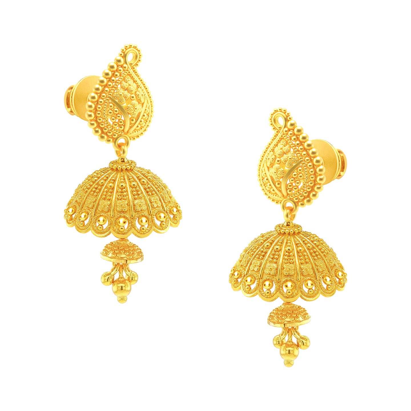 22k Teardrop stud with jhumka screwback and one dangling bell with gold ball and floral accents throughout. The earrings measure 39mm long and 19mm wide.