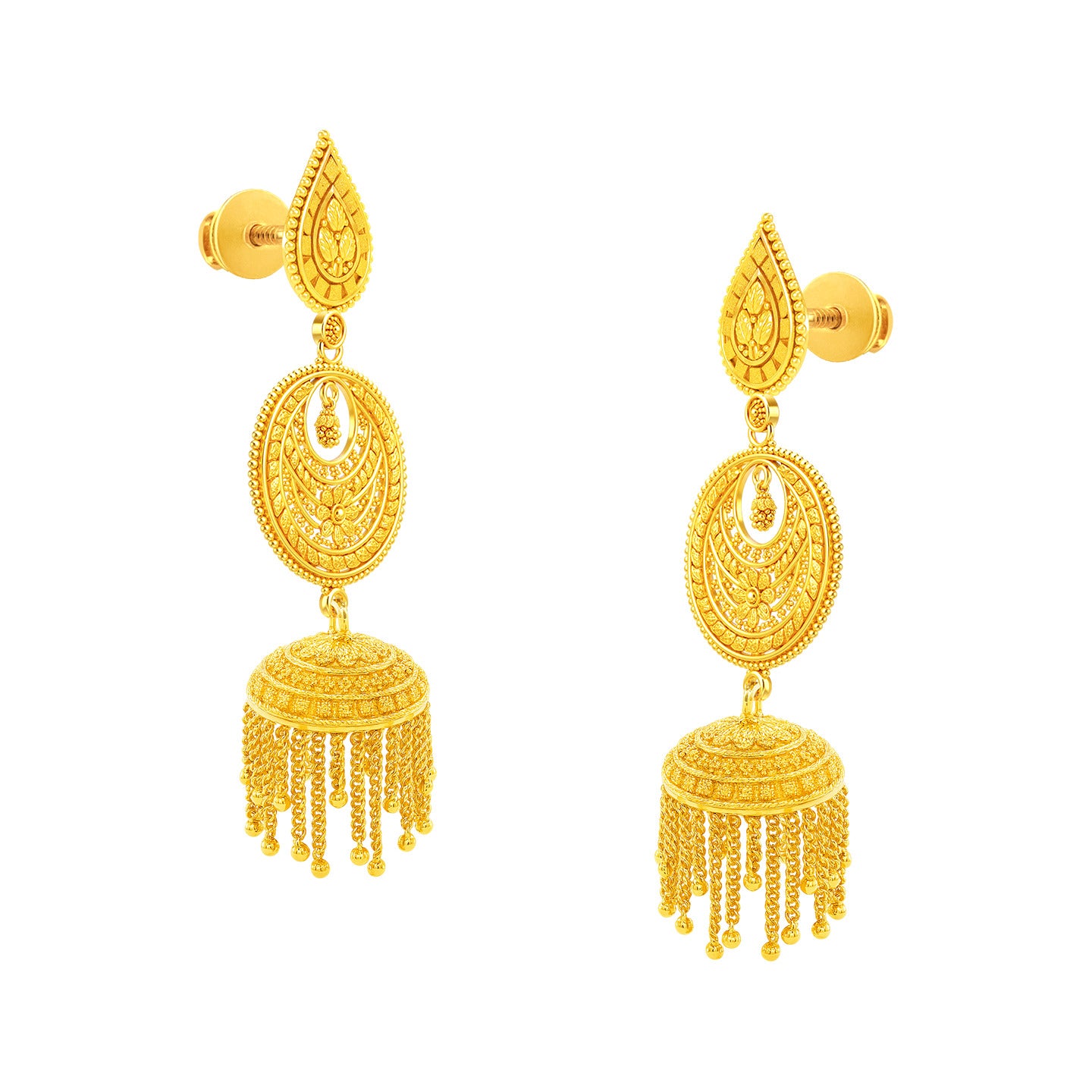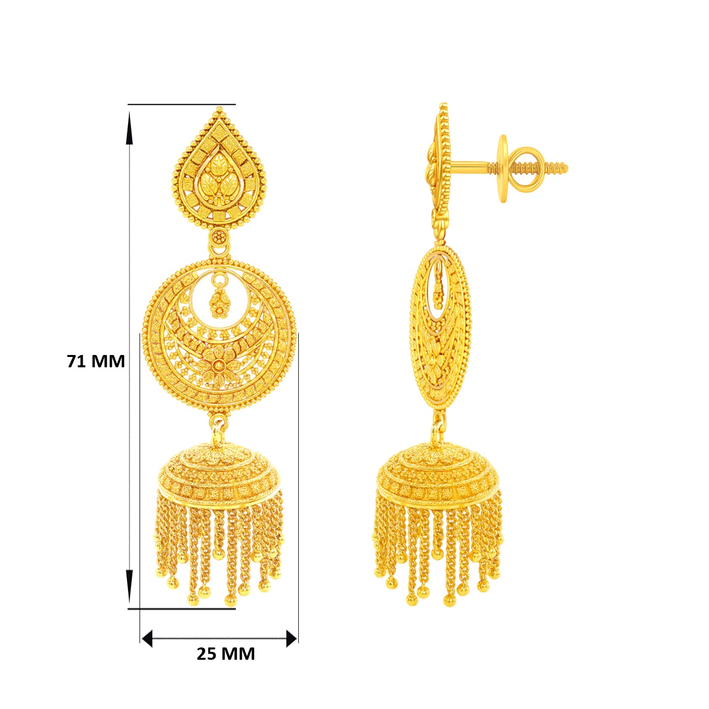22k Raindrop Chand Bali Jhumka screwback earrings with tiny dangling flowers and long gold strands leading to gold balls measuring 71mm long and 25mm wide.
