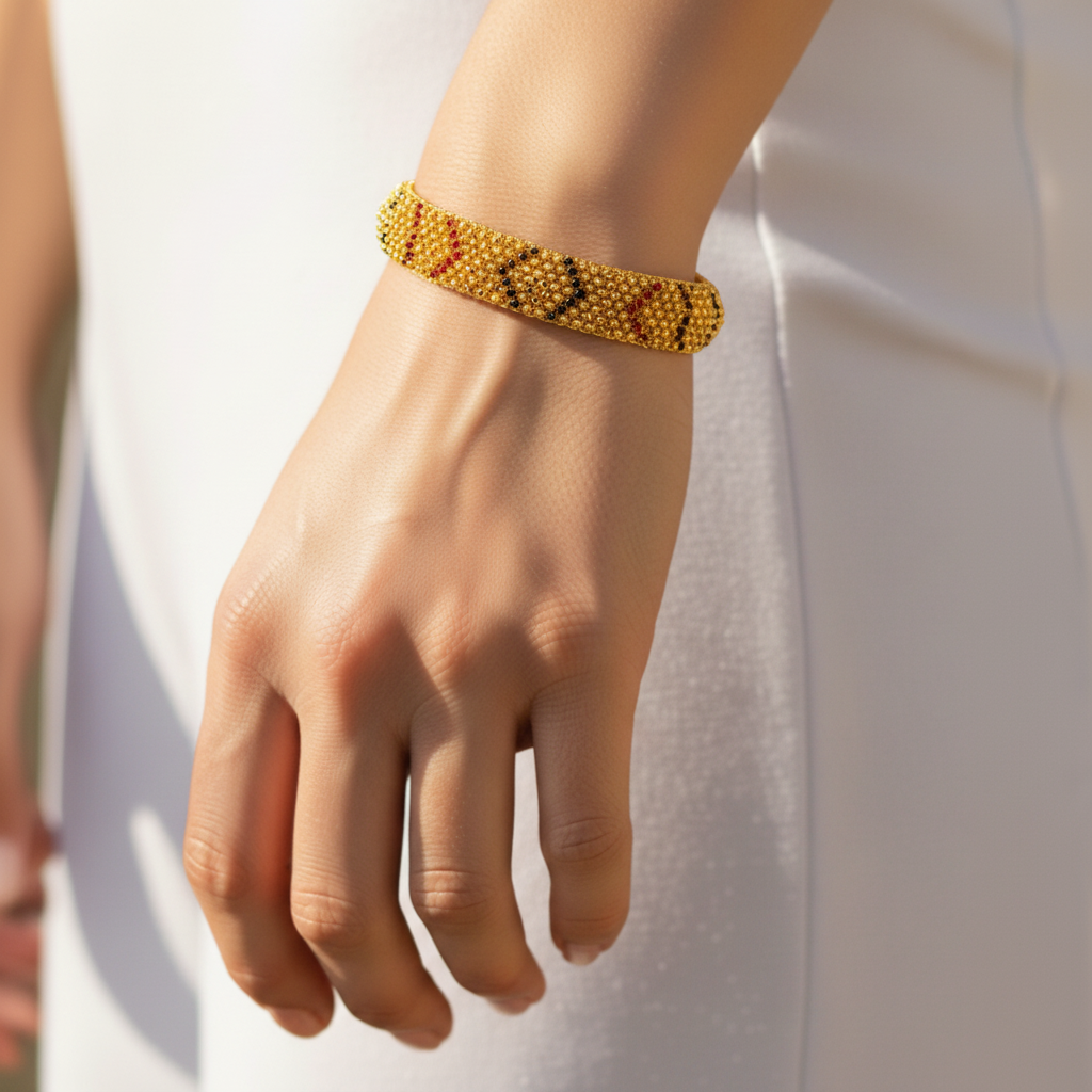 22k gold bracelet featuring a Meena Kari design. Bracelet measures 7 inches in length with hook closure. Flat bracelet measures 11mm wide.