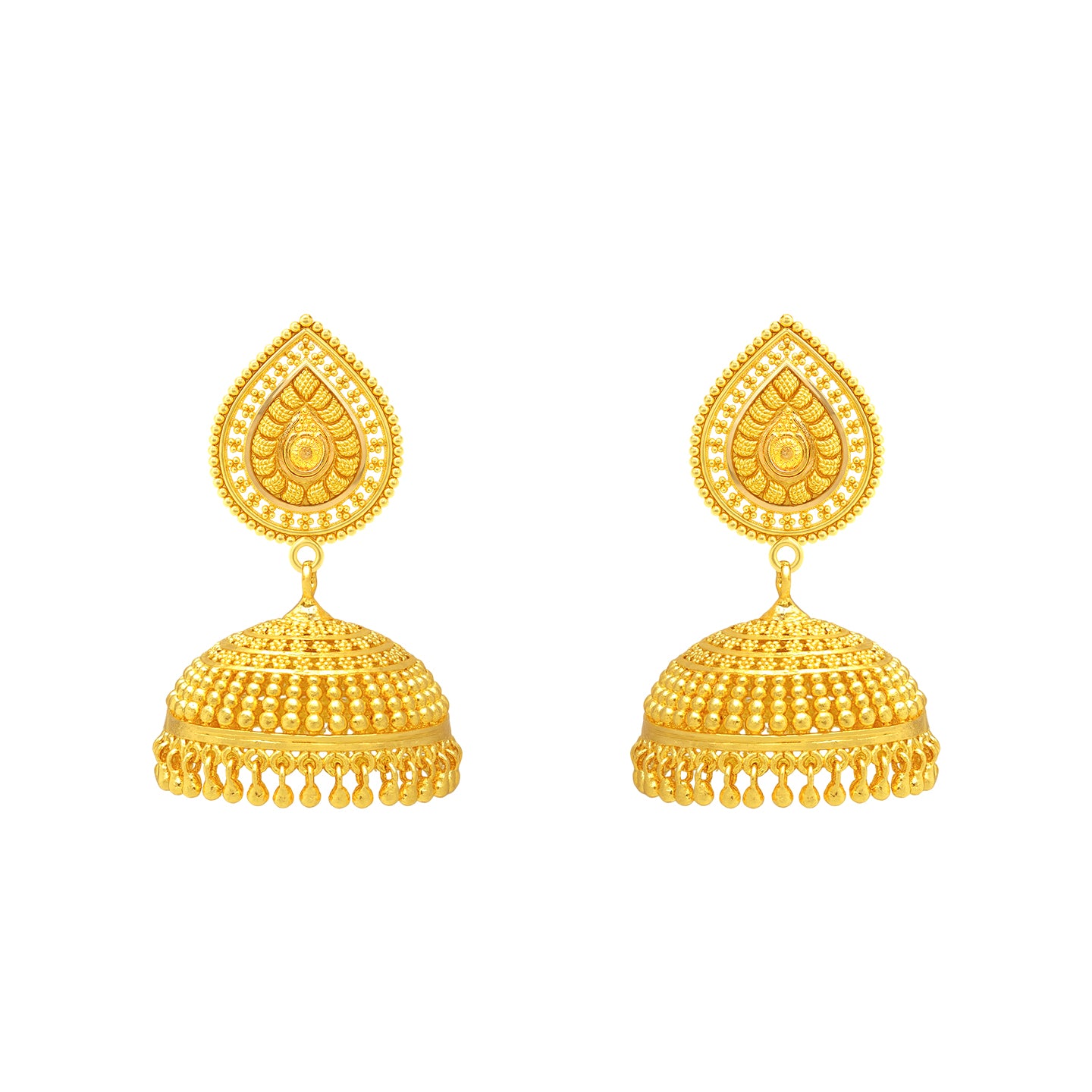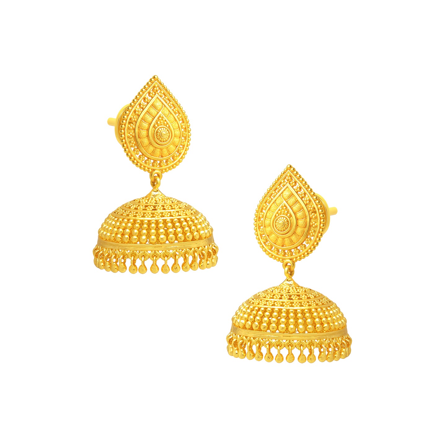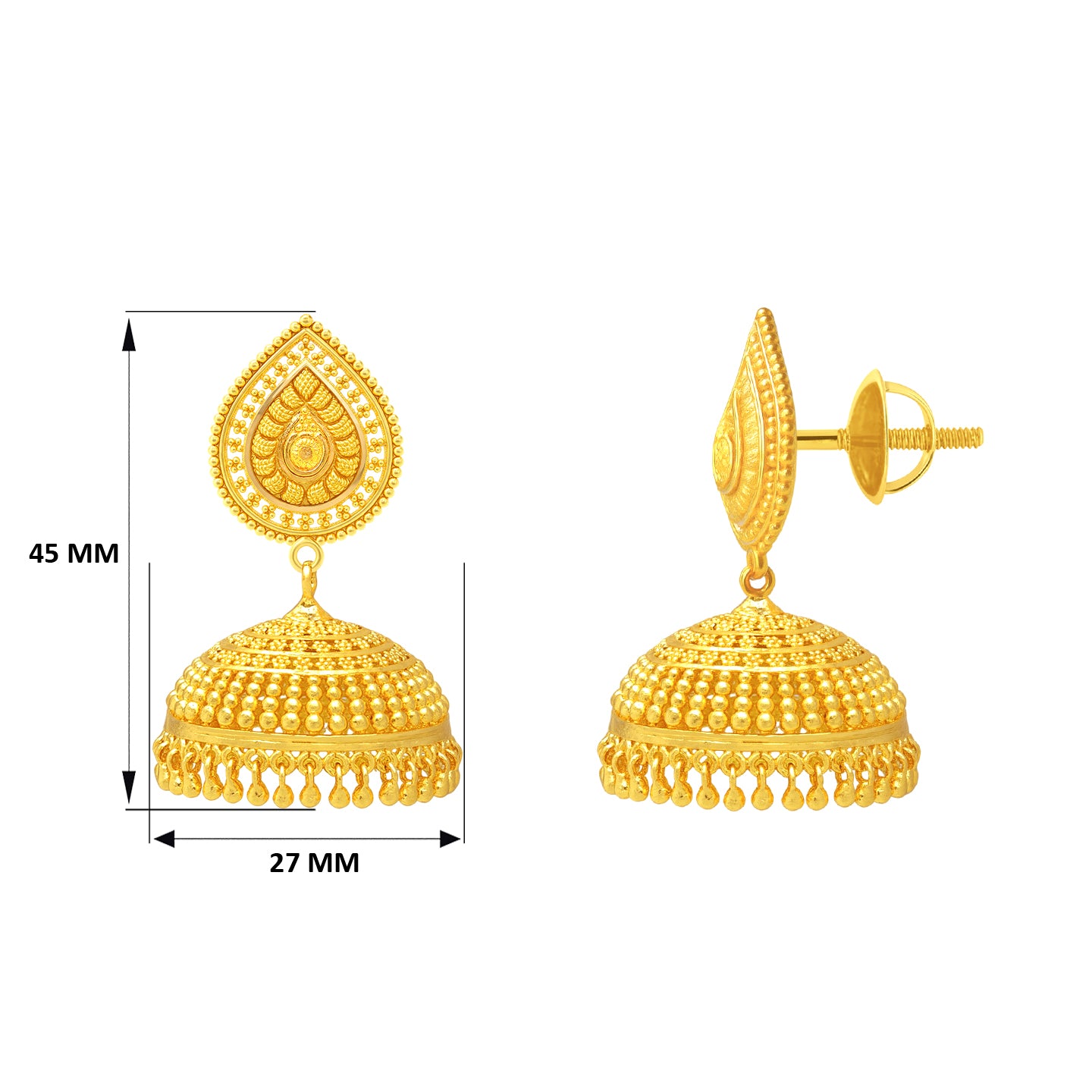 22k gold screwback earrings with large dangling jhumka. Earrings measure 45mm in length and 27mm in width. Screwback posts measure 1mm thick.