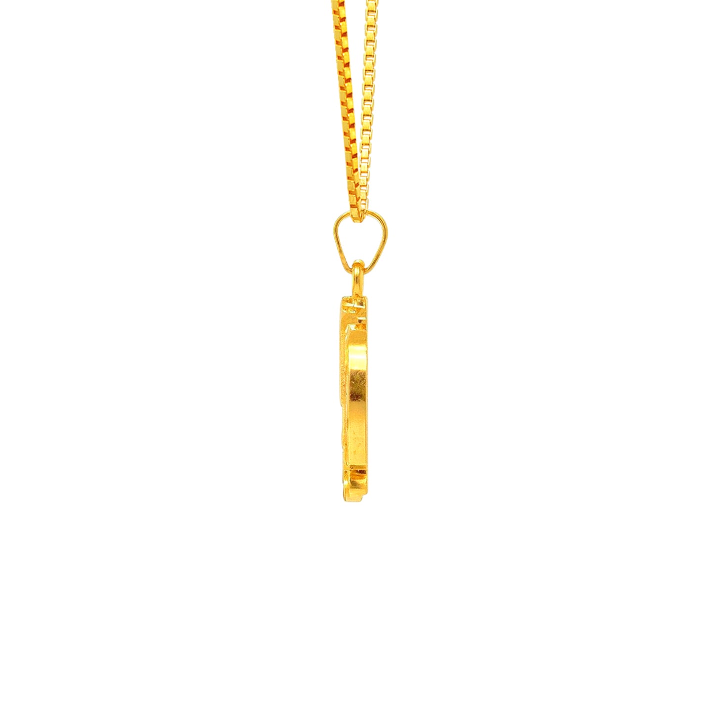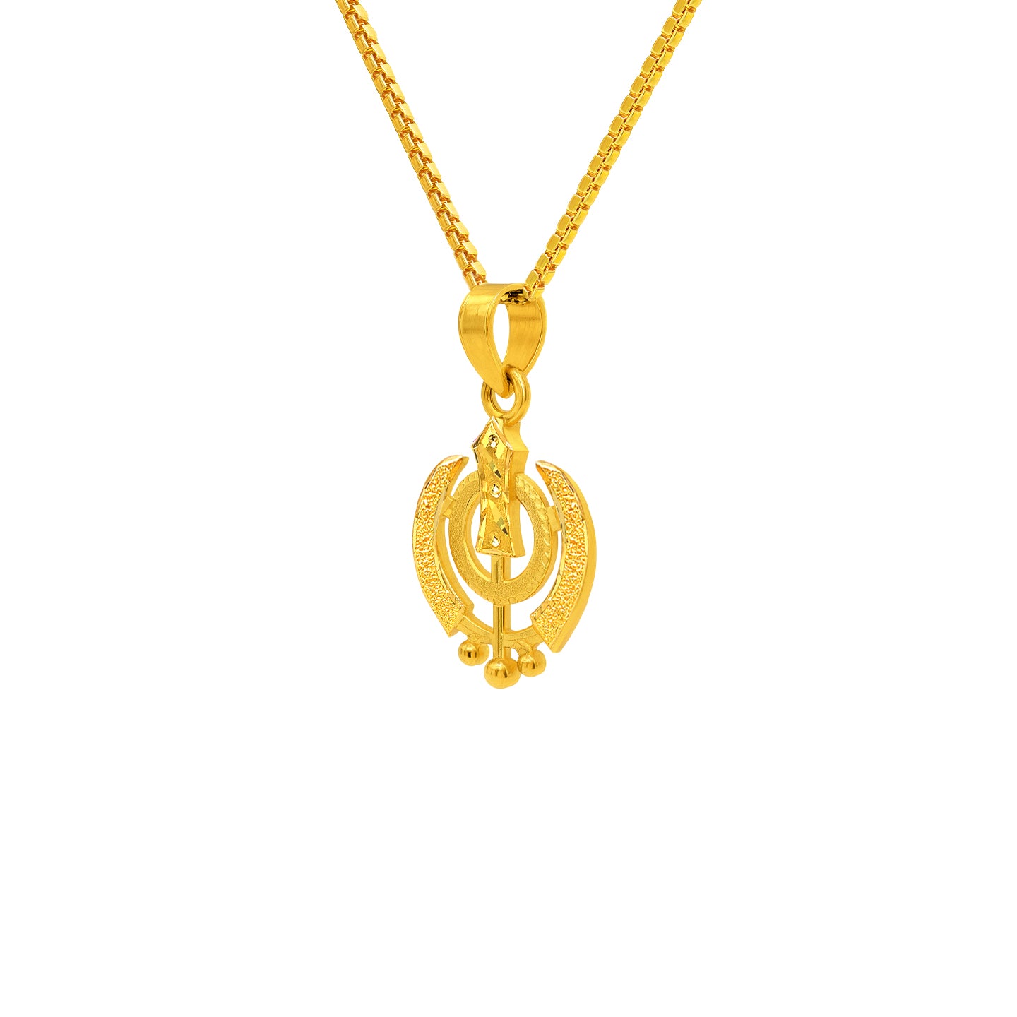 22k gold Khanda Sikh pendant with intricate laser cut design. Pendant measures 37mm in length and 21mm in width. Chain not included. Pendant bale can accomodate a 4mm chain.