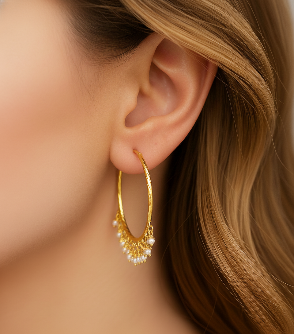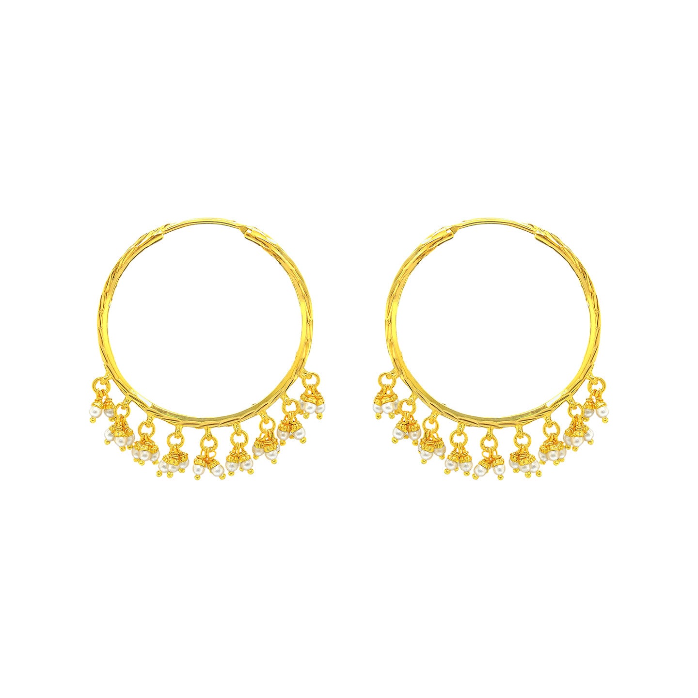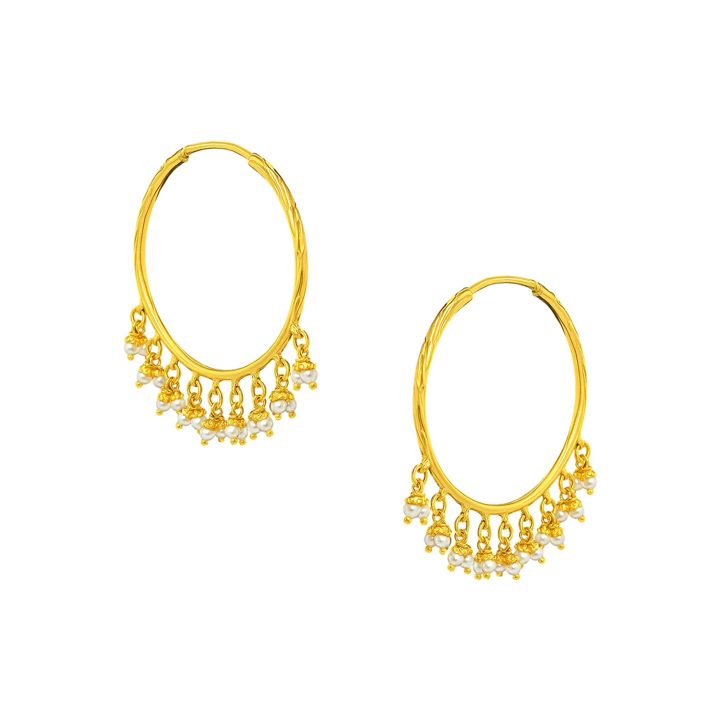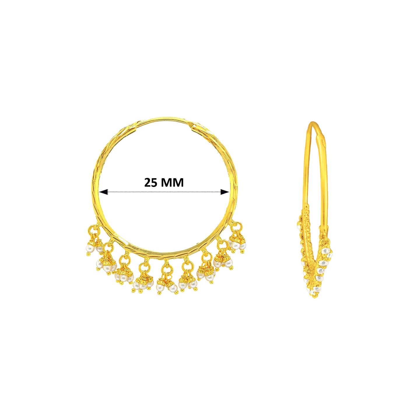 22k hoop earrings with dangling pearl design. Hoop earrings measure approximately 25mm in diameter and hoop width is 2mm. Pearl weight is 0.54g.