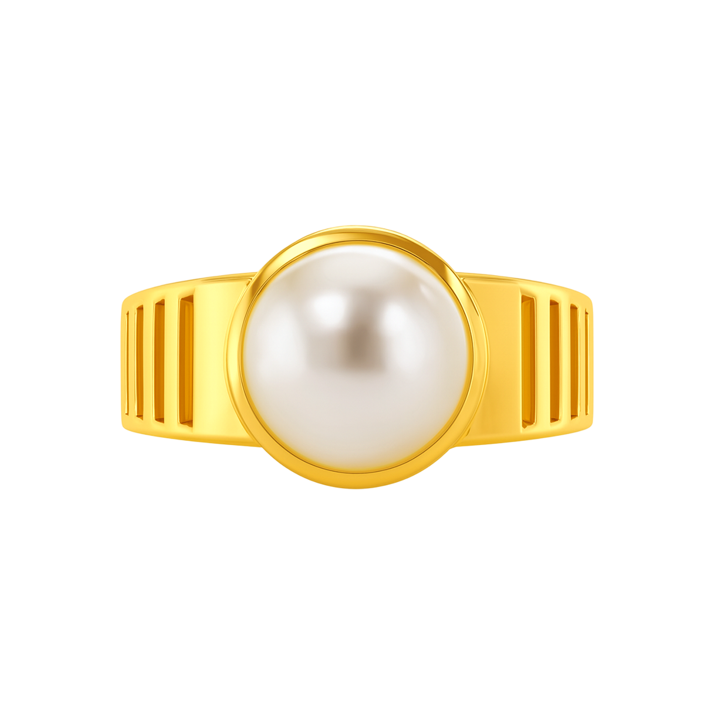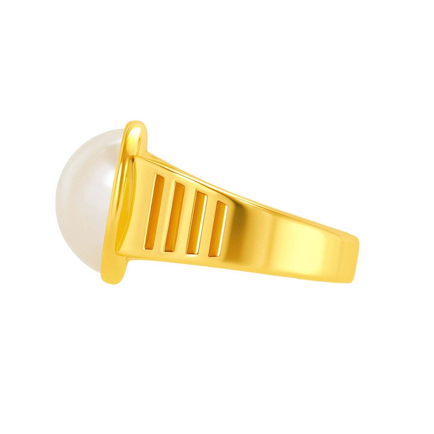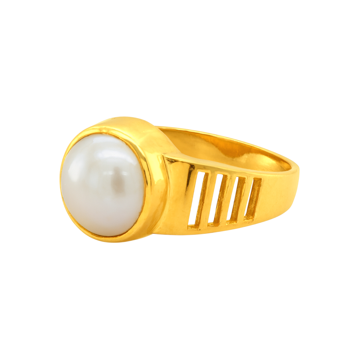 22k gold ring with large pearl. Pearl is 5.00ct. Thick band measures from 4mm thick to 8mm thick. Ring size is 9.5.