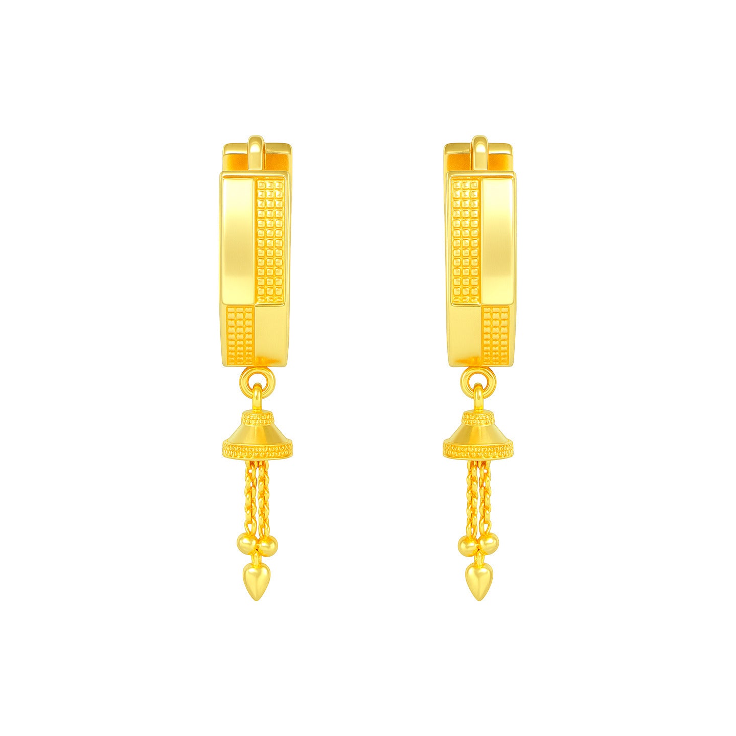 22k gold huggie earrings with hinge and dangling charm design. These earrings measure 36mm in total length and 15mm at its widest part.