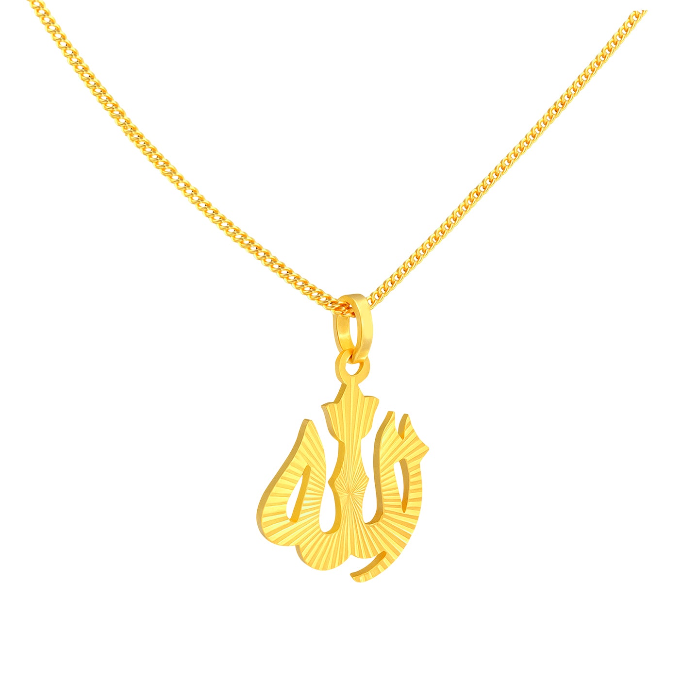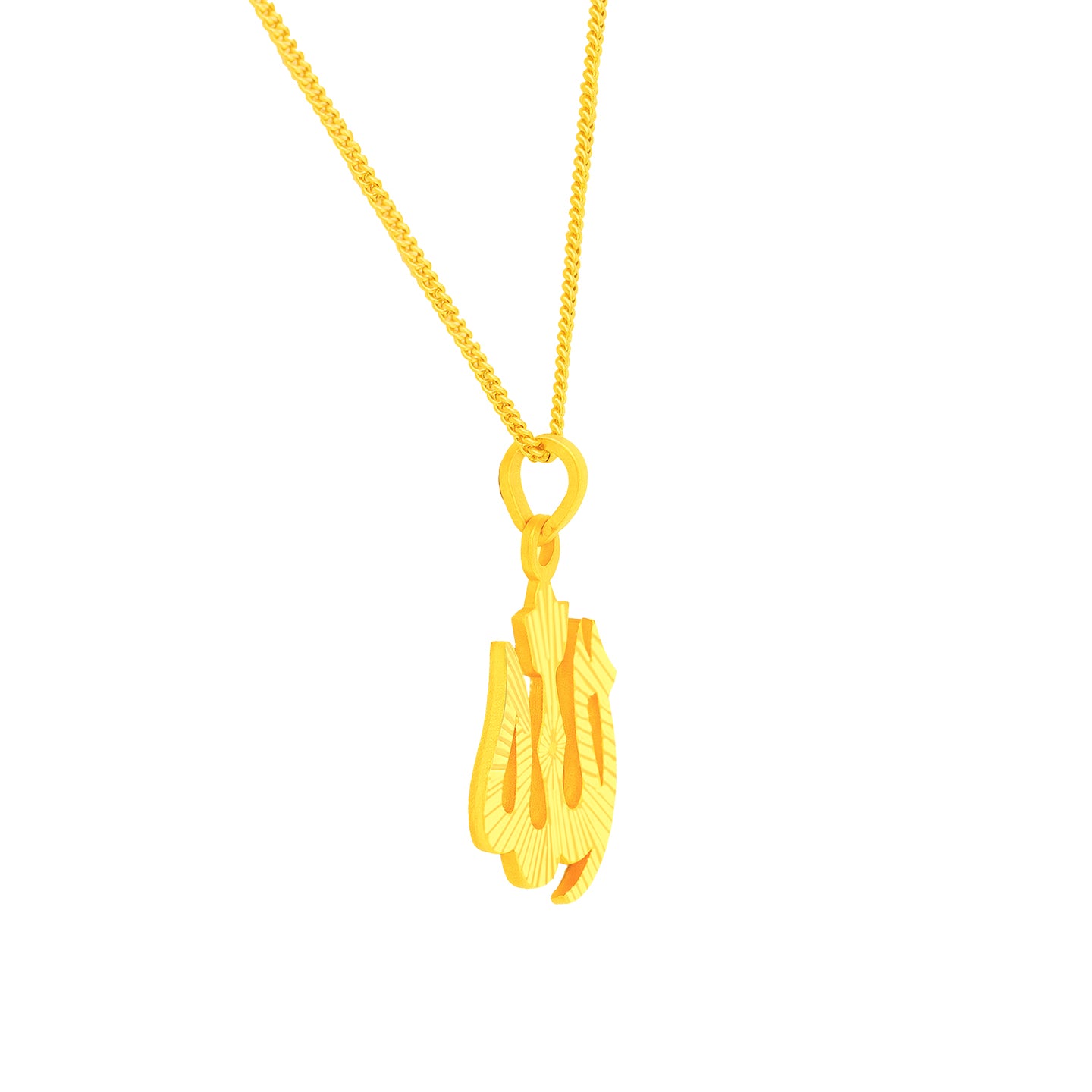 22k gold Allah pendant with laser cut design. Pendant measures 28mm in length and 23mm in width. Chain not included. Pendant bale can accomodate a 2mm chain.