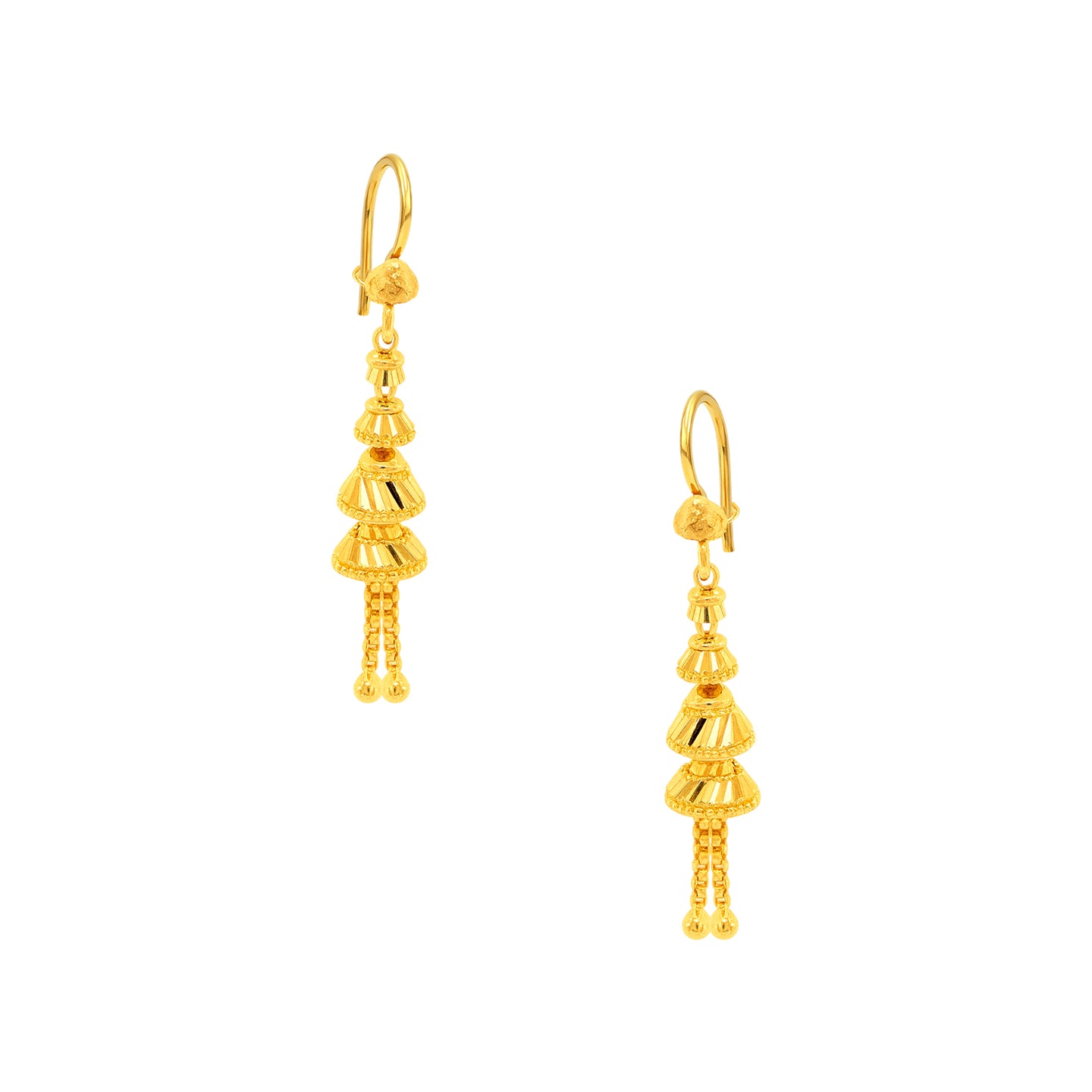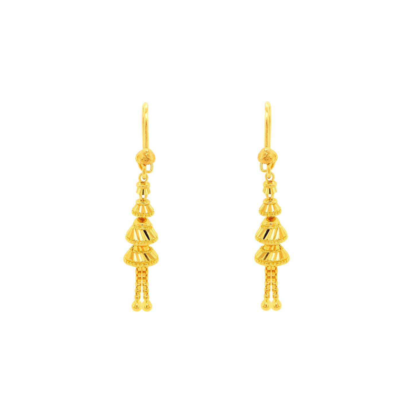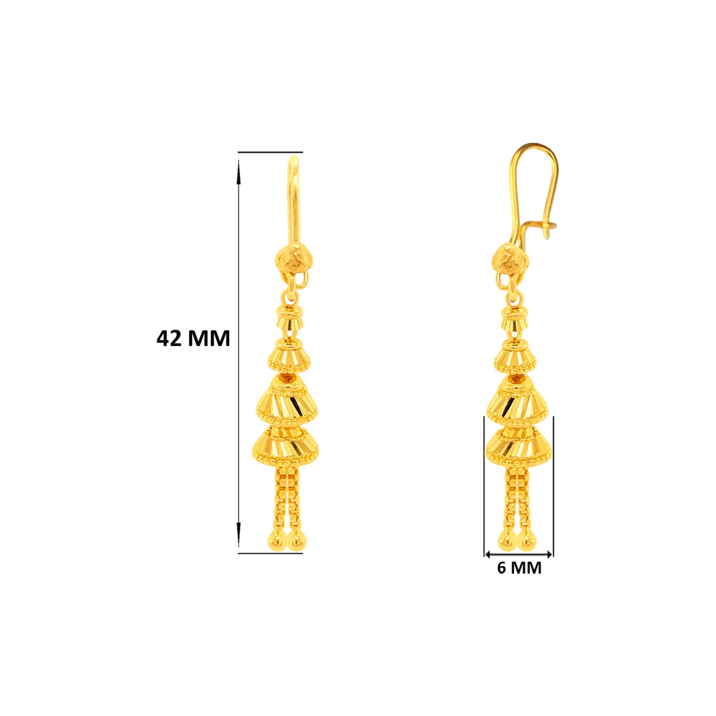 22k gold hook earrings measuring 42mm in length and 6mm at widest point. Small and lightweight earrings with beautiful gold design and dangling polished beads.