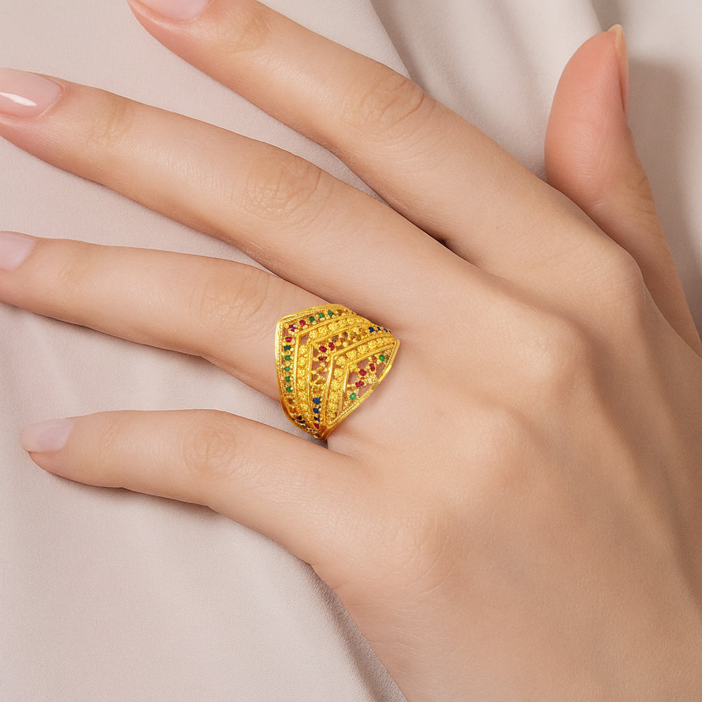 22k gold ring with unique meena kari enamel design. Front facing design measures 23mm in length. Ring is slightly adjustable and measures size 9 or above.
