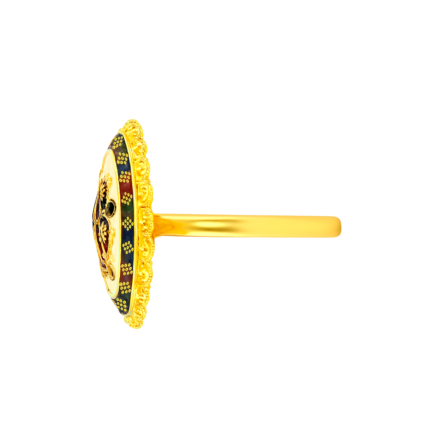 22k gold adjustable ring with white meena kari enamel design. Ring features traditional design in white, red, blue, and green. Main design measures 35mm in diameter. Ring is adjustable from size 6 to 7.