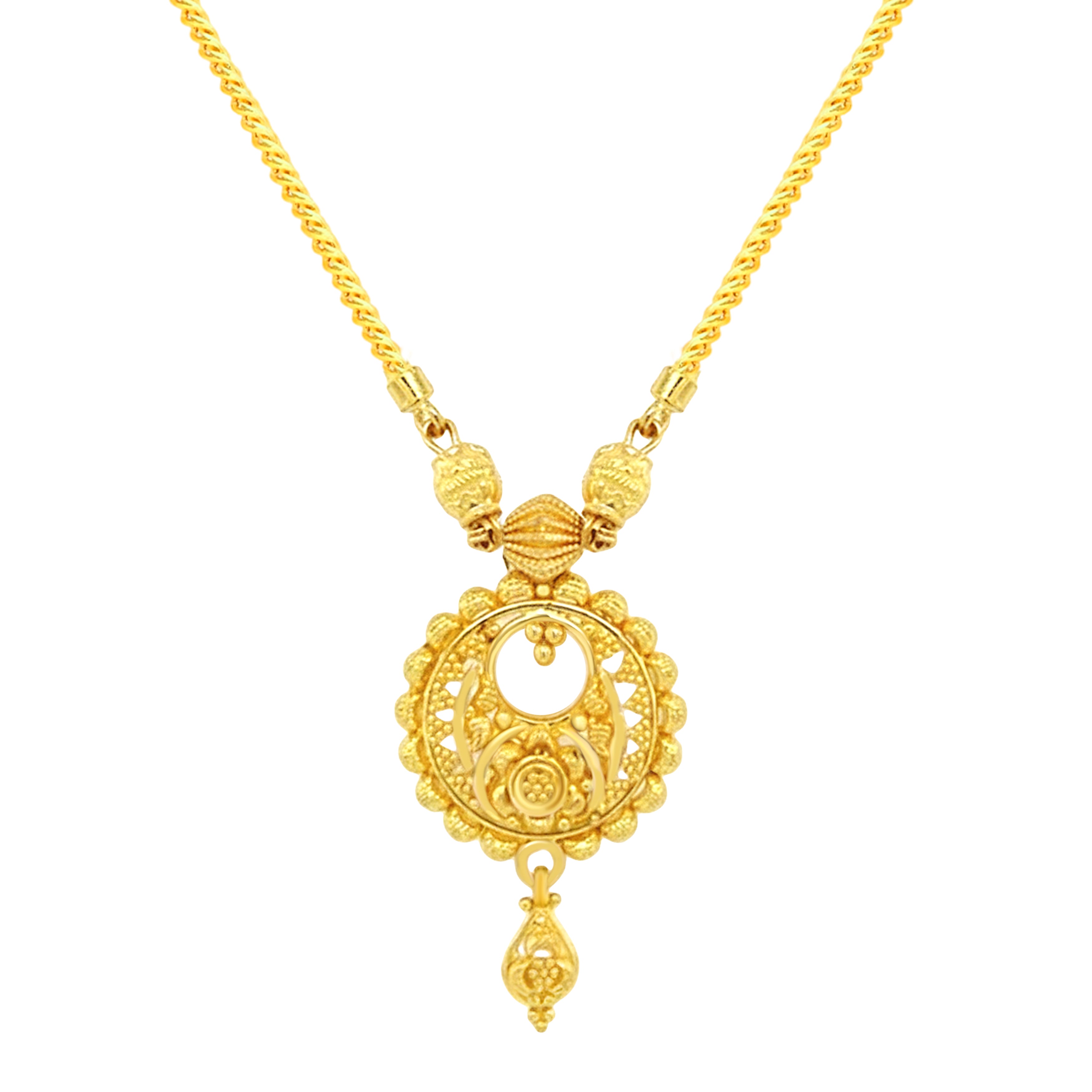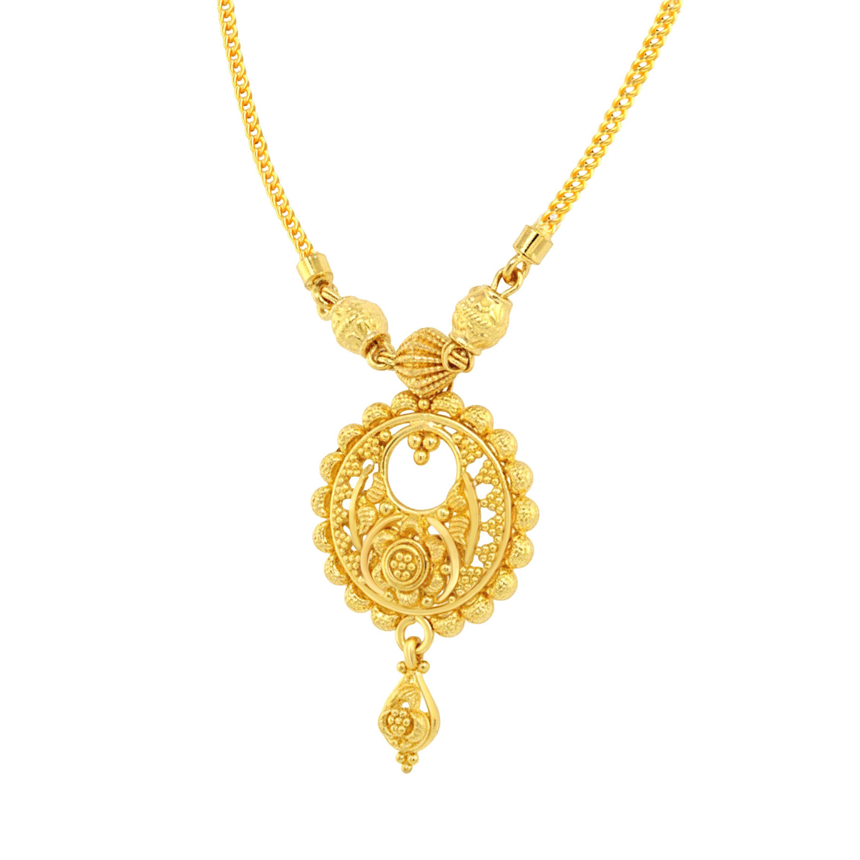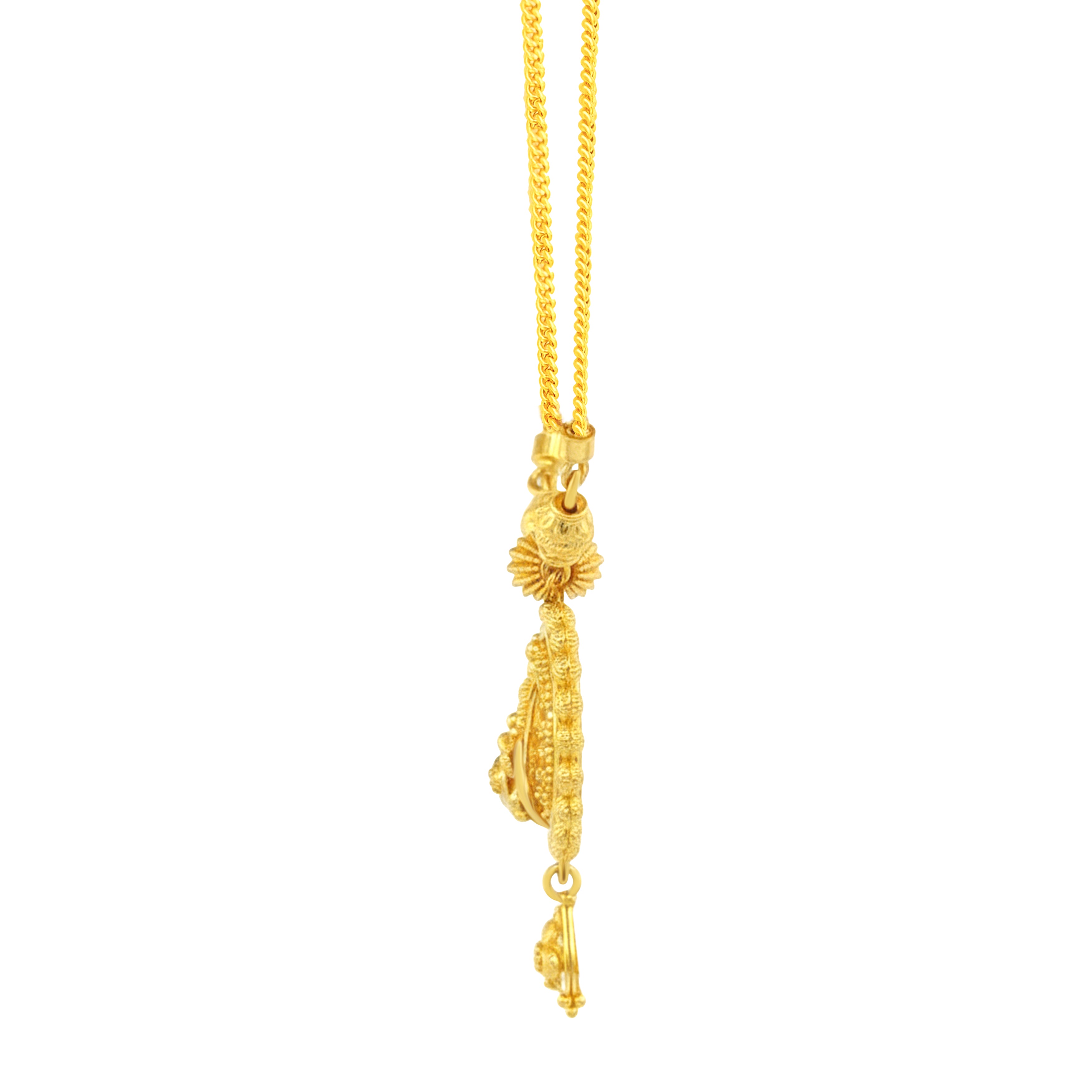 Beautiful 22k Gold Necklace and Earring Set featuring ornate Chandbali design. Necklace measures 16 inches long and features lobster clasp closure. Dangling screwback earrings measure 30mm in length.