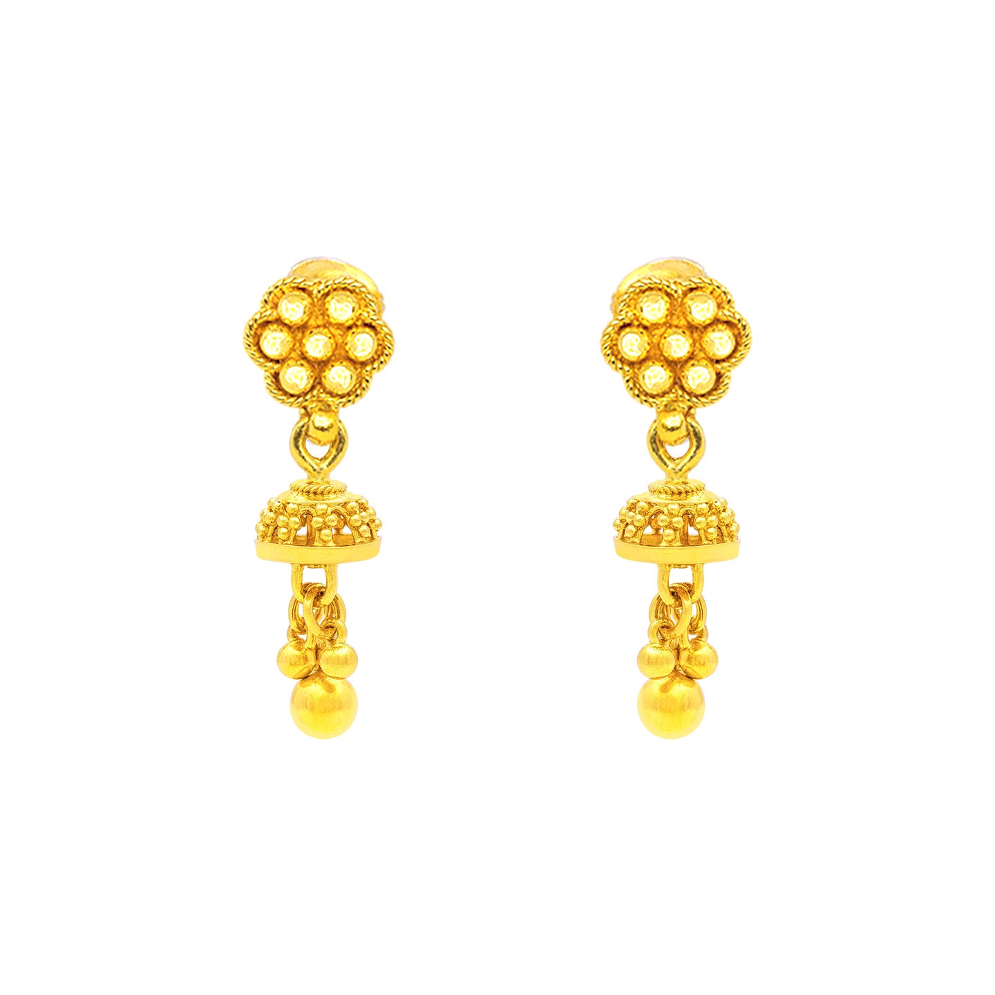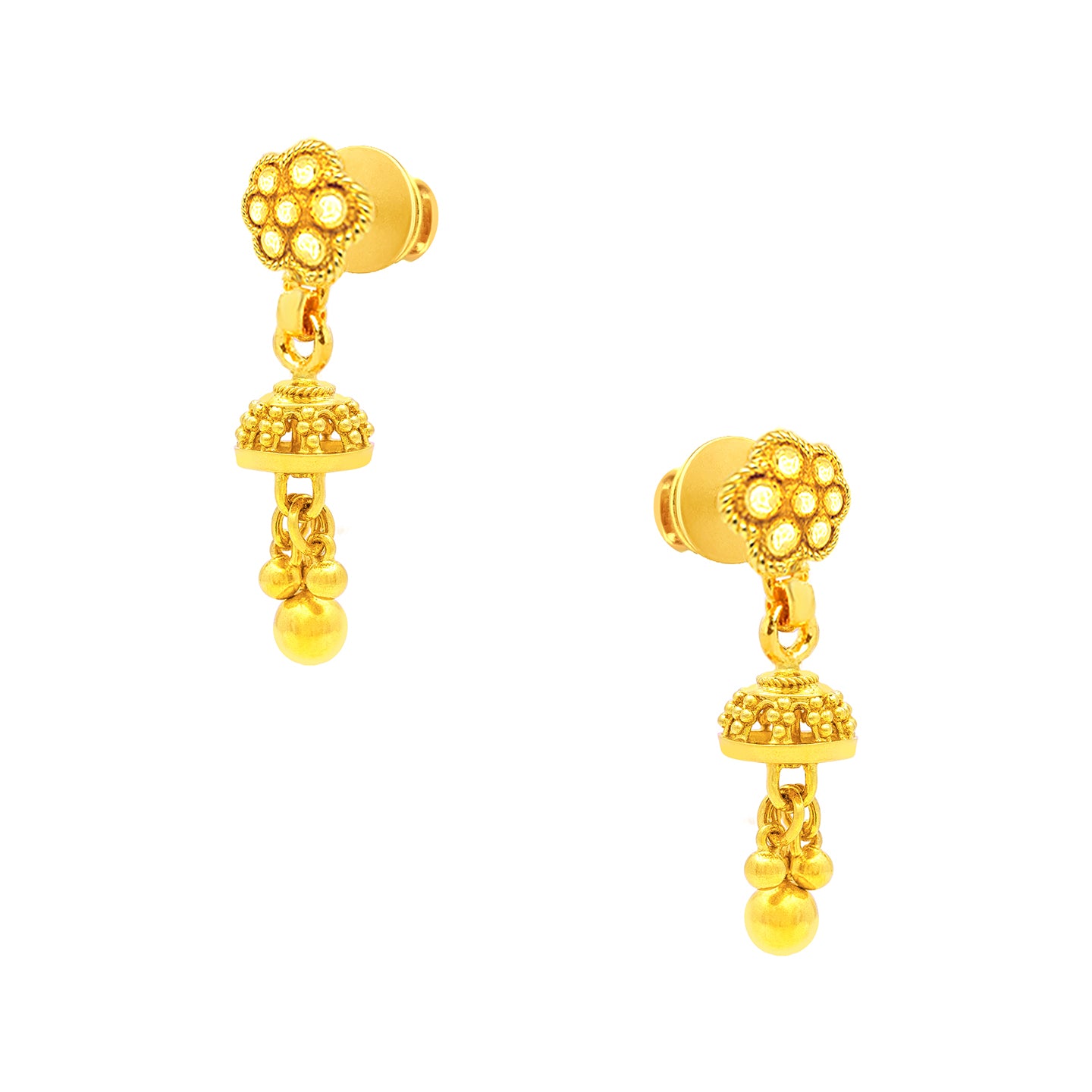 22k gold jhumka earrings. Earring design features floral screwback tops and ornate jhumka. Screwback top measures 6mm in diameter. Jhumkas measure 6mm in diameter. Earrings measure 20mm from top to bottom.