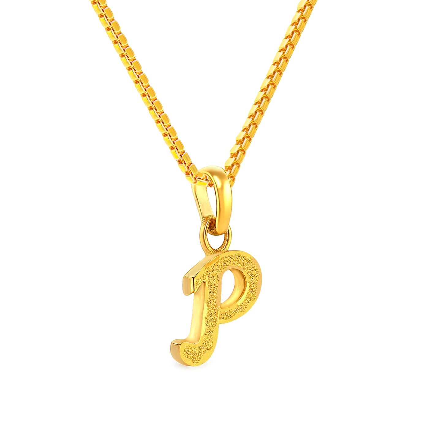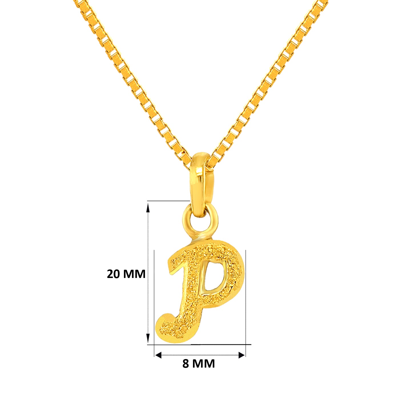 22k gold pendant with initial "P." Pendant measures 20mm in length and 8mm in width. Pendant can fit chain up to 2mm in thickness. Pendant only, no chain included.