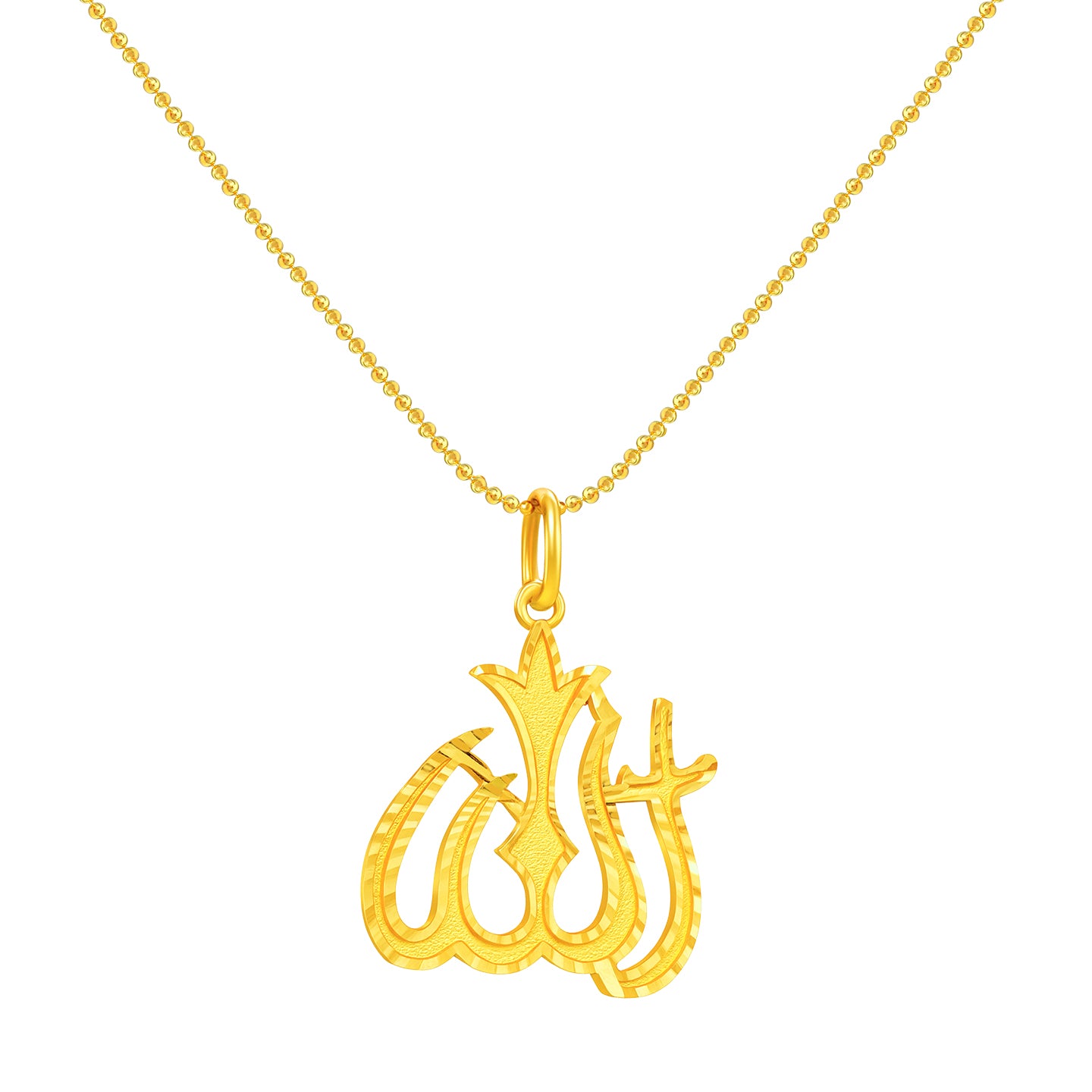 22k gold Allah pendant. Pendant measures 31mm in length by 23mm in width. Bale can fit a 3mm chain. Pendant only, chain not included.