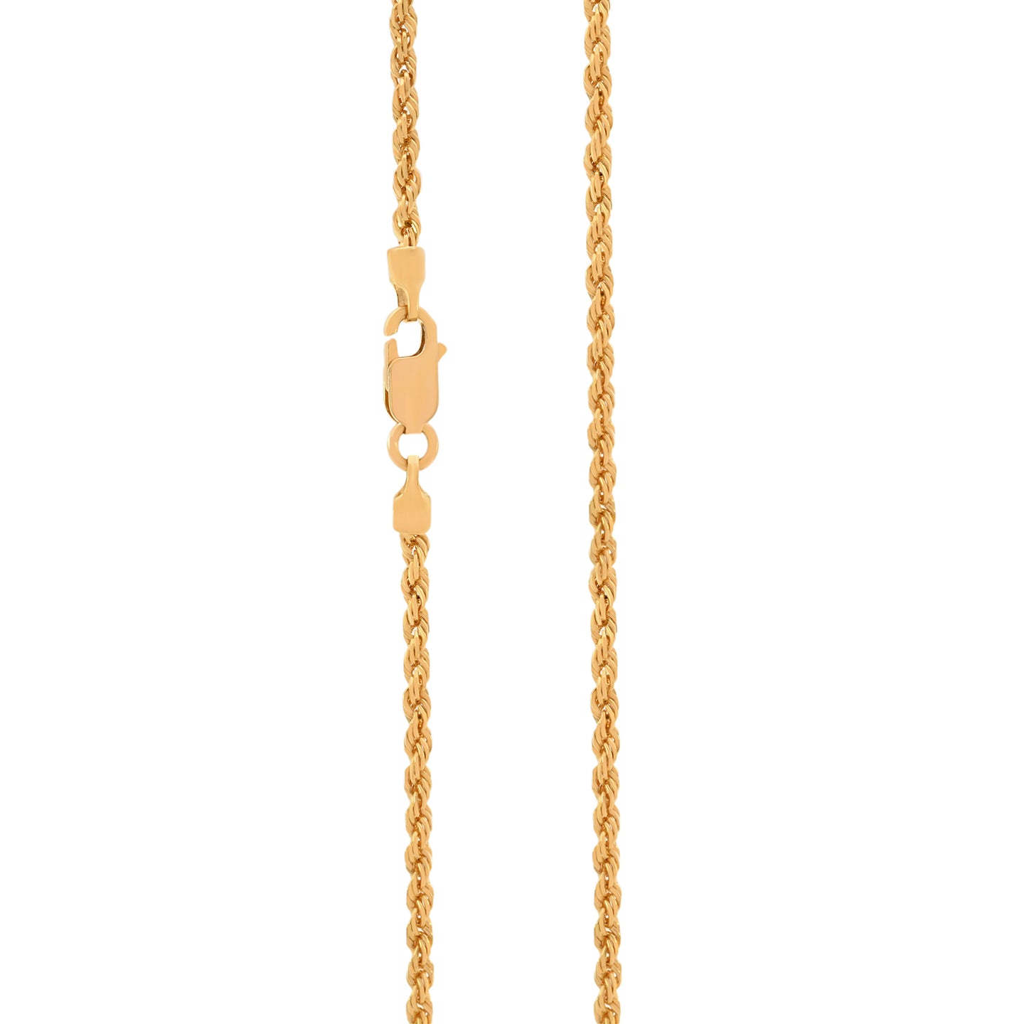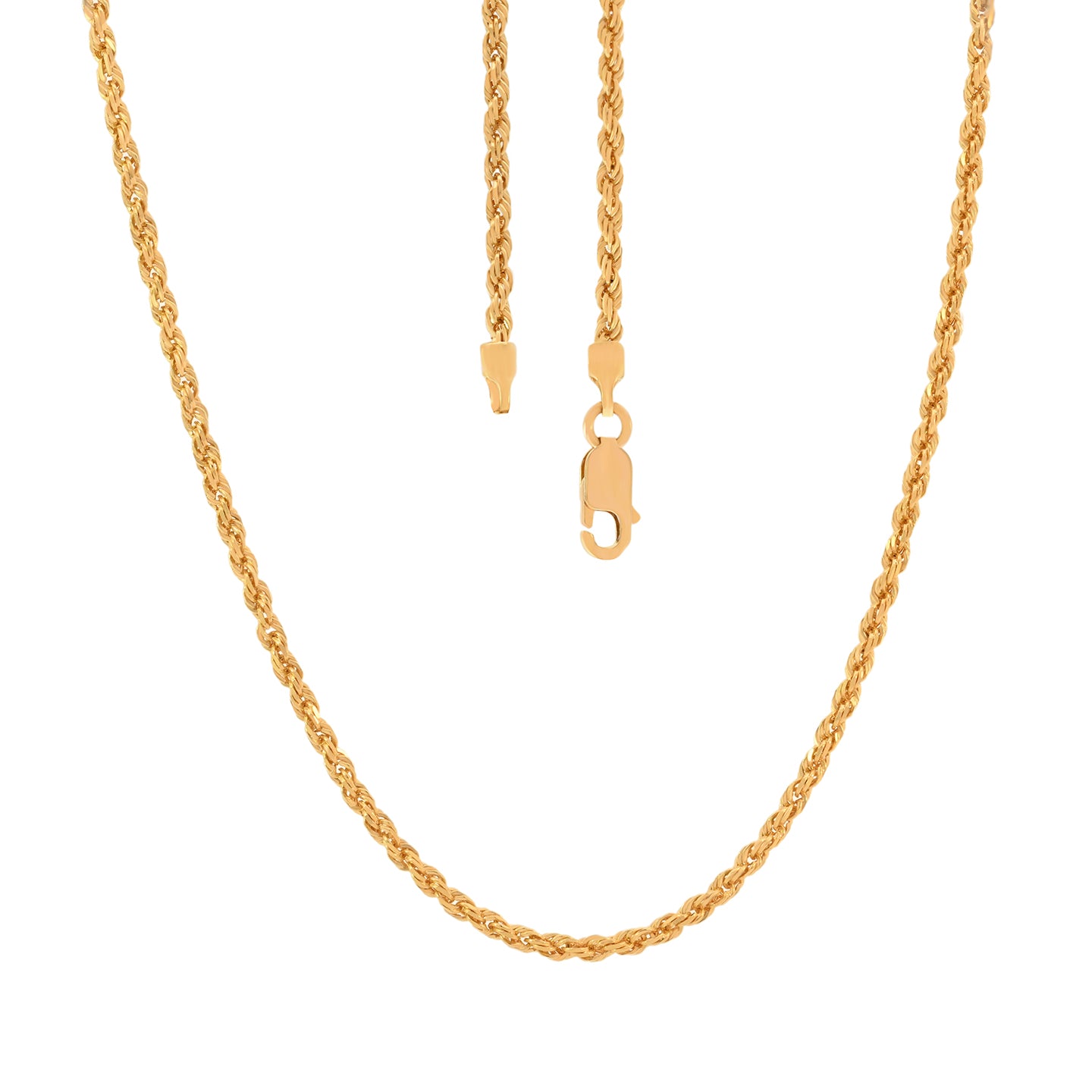 22k gold rope chain in 21.5 inches. Lovely rope chain measures 2mm in thickness for a lightweight or minimal look. Lobster clasp closure.