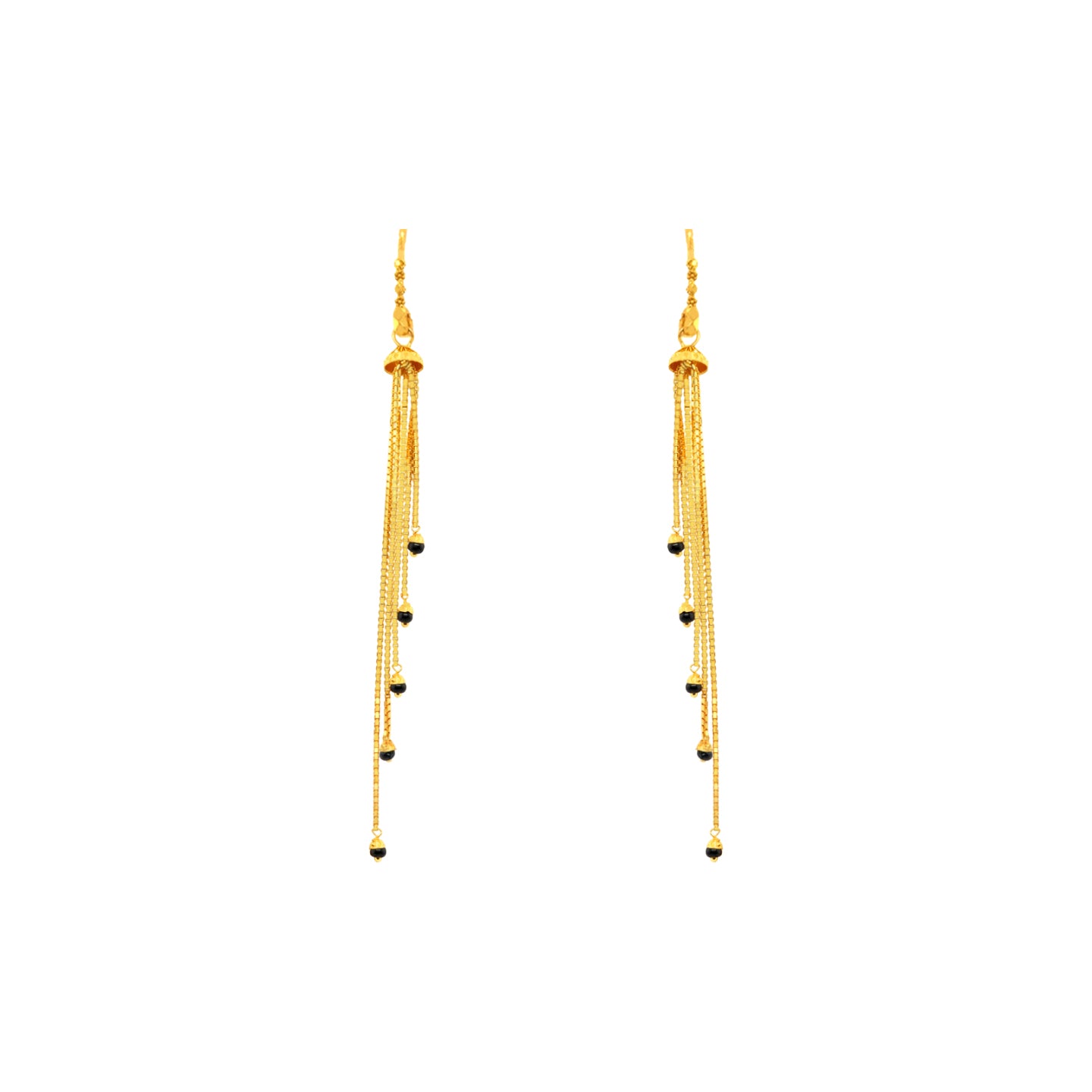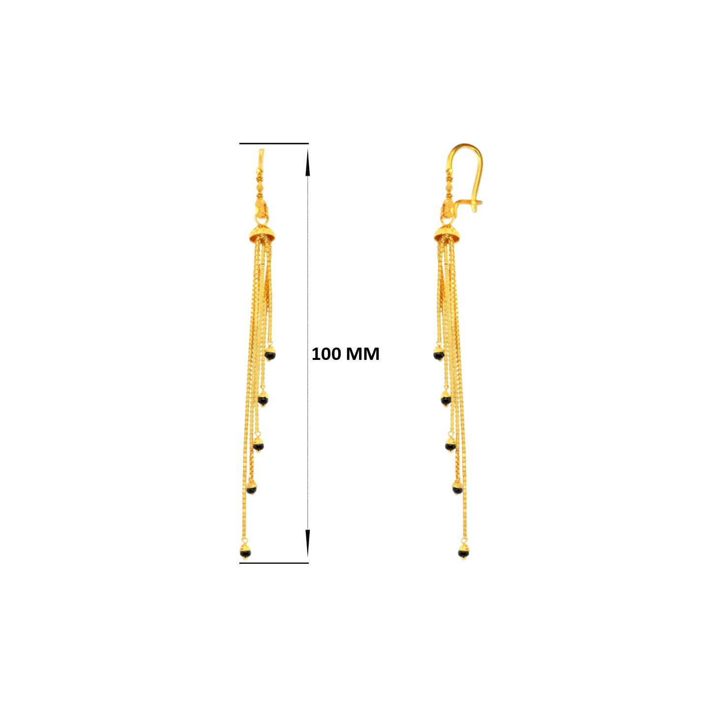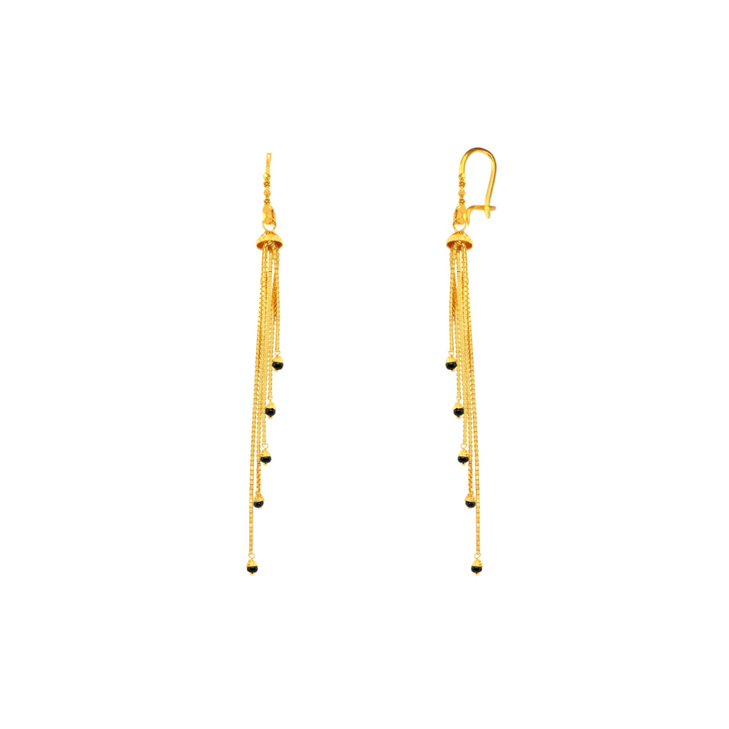 Beautiful 22k Gold Necklace and Earring Set featuring dangling black beads. Necklace measures 16 inches and features an eye-catching pendant measuring 3.5 inches in length. Long, dangling hook earrings measure 100mm in length.