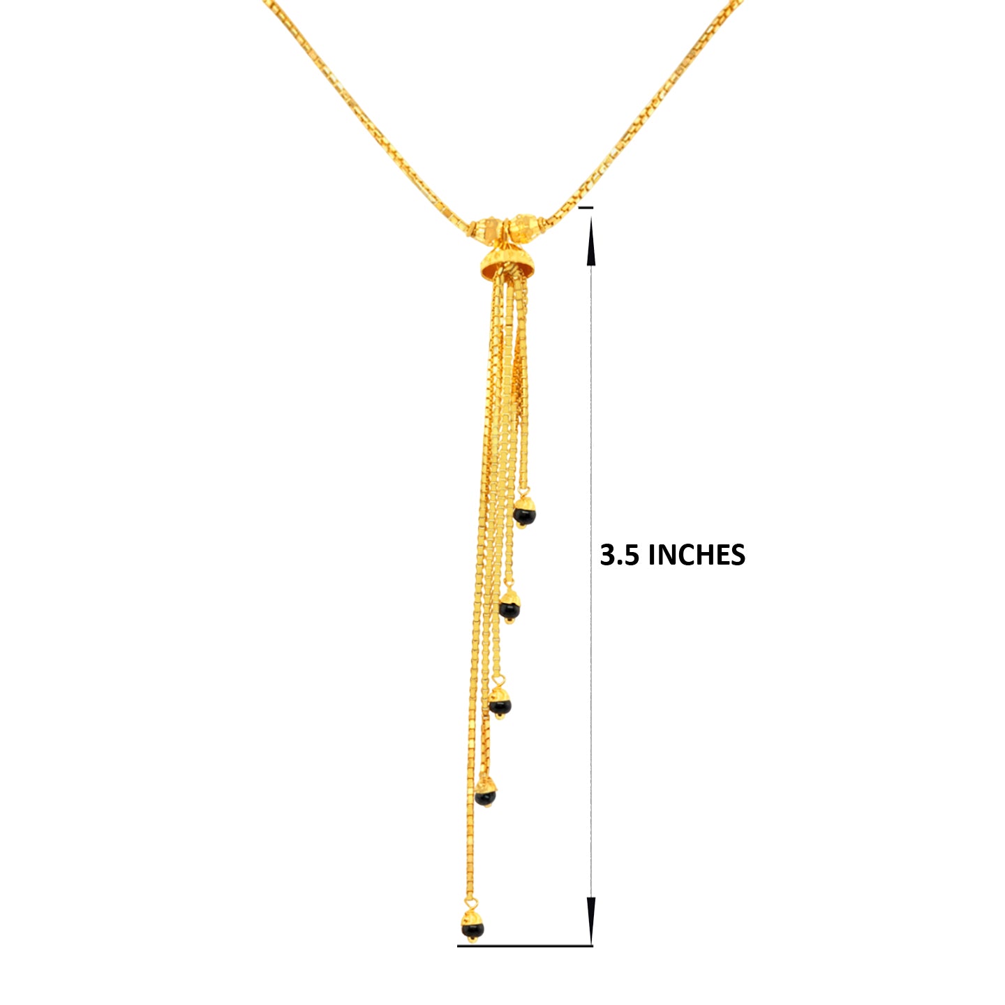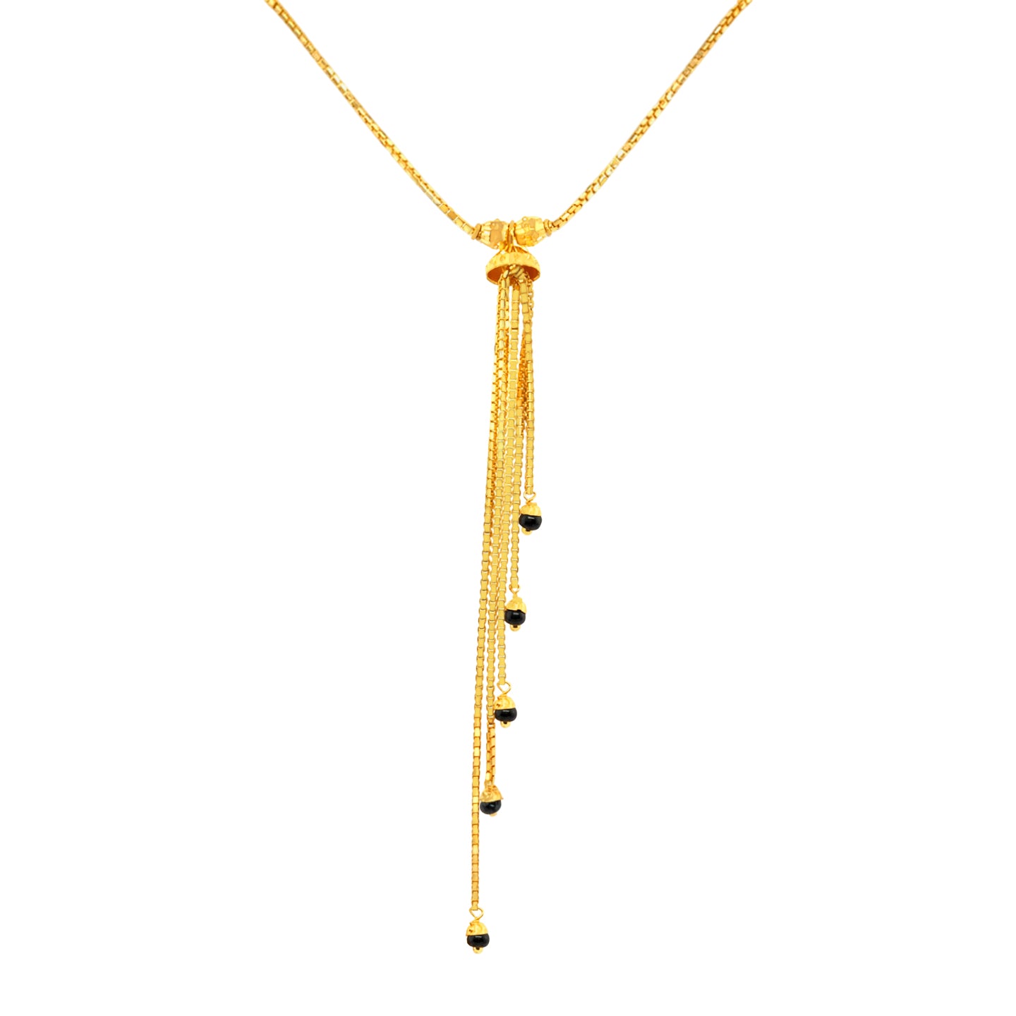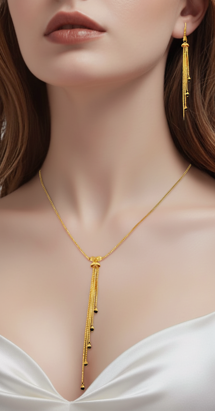 Beautiful 22k Gold Necklace and Earring Set featuring dangling black beads. Necklace measures 16 inches and features an eye-catching pendant measuring 3.5 inches in length. Long, dangling hook earrings measure 100mm in length.