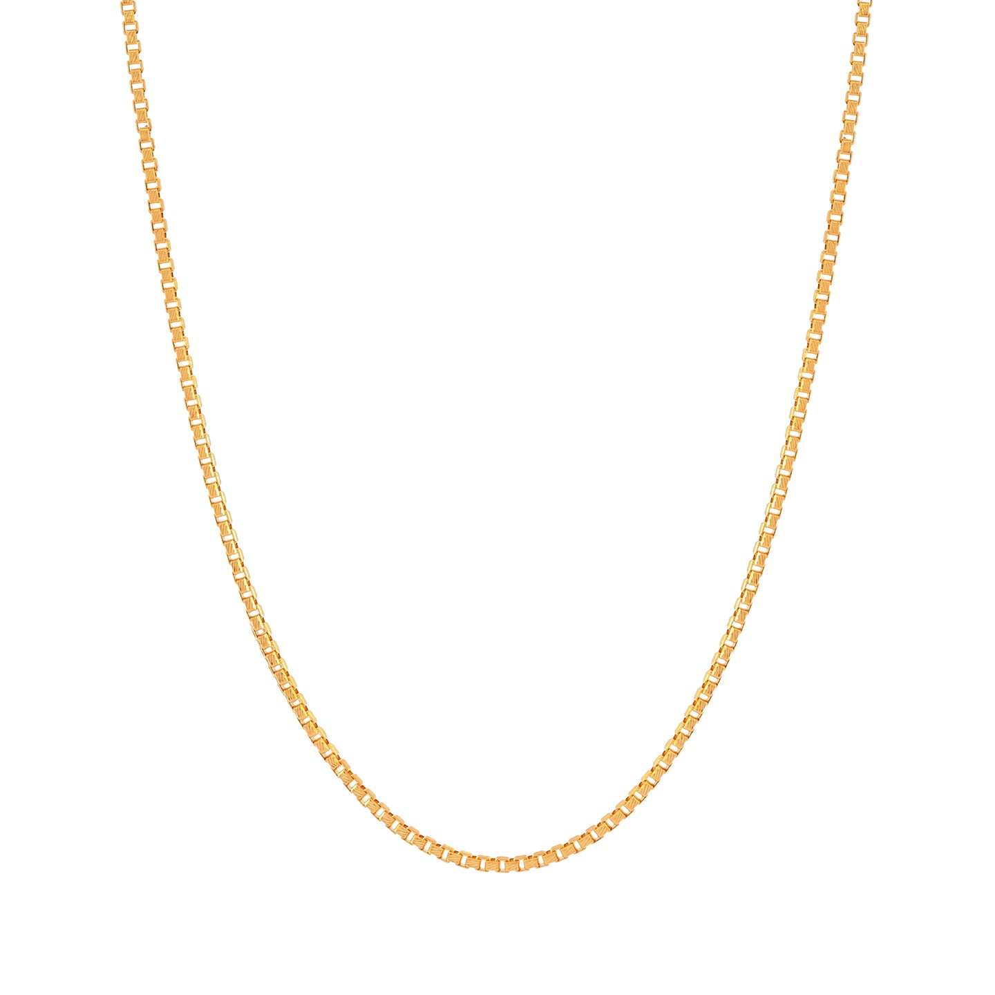 22k gold box chain in 18 inches. Solid gold chain with classic box design. Chain measures 1mm in thickness and features secure lobster clasp closure.