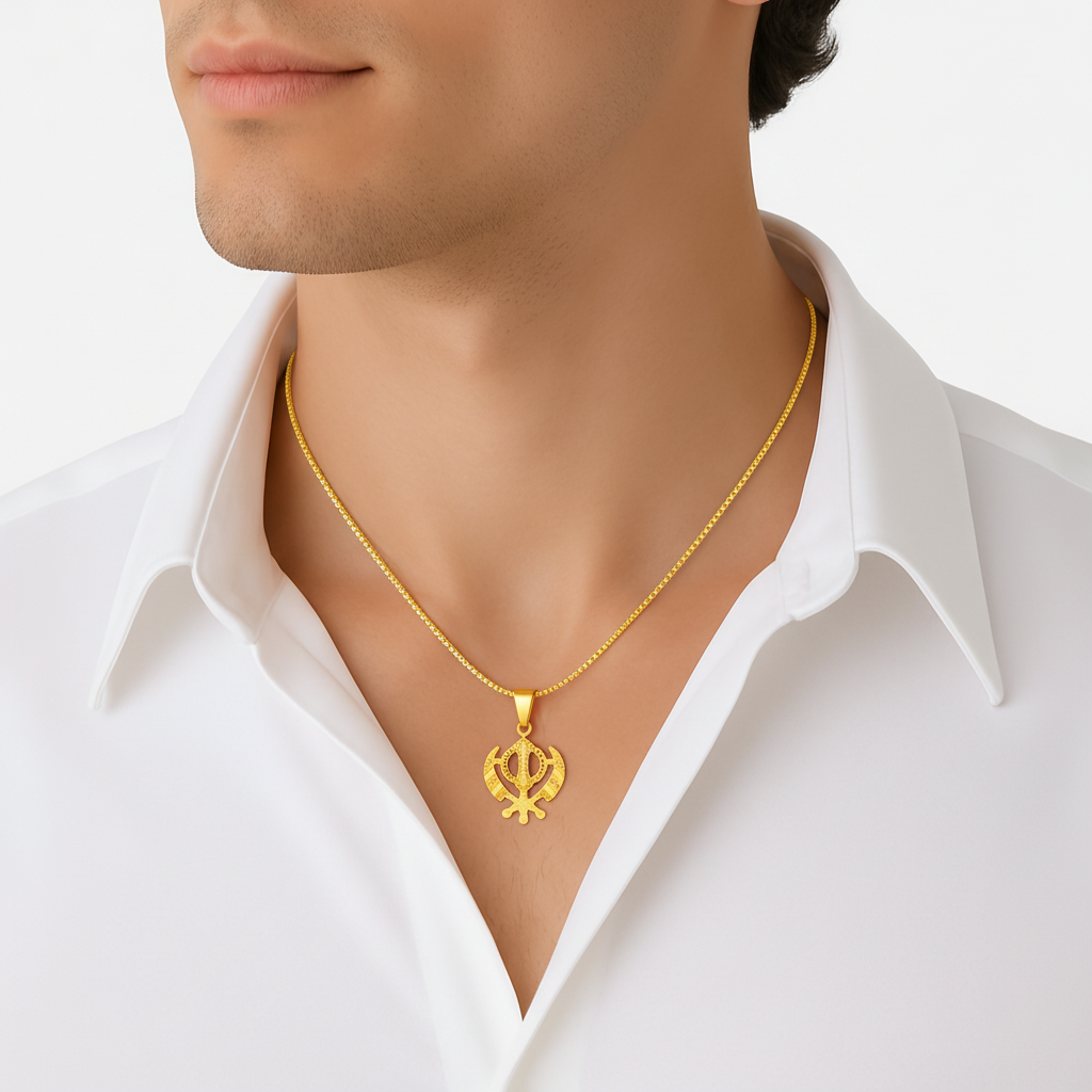 22k gold Khanda Sikh pendant with intricate laser cut design. Pendant measures 32mm in length and 21mm in width. Chain not included. Pendant bale can accomodate a 3mm chain.