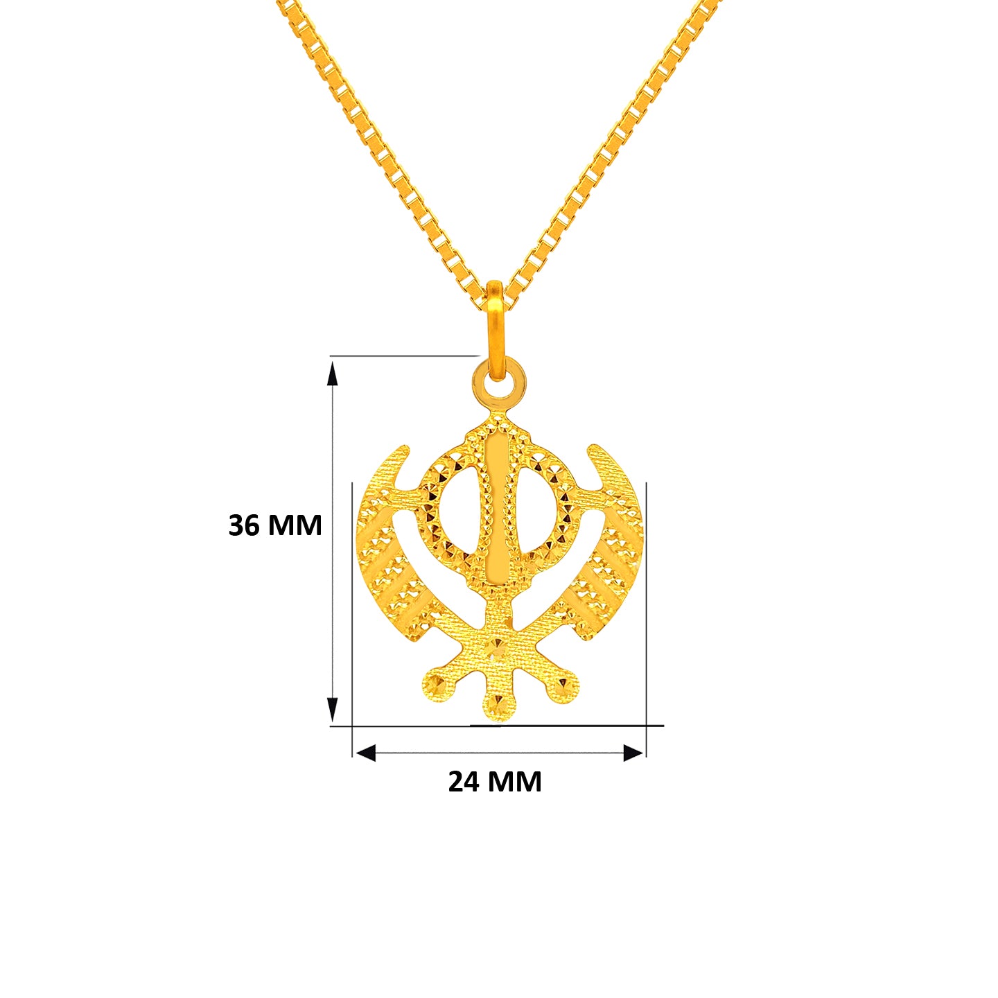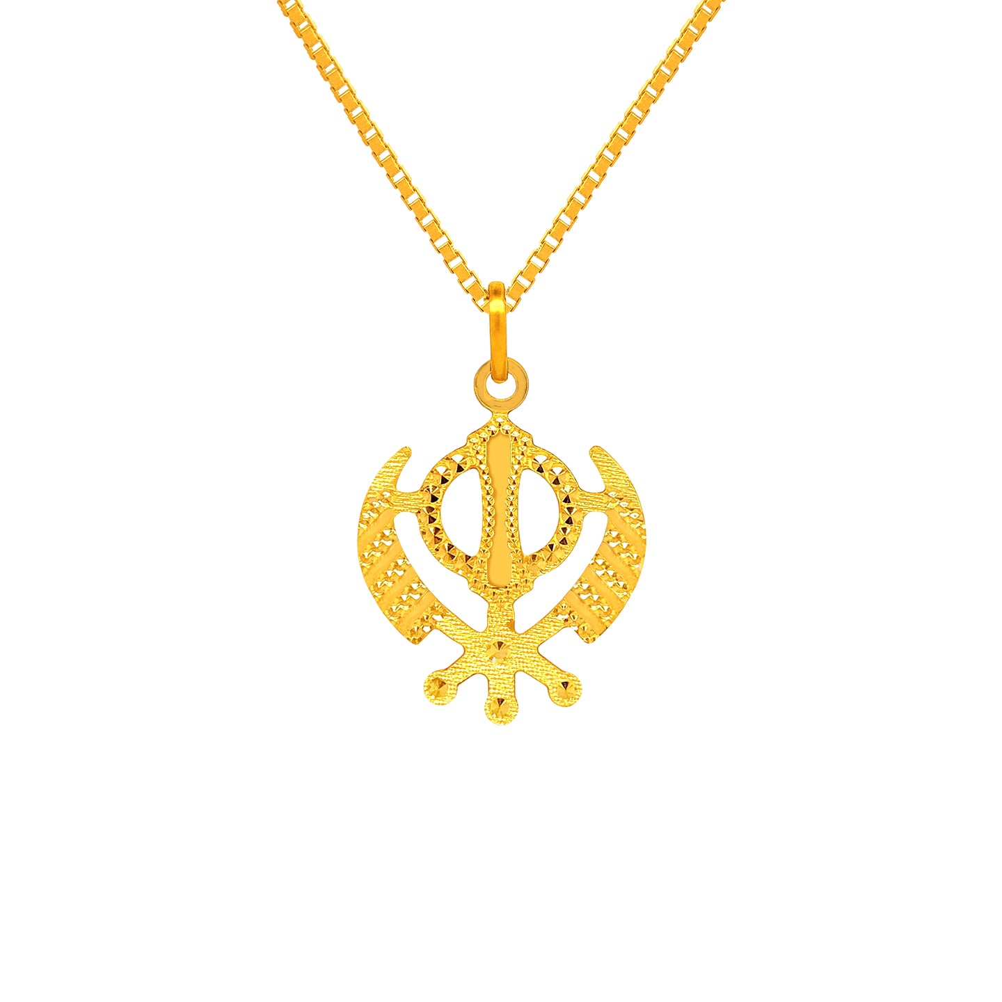 22k gold Khanda Sikh pendant with intricate laser cut design. Pendant measures 36mm in length and 24mm in width. Chain not included. Pendant bale can accomodate a 3mm chain.