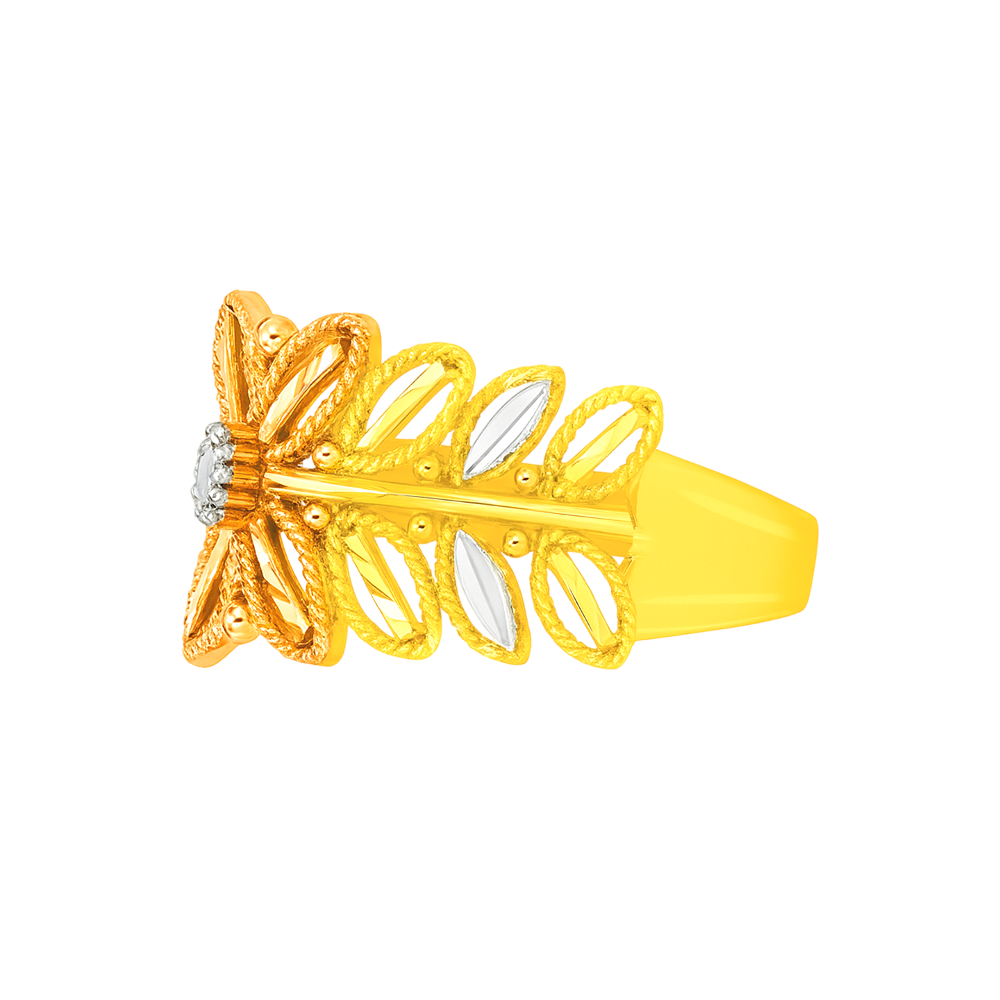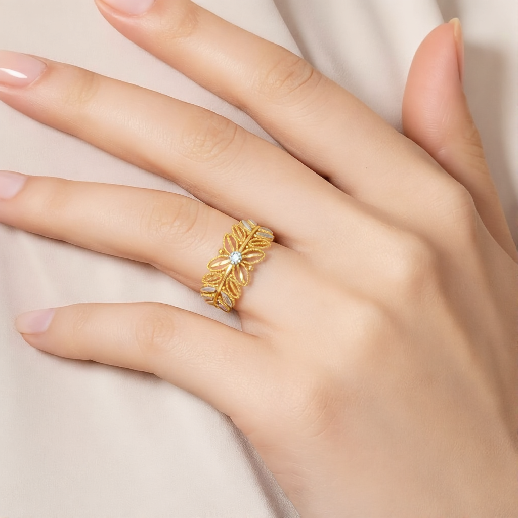 22k three tone gold ring with beautiful flower design. Ring measures 10mm in height and is size 6.5.