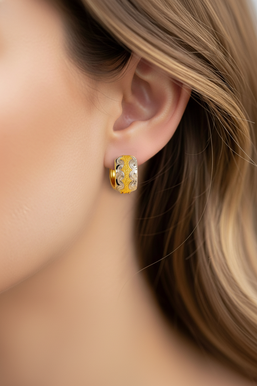 22k two tone gold huggie earrings with exquisite laser cut design. Earrings measure 13mm in total length and 8mm in width.