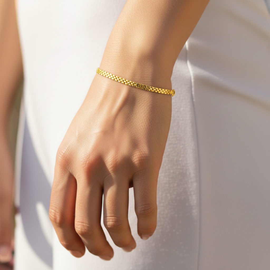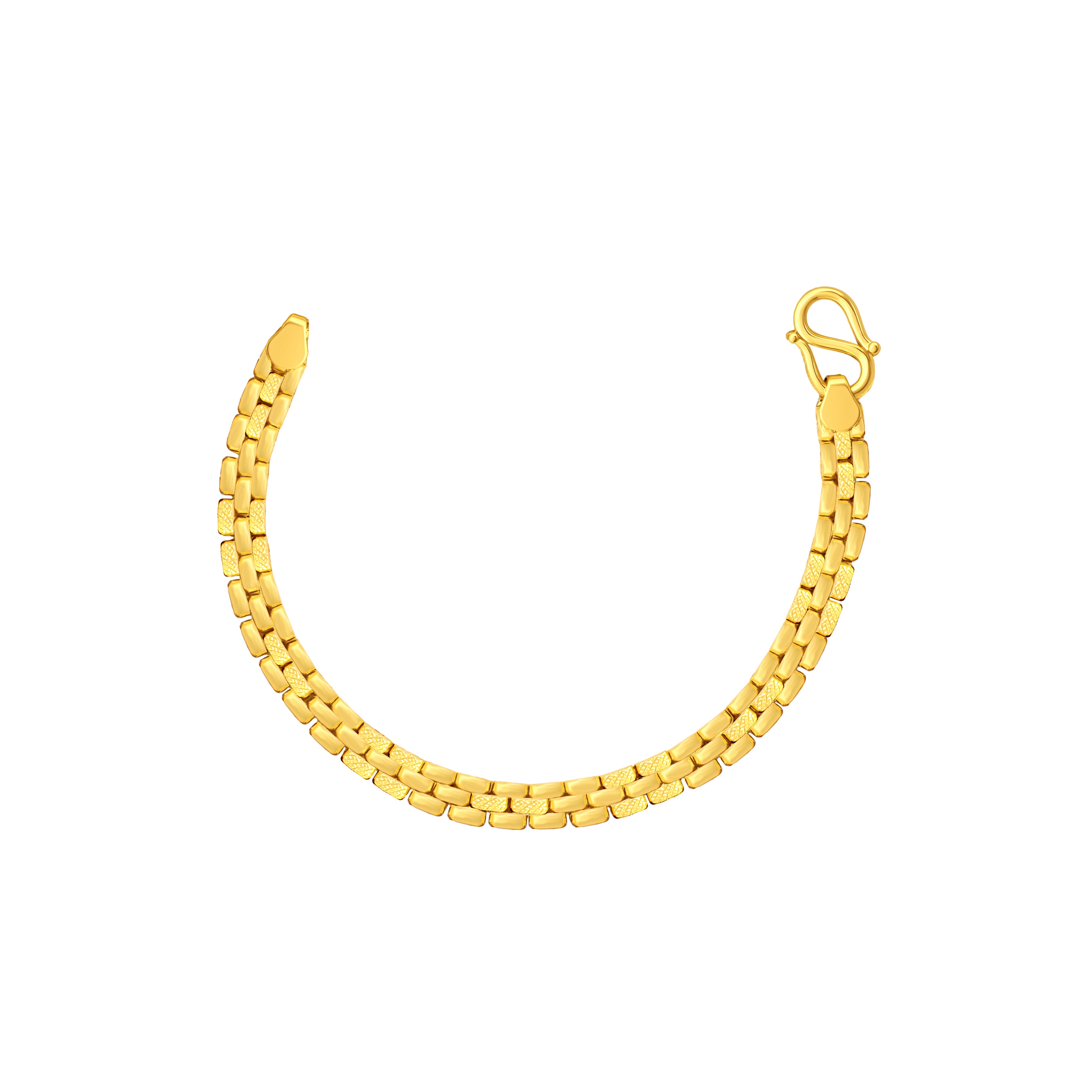 22k gold baby bracelet with weaved design. Bracelet measures 4.5 inches in length with S-shaped closure. Bracelet thickness 4mm. Ideal for baby or children.
