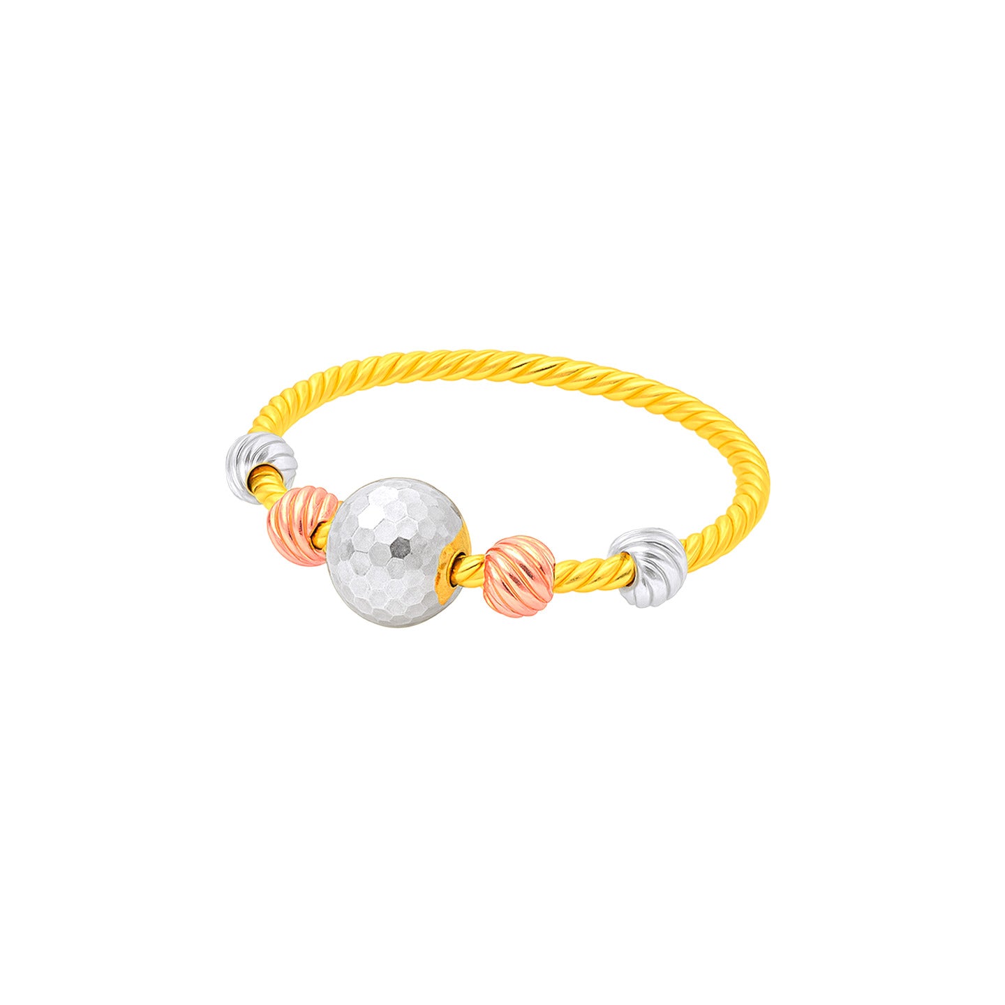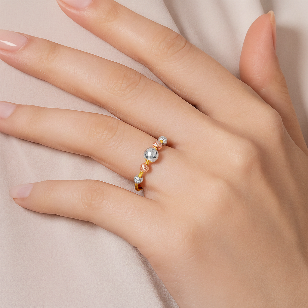 22k two tone delicate laser cut ring. Beads on ring spin slightly on the band. White gold, rose gold, and yelow gold. Size 4.5-5