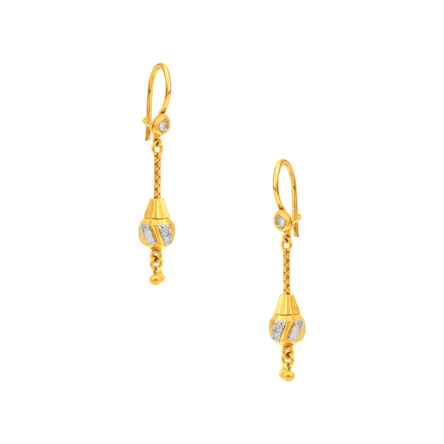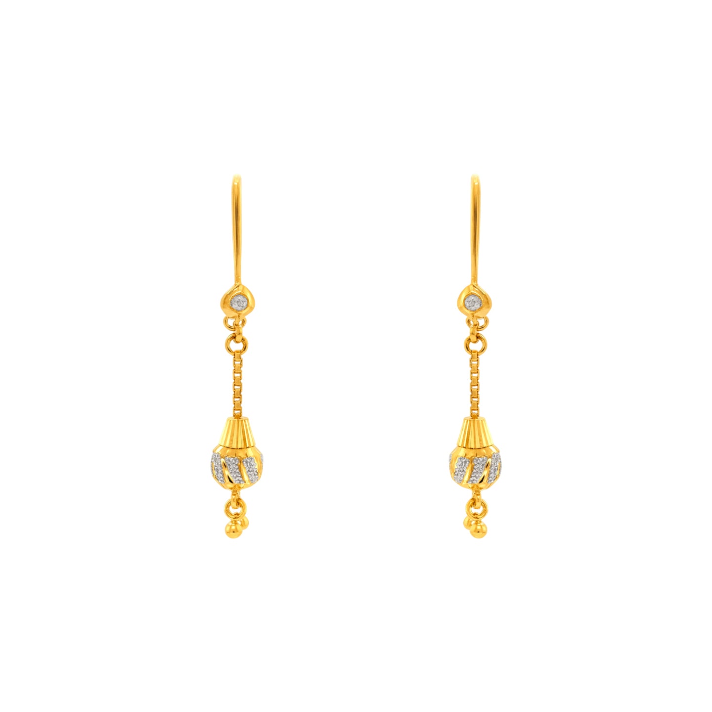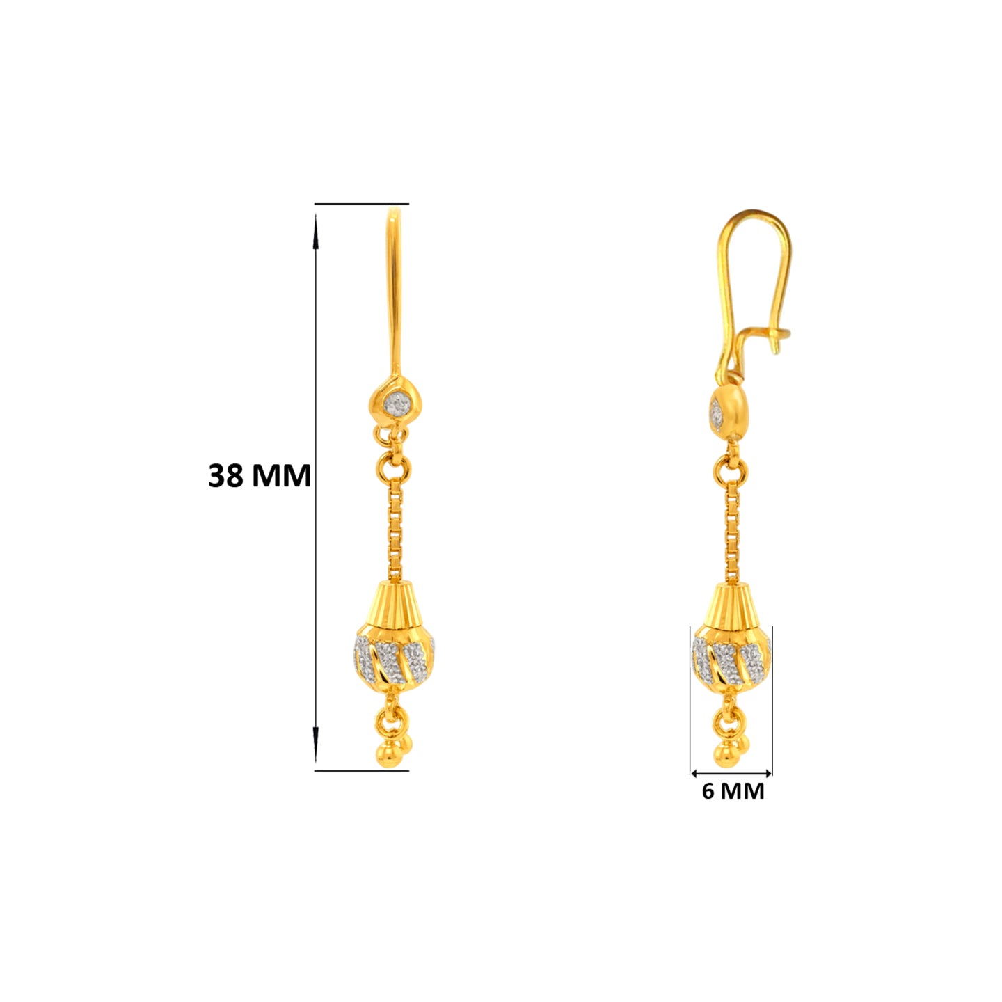 22k two tone hook earrings with heart and dangling charm design. These earrings measure 38mm long and 6mm wide.