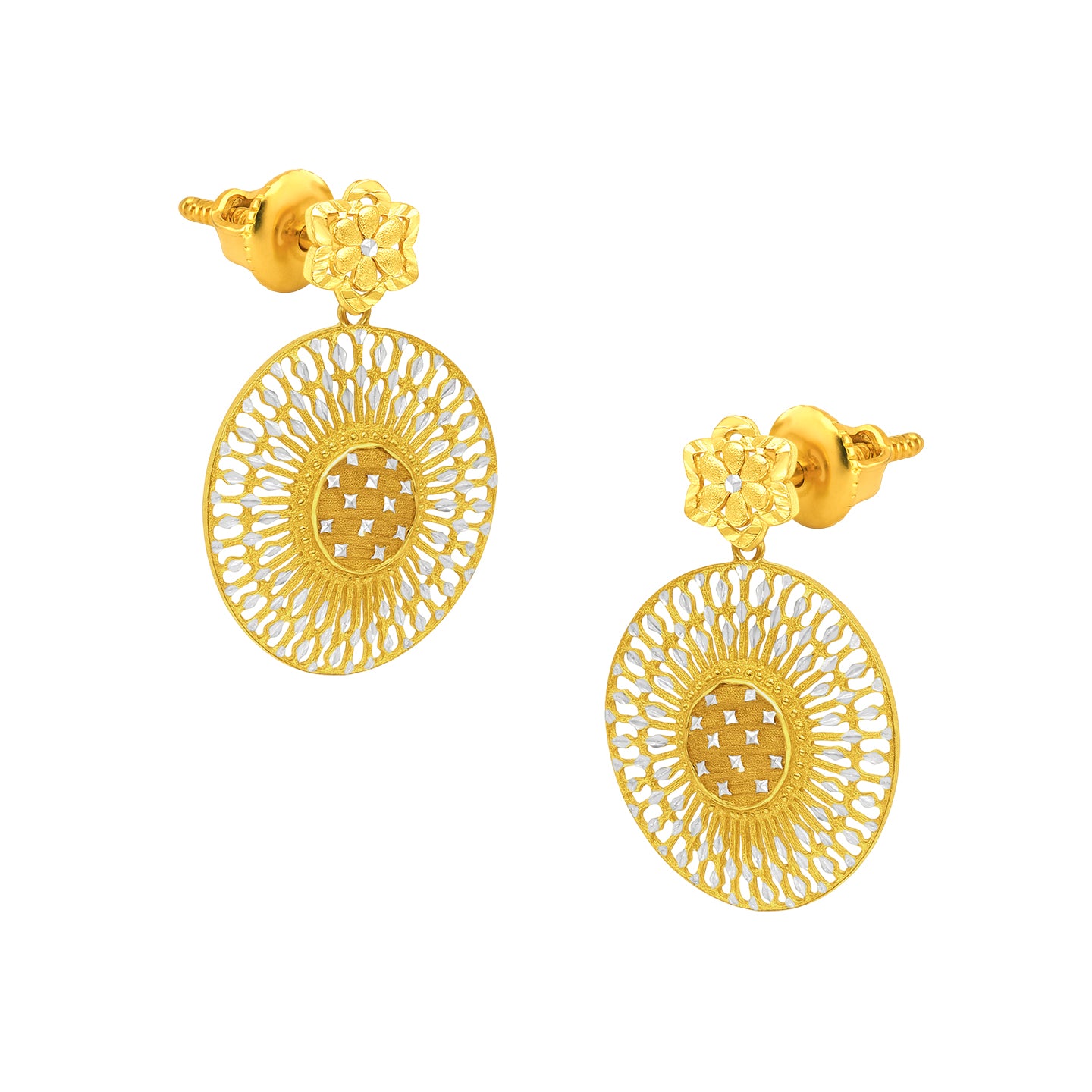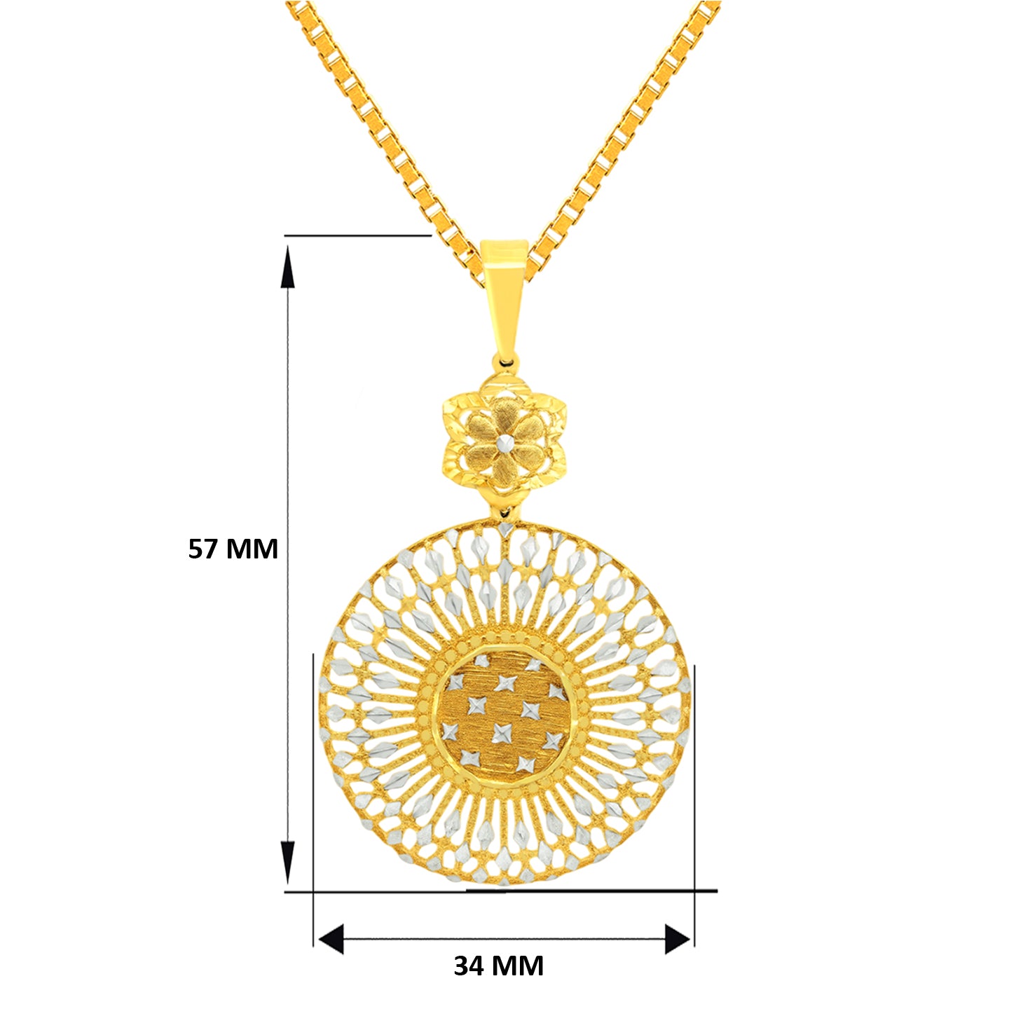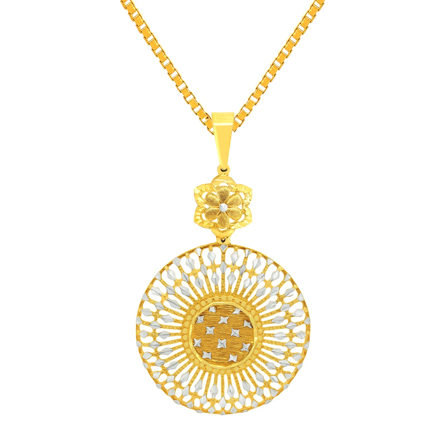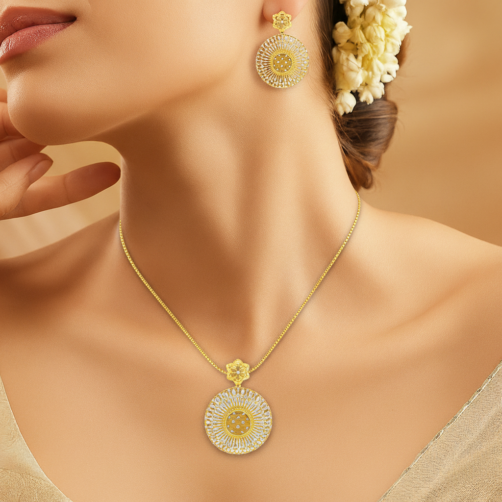 22k two tone gold pendant and earring set with modern laser cut disc design. Pendant measures 57mm L x 34mm W. Screwback earrings in accompanying design measure 40mm L x 25mm W. Bale can accomodate a 3mm chain. Chain not included.