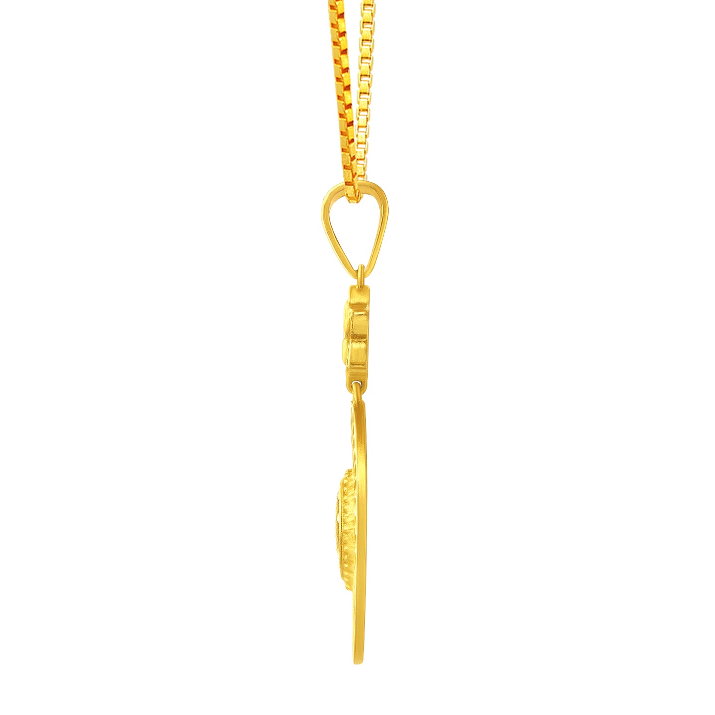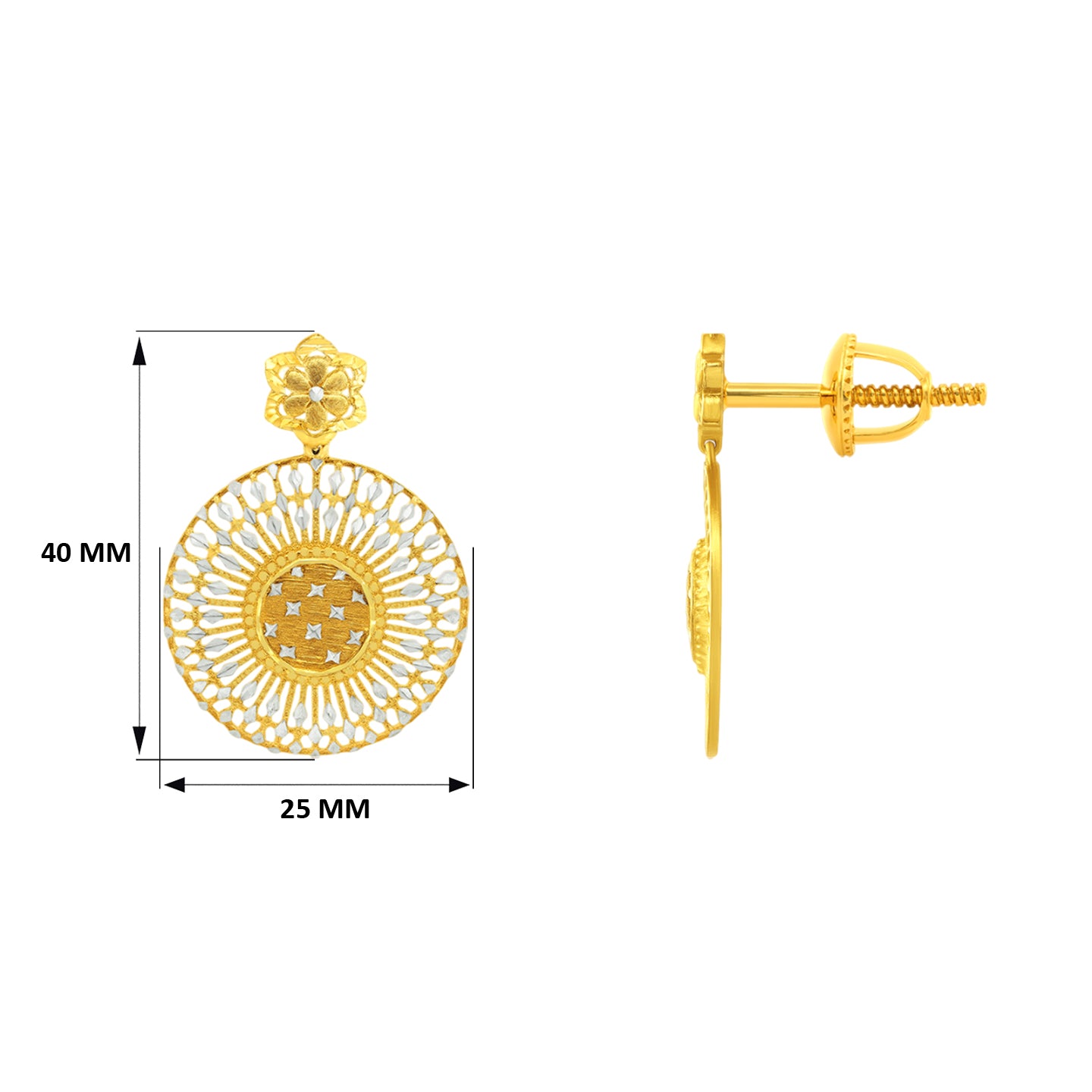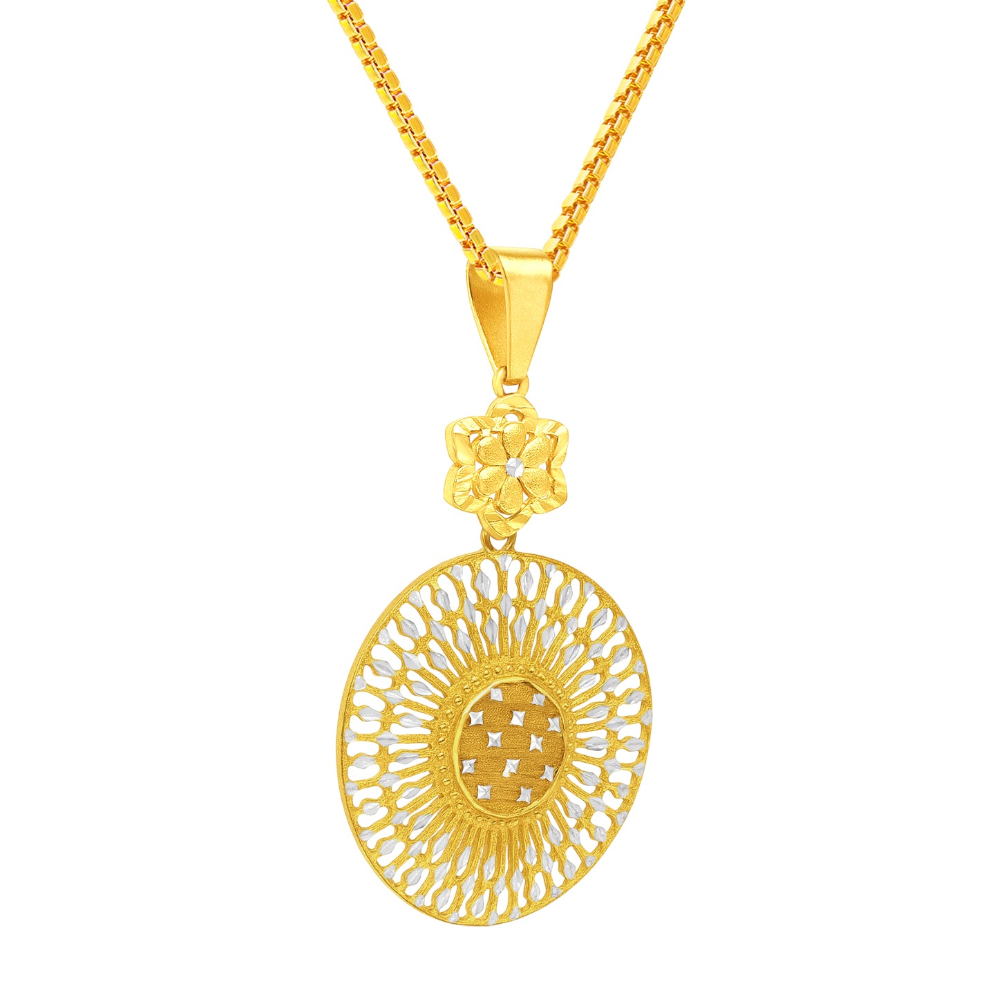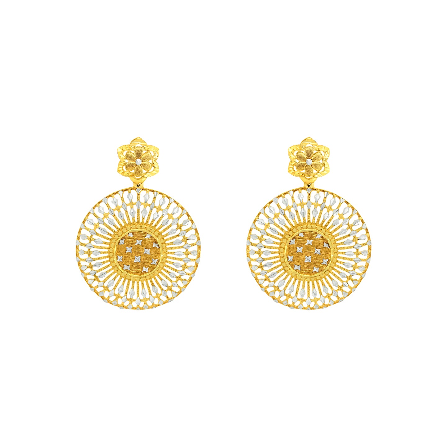22k two tone gold pendant and earring set with modern laser cut disc design. Pendant measures 57mm L x 34mm W. Screwback earrings in accompanying design measure 40mm L x 25mm W. Bale can accomodate a 3mm chain. Chain not included.