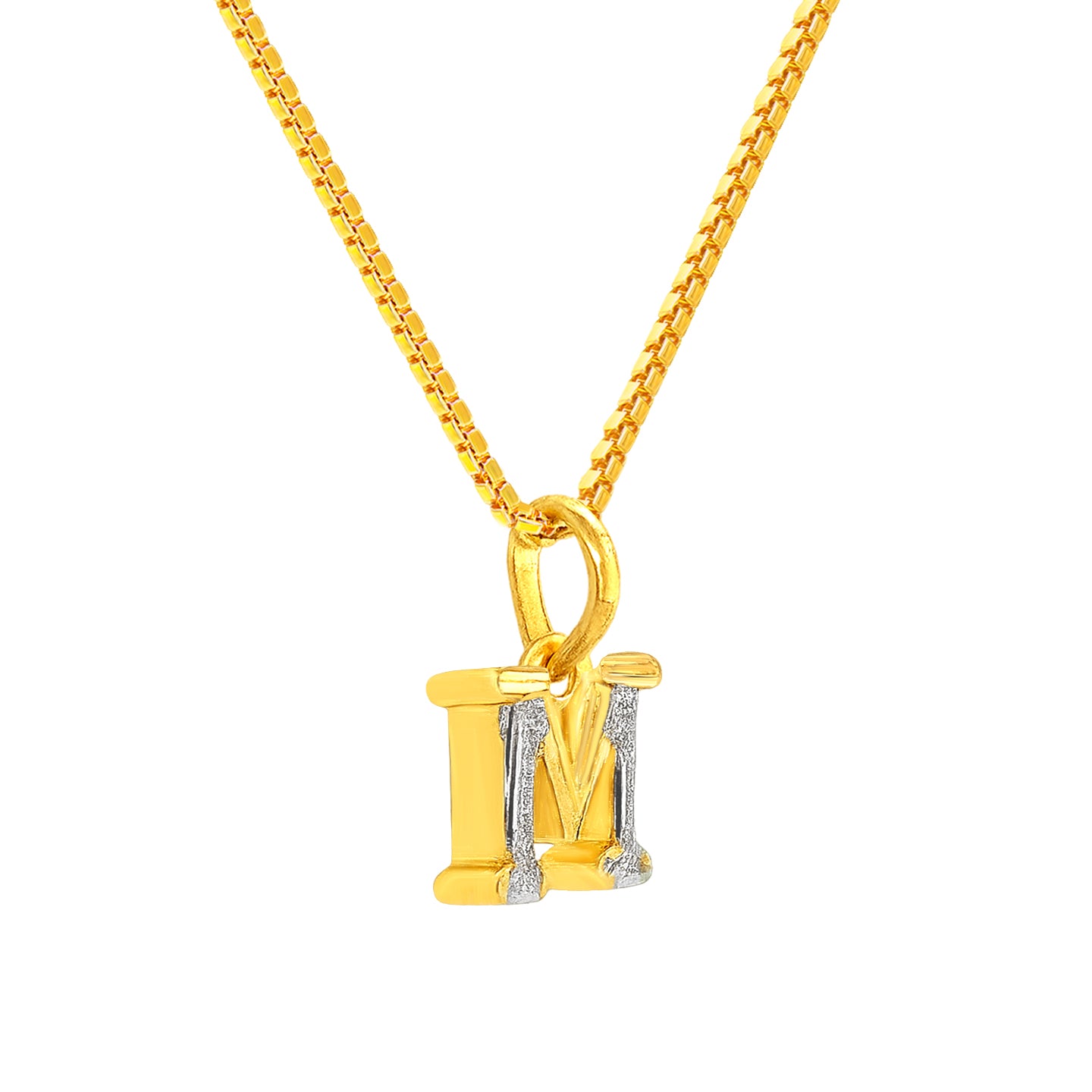 22k two tone gold pendant with initial "M." Pendant measures 17mm in length and 9mm in width. Pendant can fit chain up to 3mm in thickness. Pendant only, no chain included.