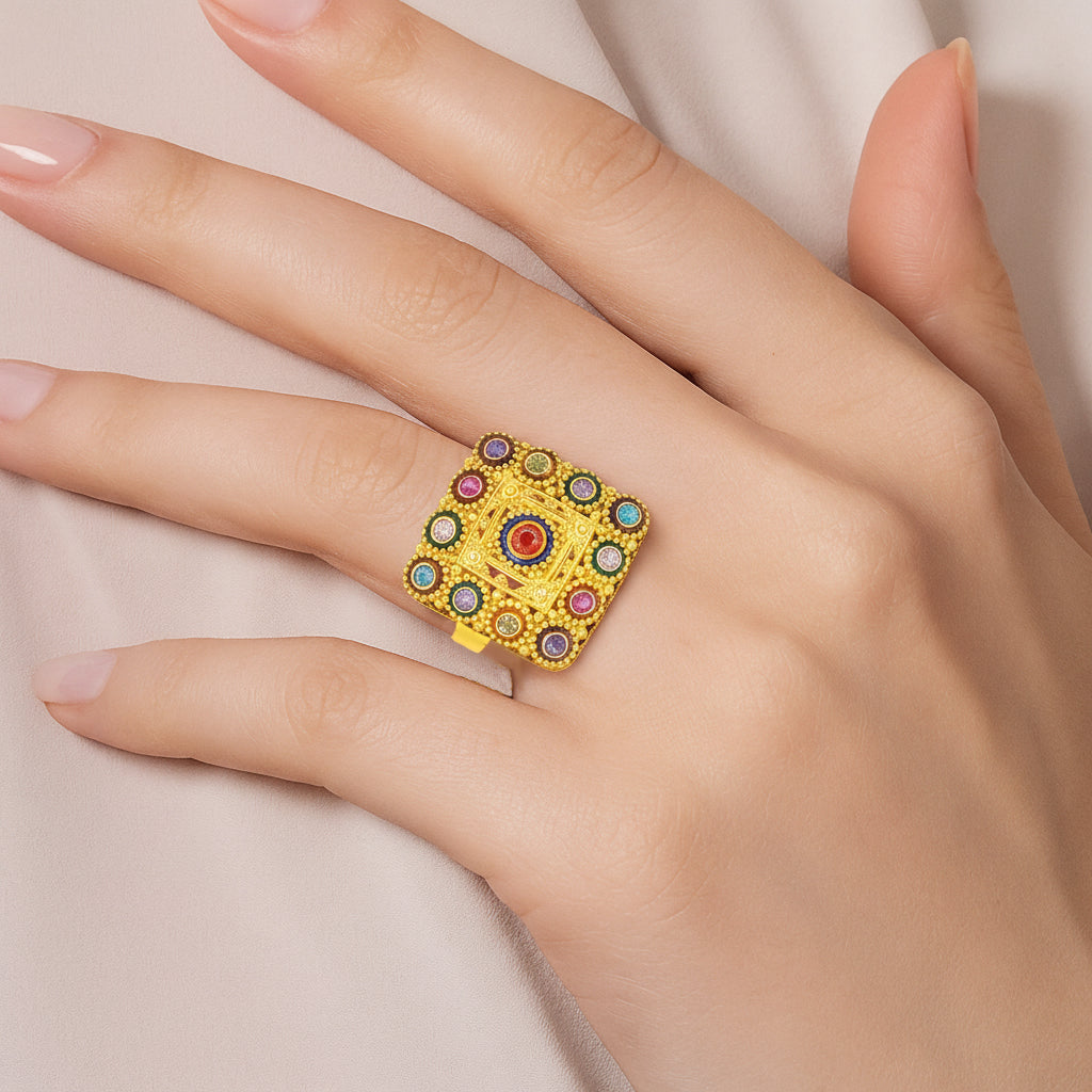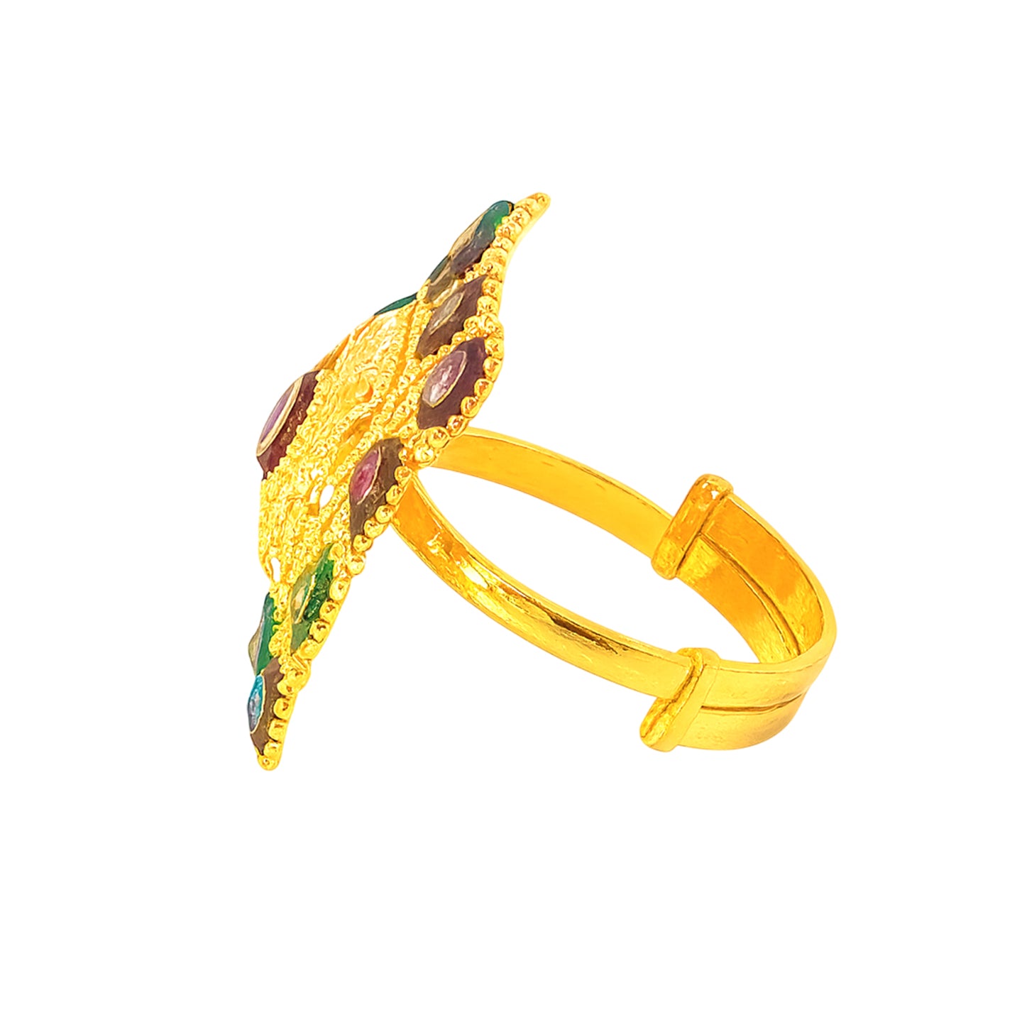 22k Yellow Assorted Stones Large Fancy Ring measuring 7. Total gold weight is approximately 7.68g.