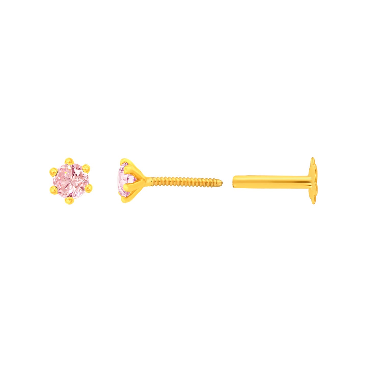 22K Yellow Gold Assorted Small Pink Nose Pin with Screwback measuring 3.5mm width. Total gold weight is approximately 0.21g. For health and safety reasons, nose pins and nose rings CANNOT BE exchanged or returned once purchased.