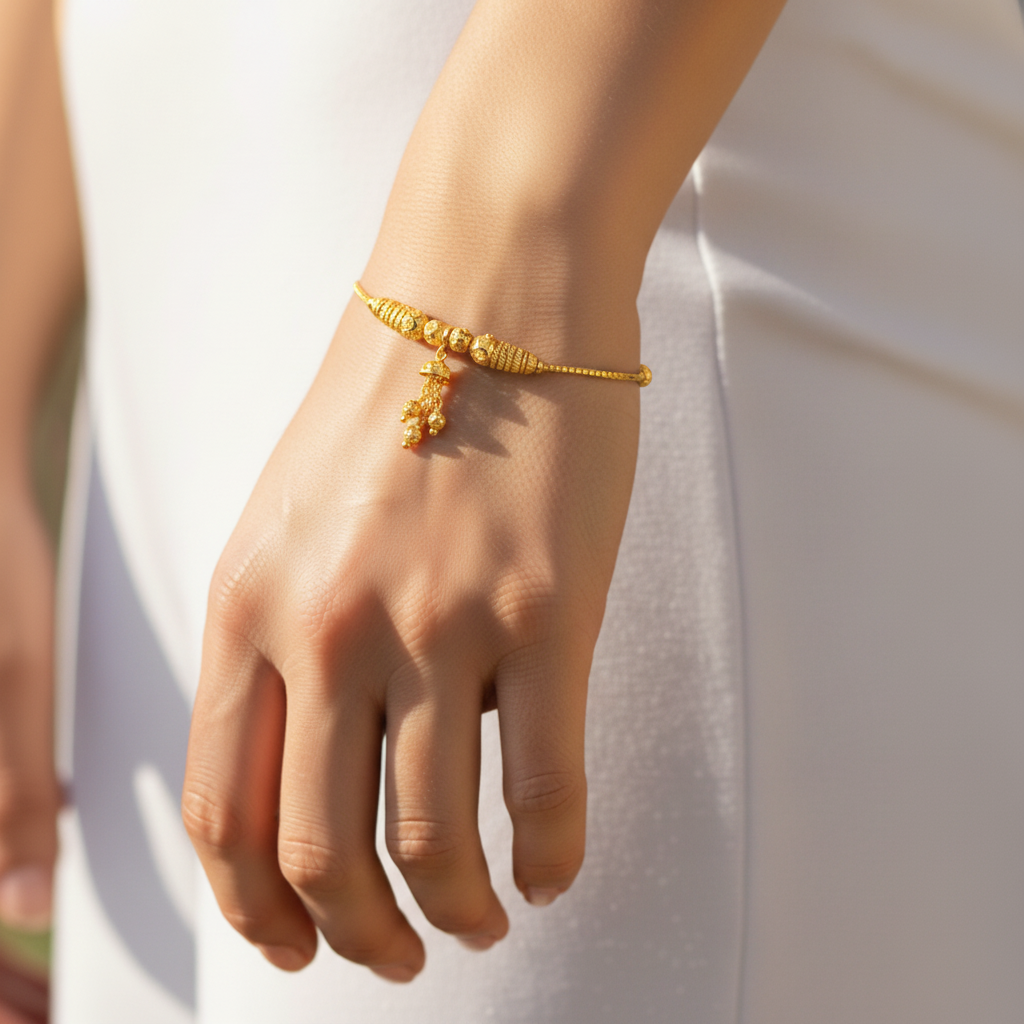 22k Yellow Gold Charm Ball-Bead Bracelet measuring 5mm thickness x 7.5 inch length.