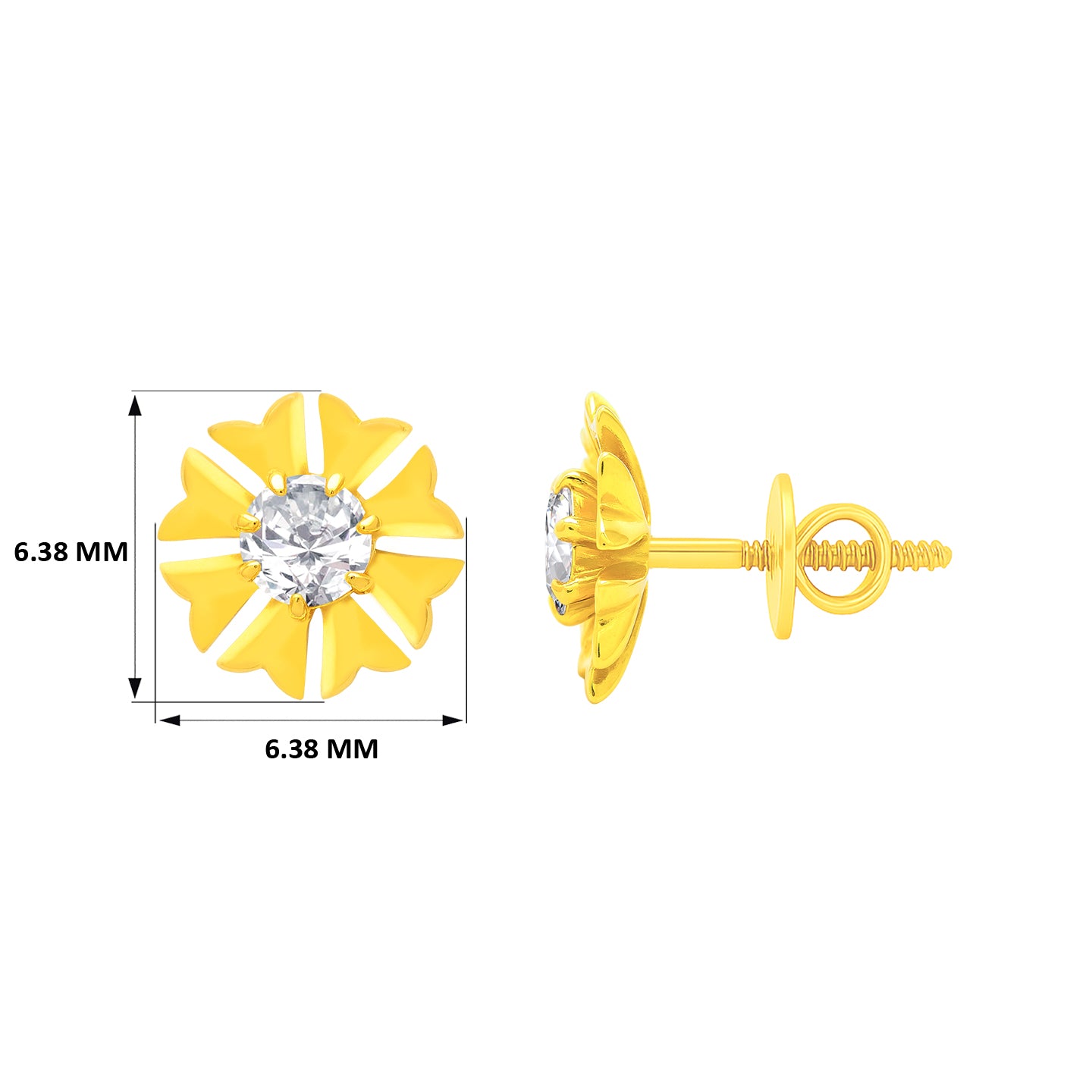 22k Yellow Gold Cubic Zirconia Floral Stud Earrings measuring 6.78mm length x 6.78mm width. Total gold weight is approximately 0.783g.