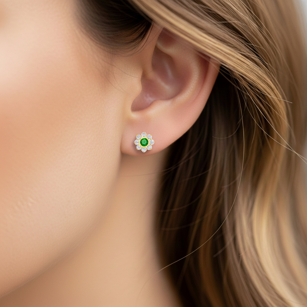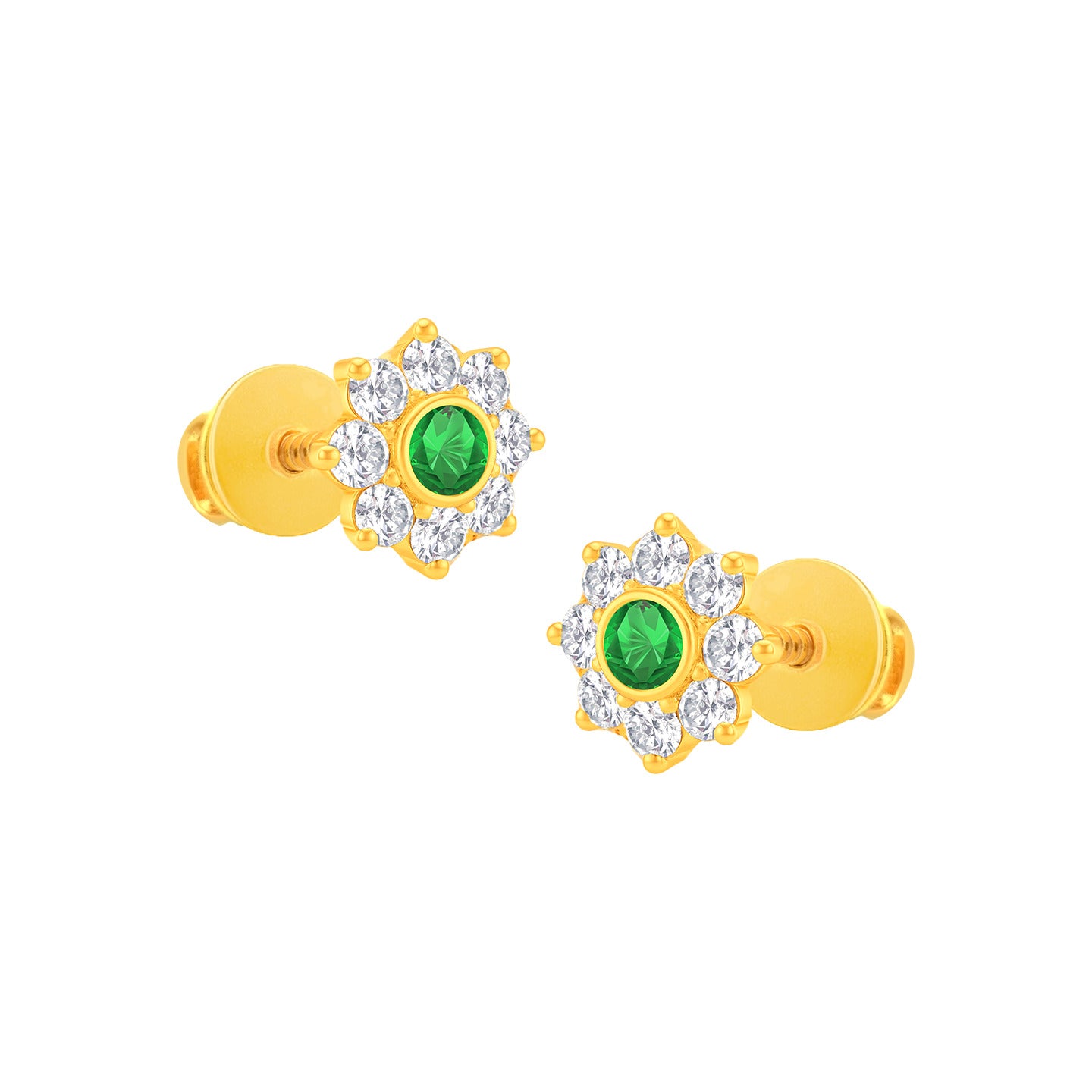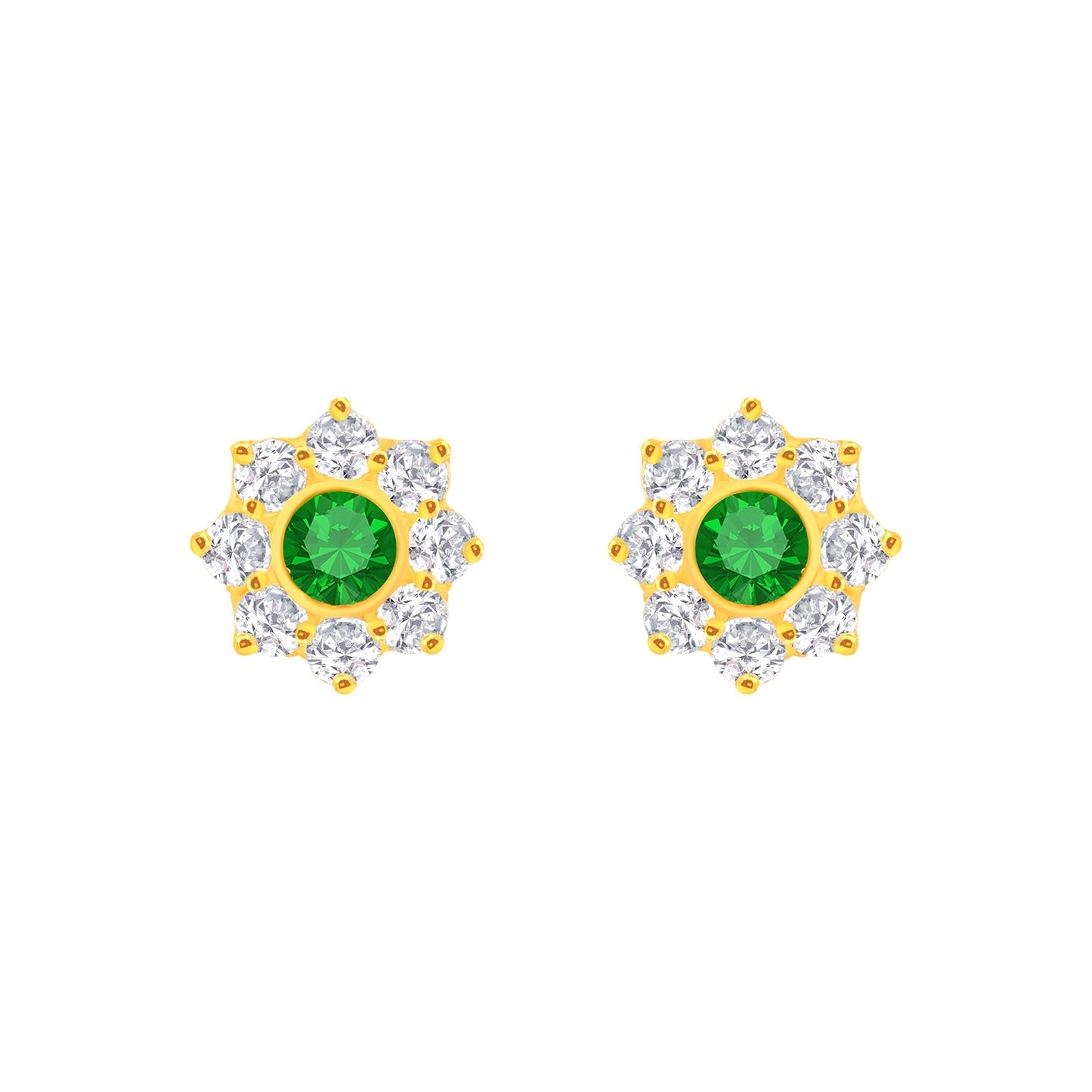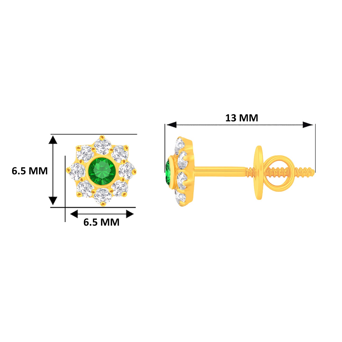 22k Yellow Gold Cubic Zirconia Green Sparkle Stud Earrings measuring 6.57mm length x 6.57mm width. Total gold weight is approximately 1.103g.